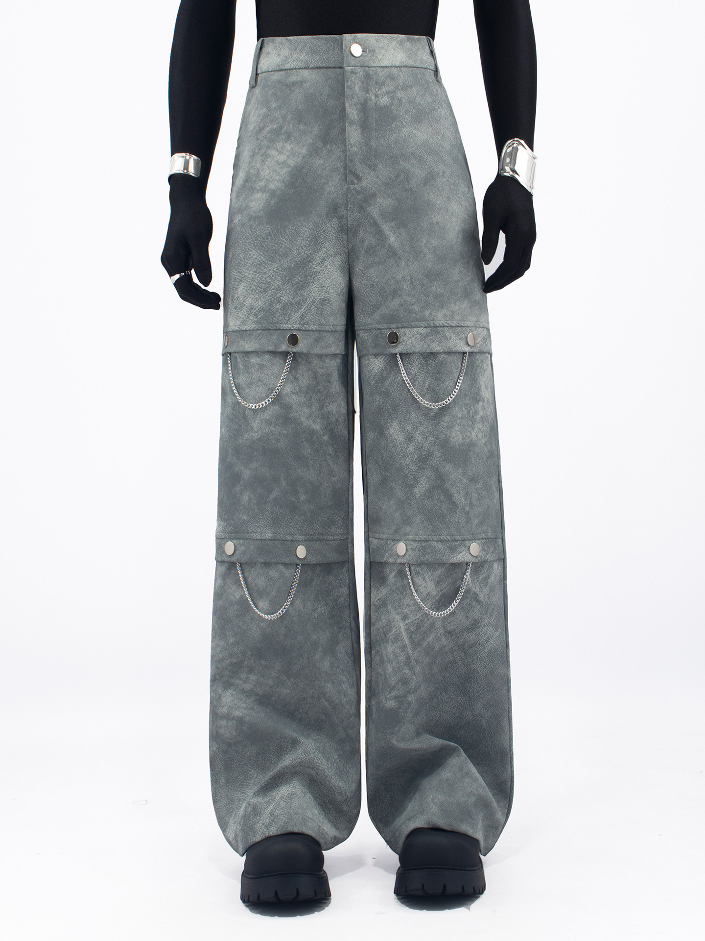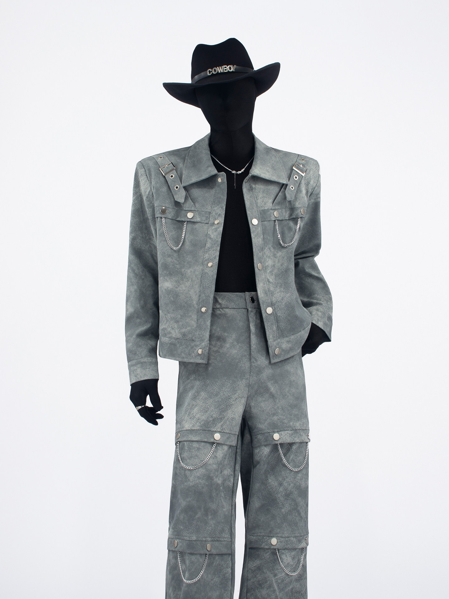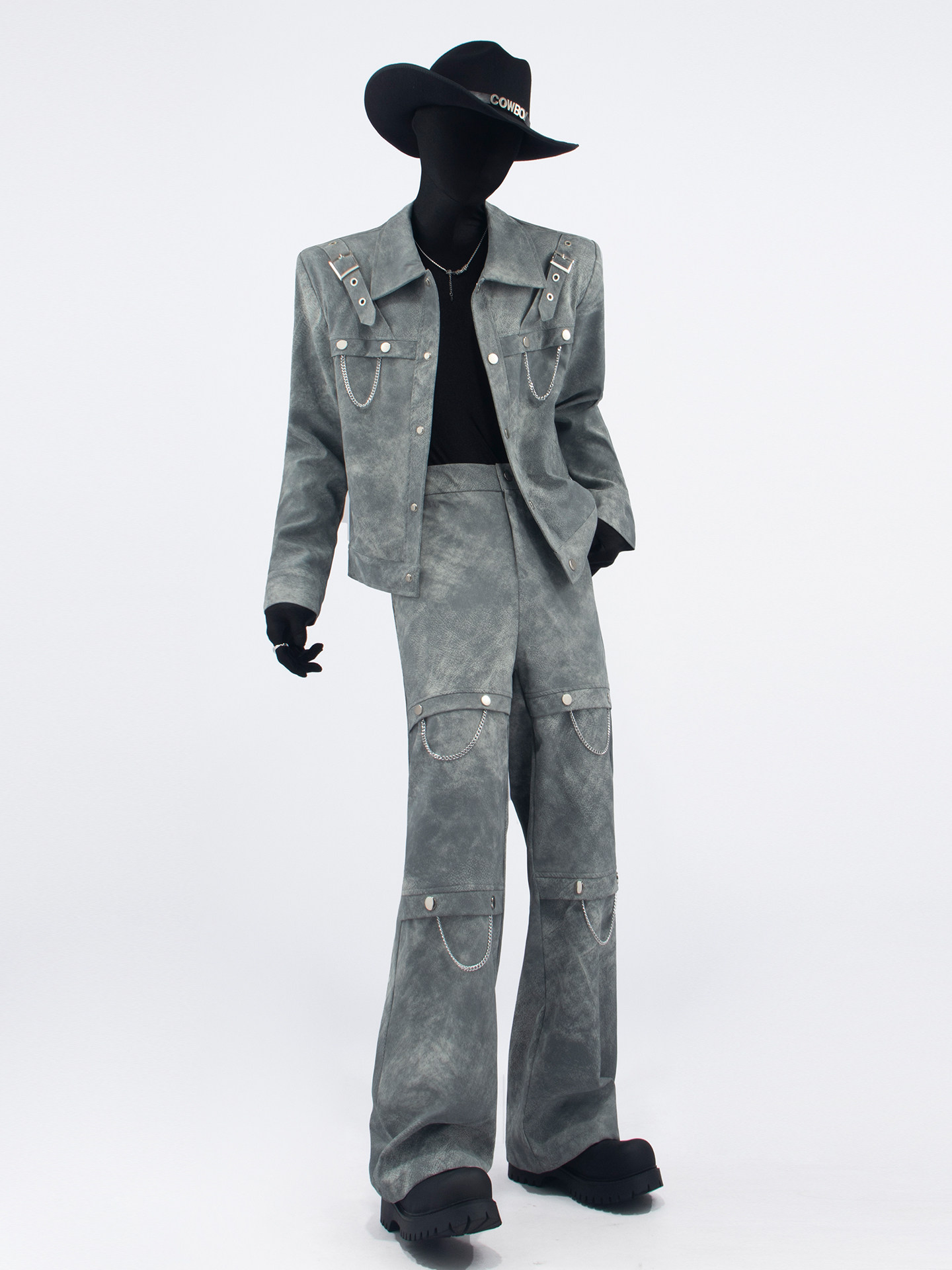 Chain Decor PU Leather Short Jacket & Wide Leg PU Leather Pants Setup WN23678
