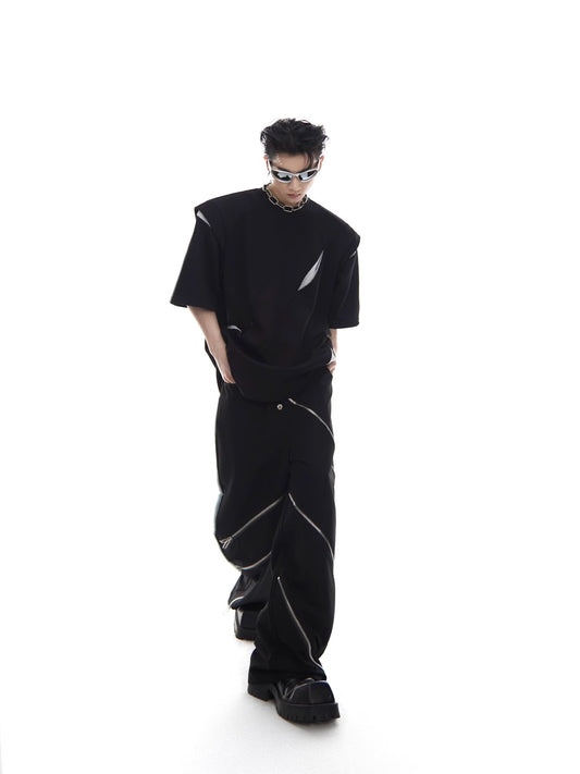 Shoulder Pads Short Sleeve Patchwork Design T-shirt WN6995