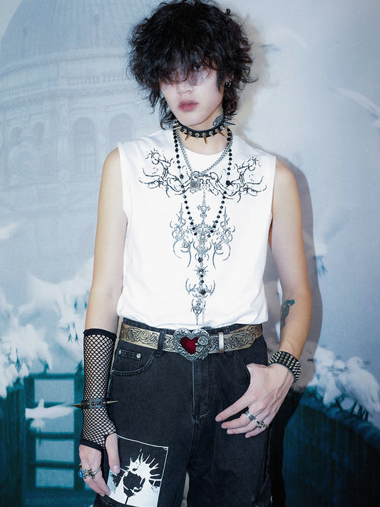 Hand-Drawn Design Rhinestone Detail Sleeveless T-Shirt WN16062