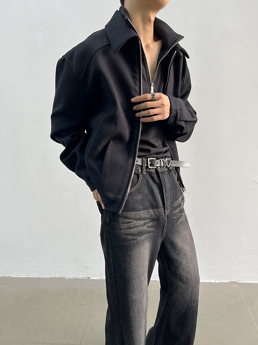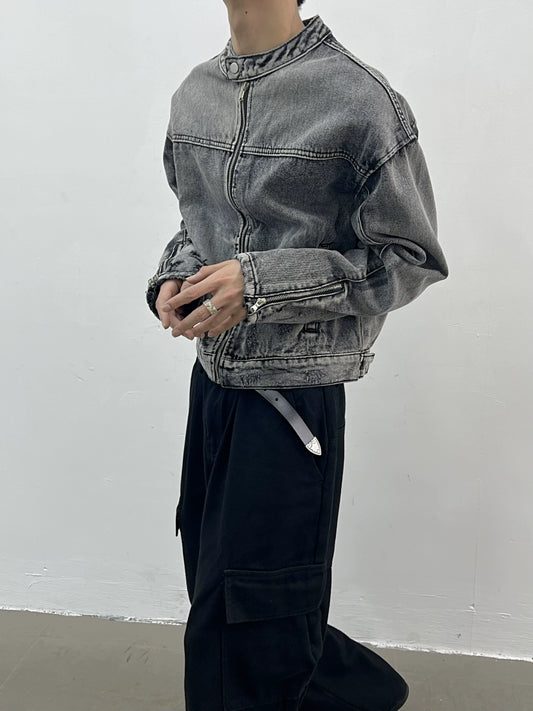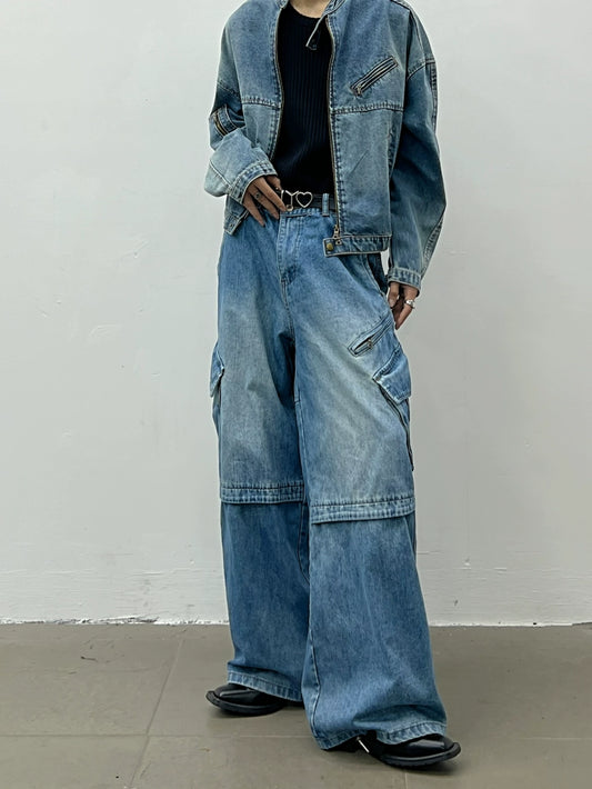 Standing-collar Short Denim Jacket & Wide-leg Cargo Denim Jeans Setup WN5026