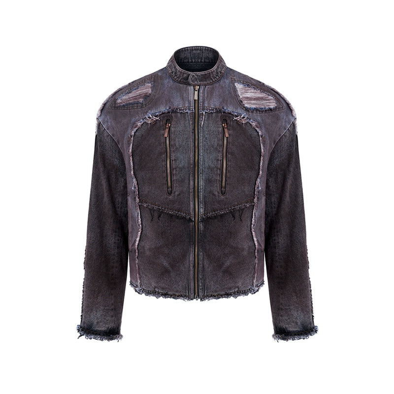 Damage Fringe Padded Denim Jacket & Wide-Leg Straight Denim Jeans Setup WN10193