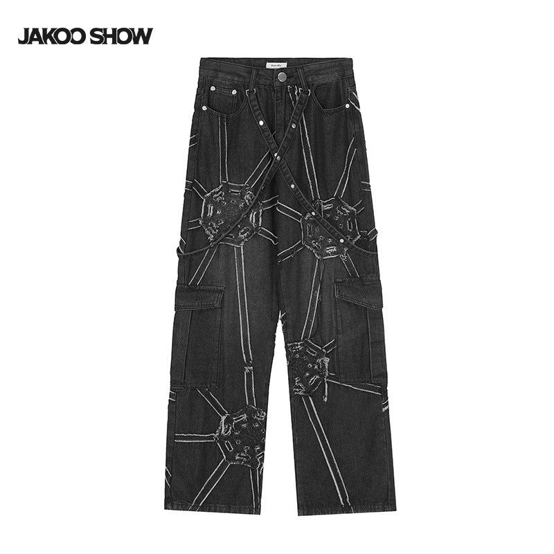 Spider Web Strap Design Washed Cargo Denim Jeans WN12700