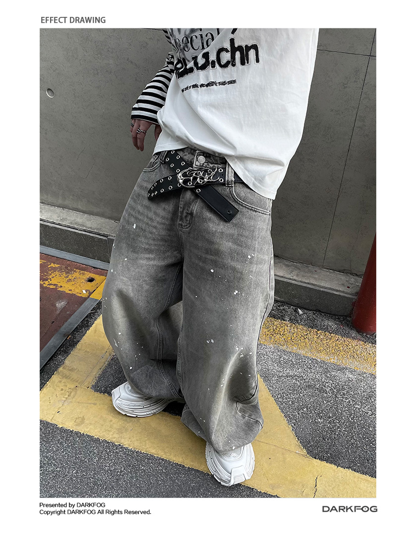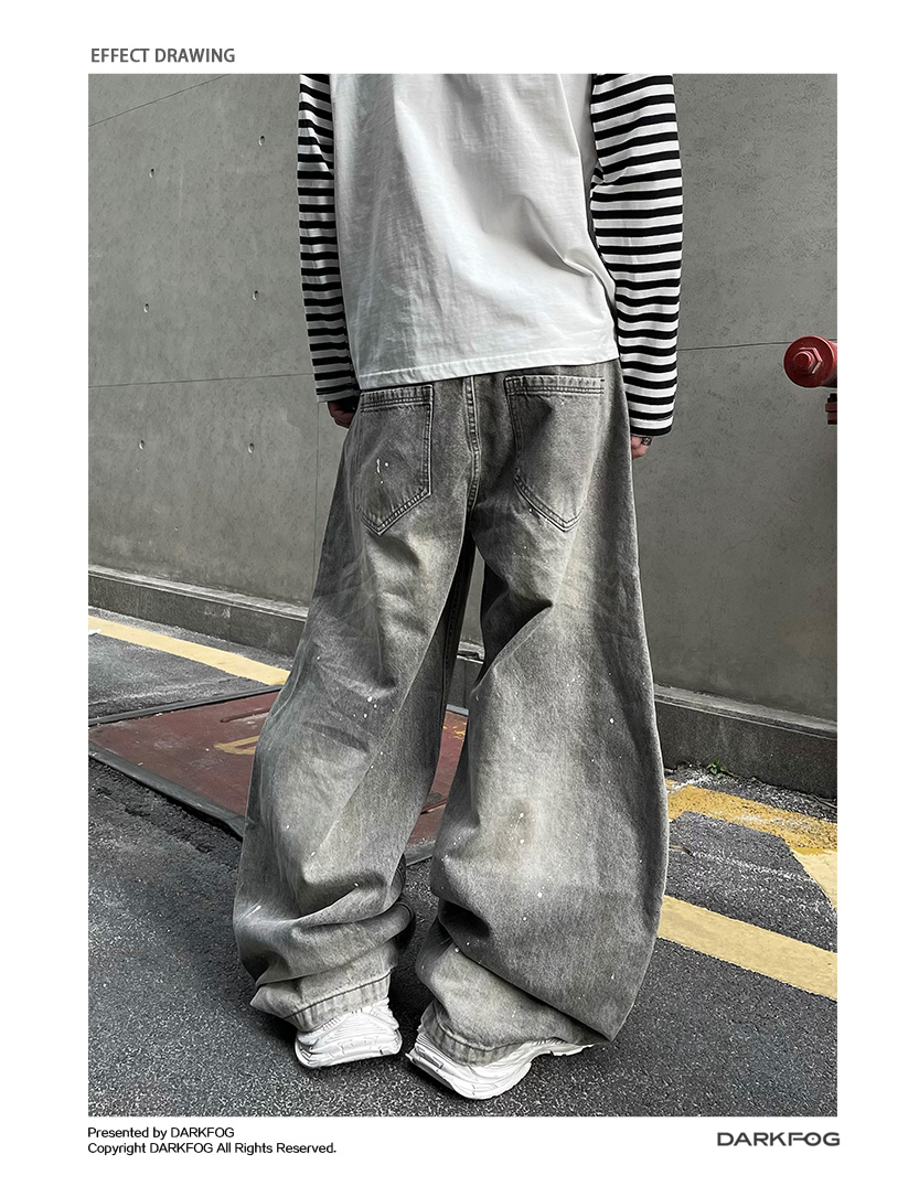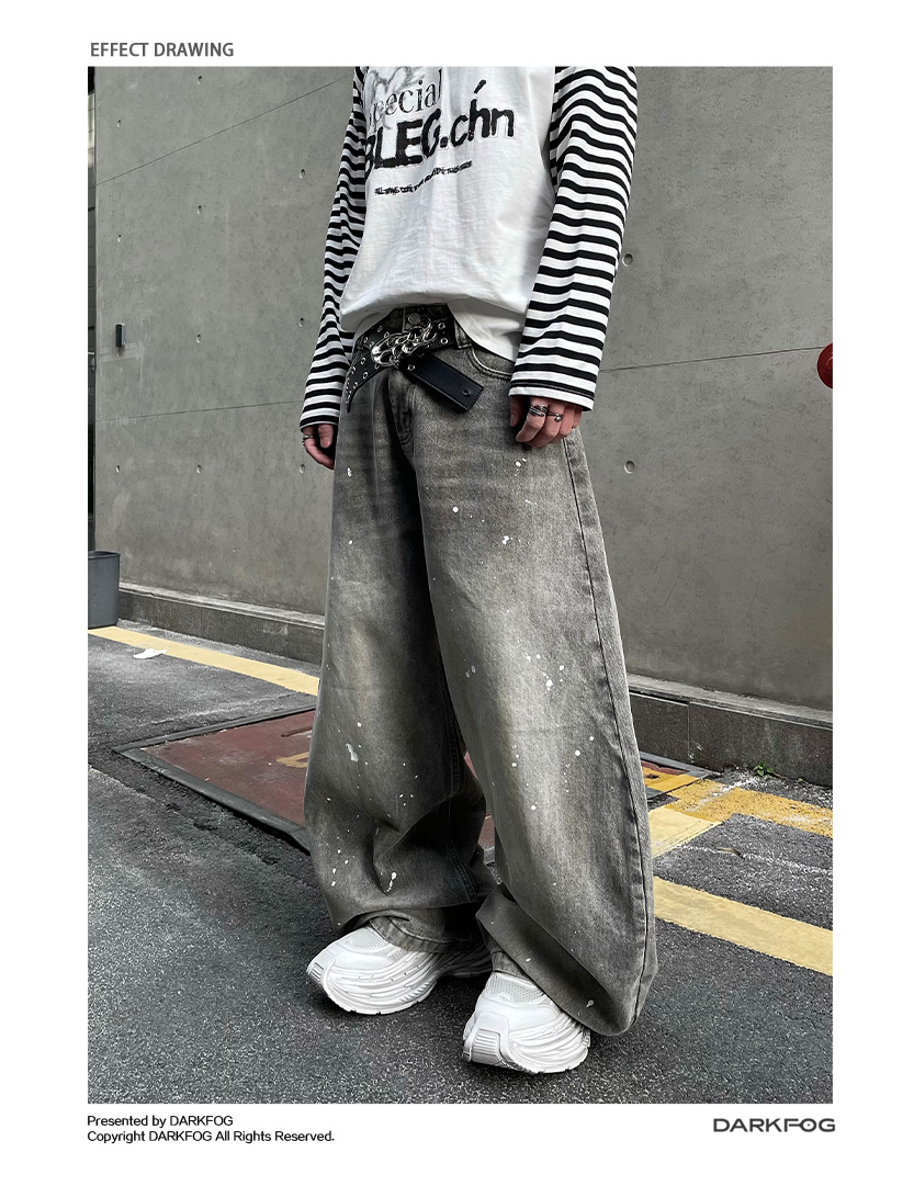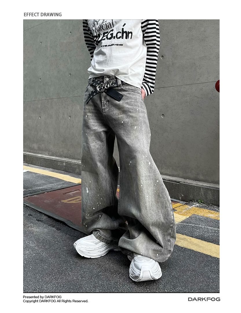 Washed Ink-Splatter Gray Curved Wide-Leg Denim Jeans WN12870