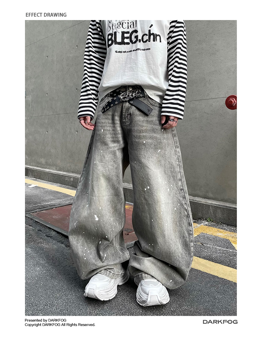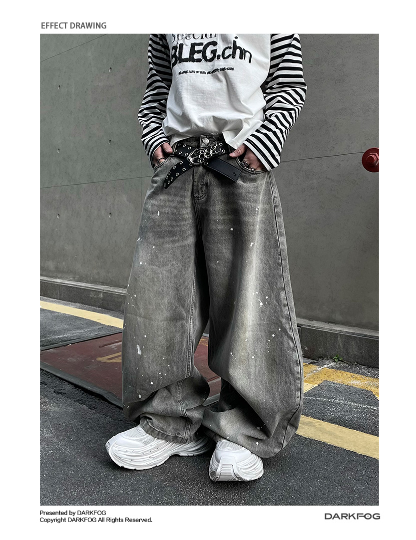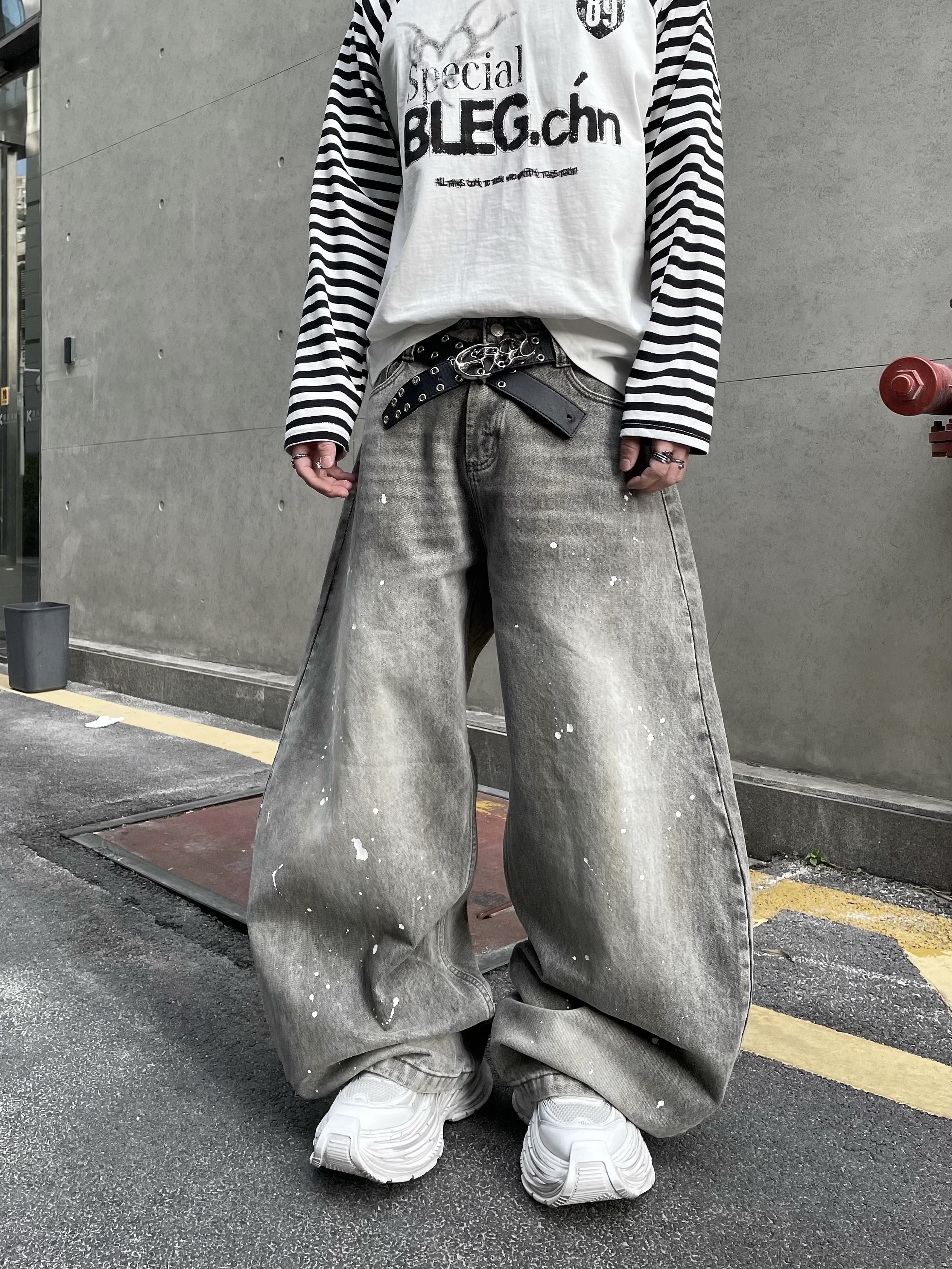 Washed Ink-Splatter Gray Curved Wide-Leg Denim Jeans WN12870