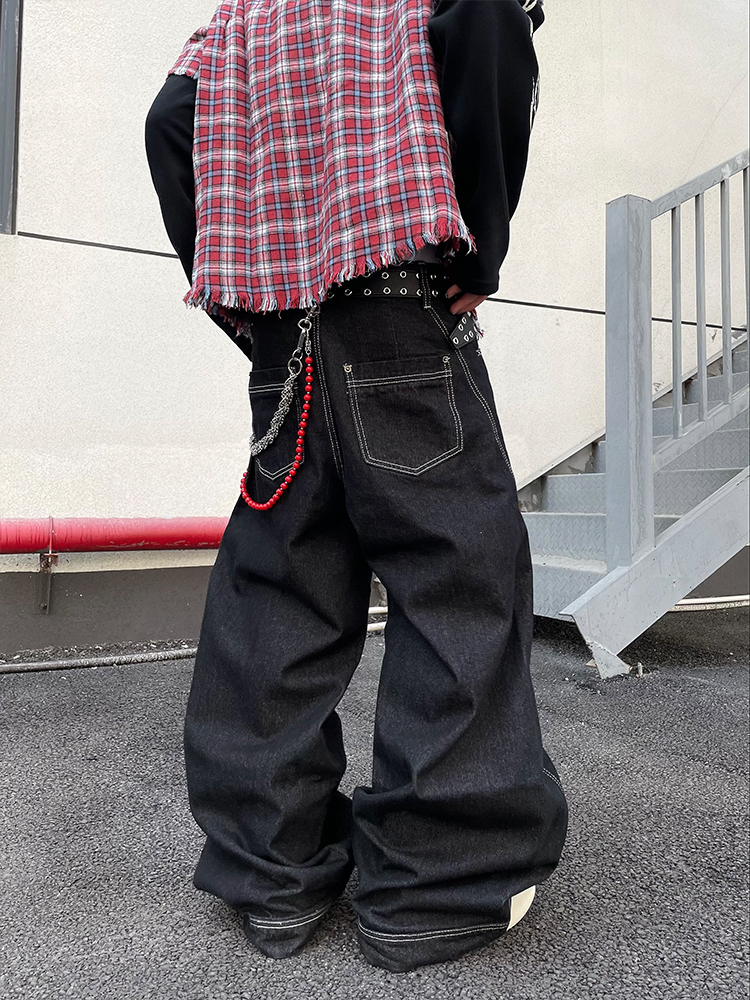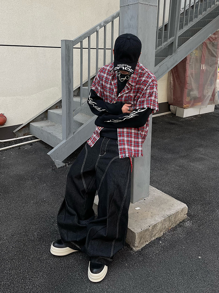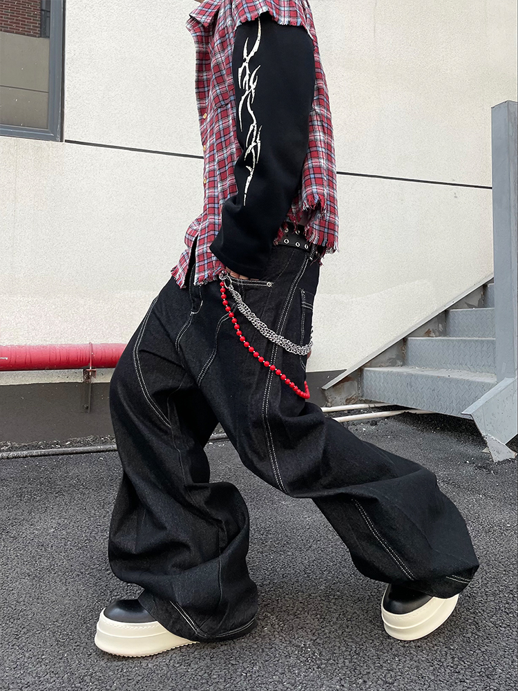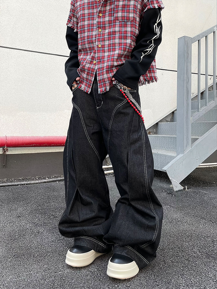 Curved Silhouette Pleats Contrast Stitch Flare Denim Jeans WN16290