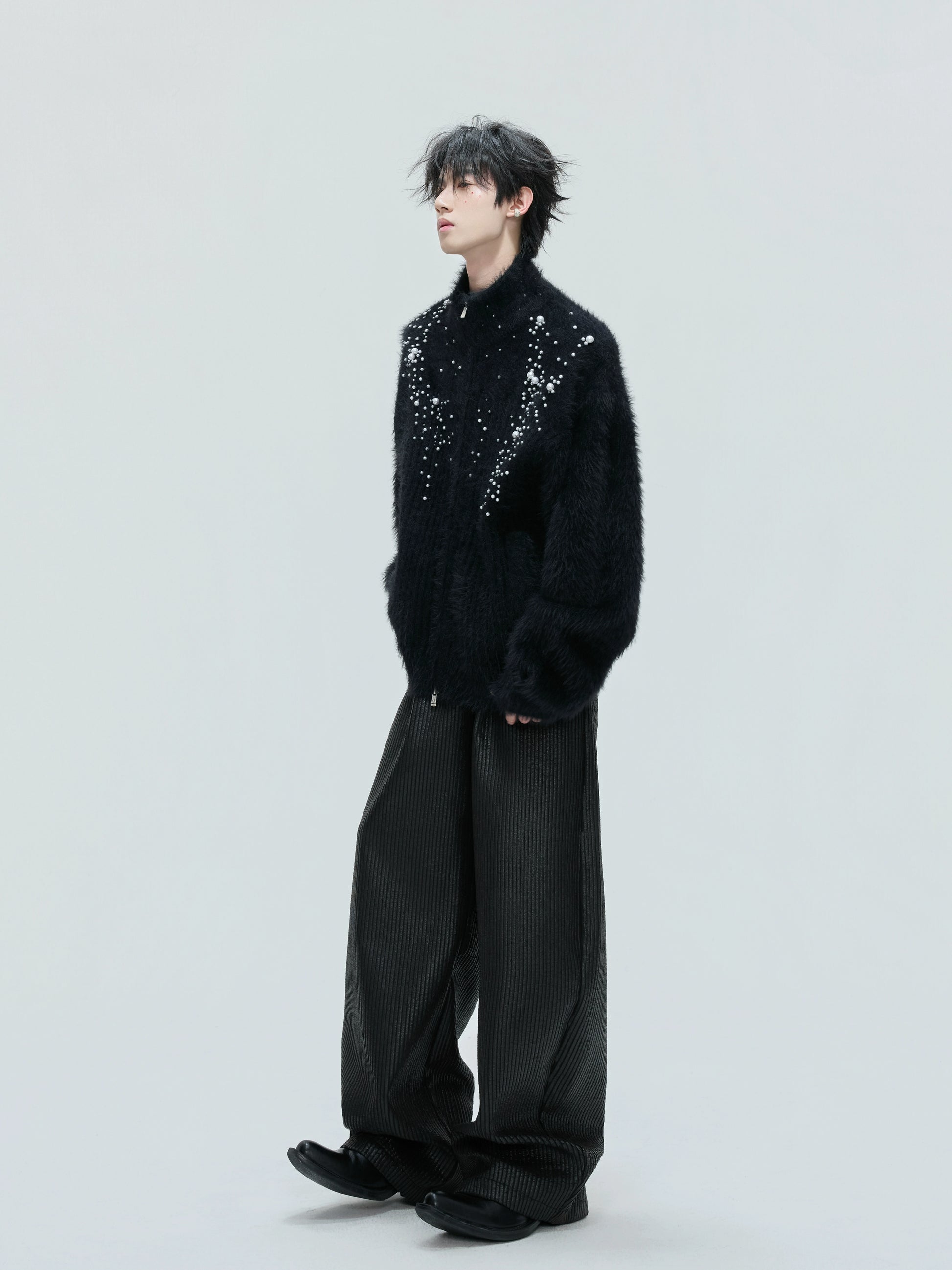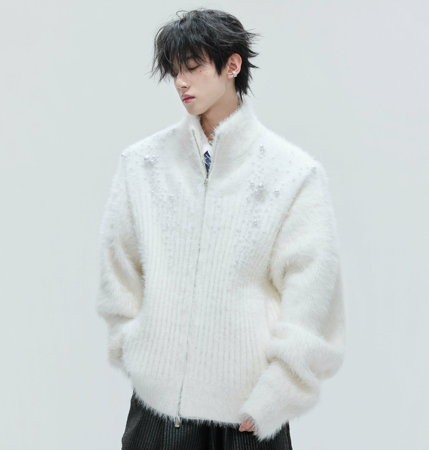 Pearl Embellished High-Neck Furry Knit Zipper Cardigan WN21720