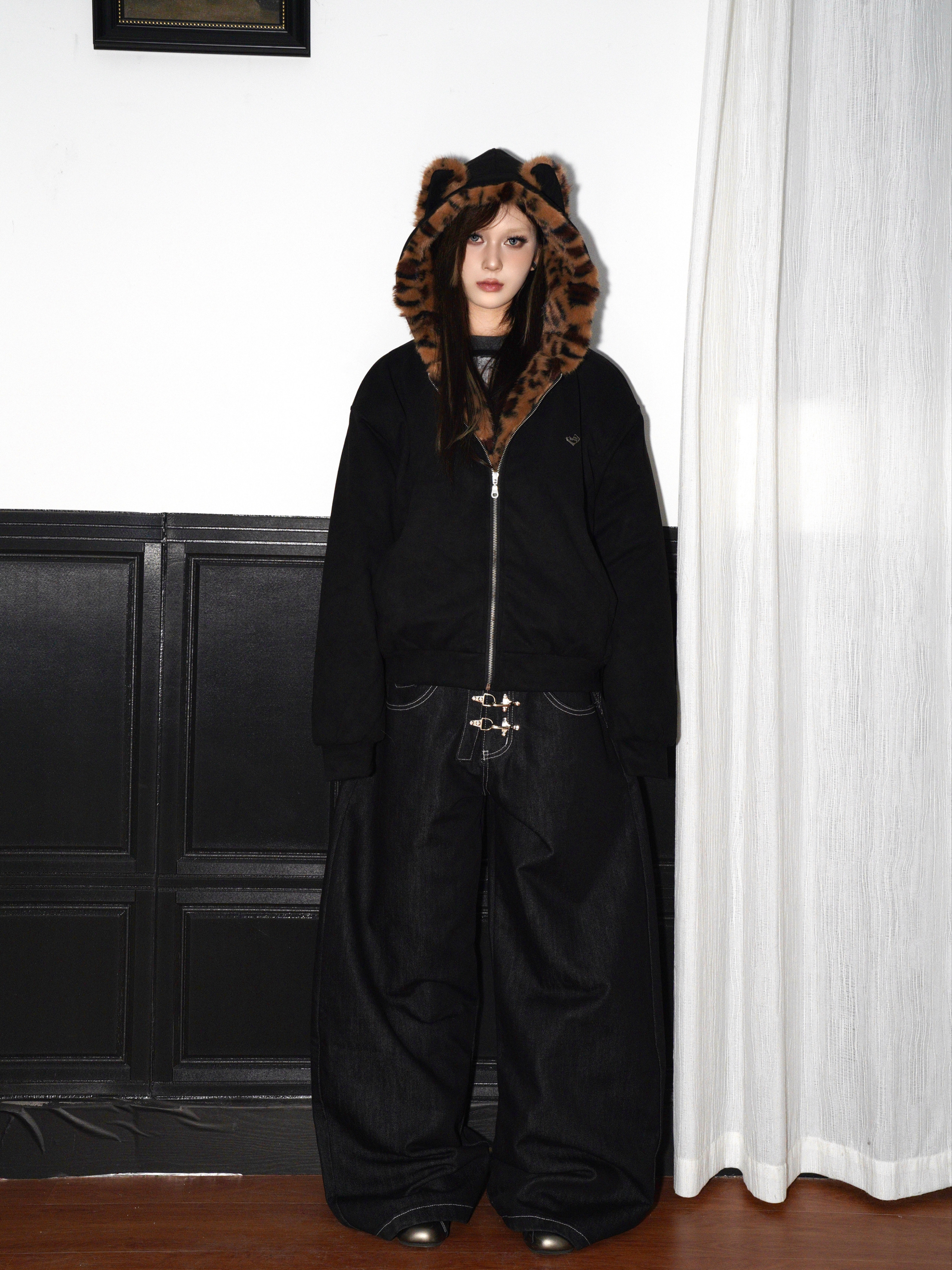 Leopard Fake Fur-Collar Hooded Zipper Jacket WN22210