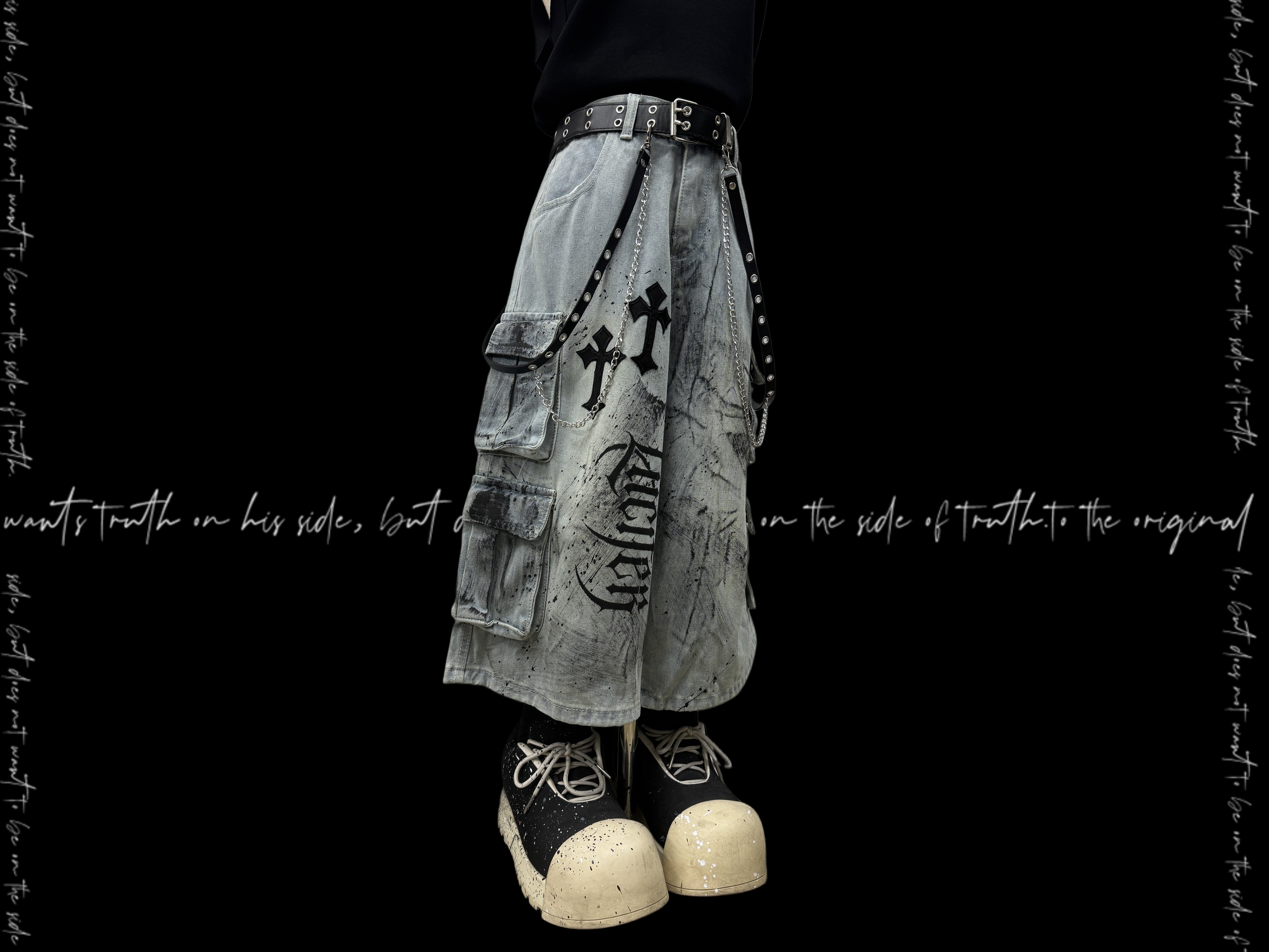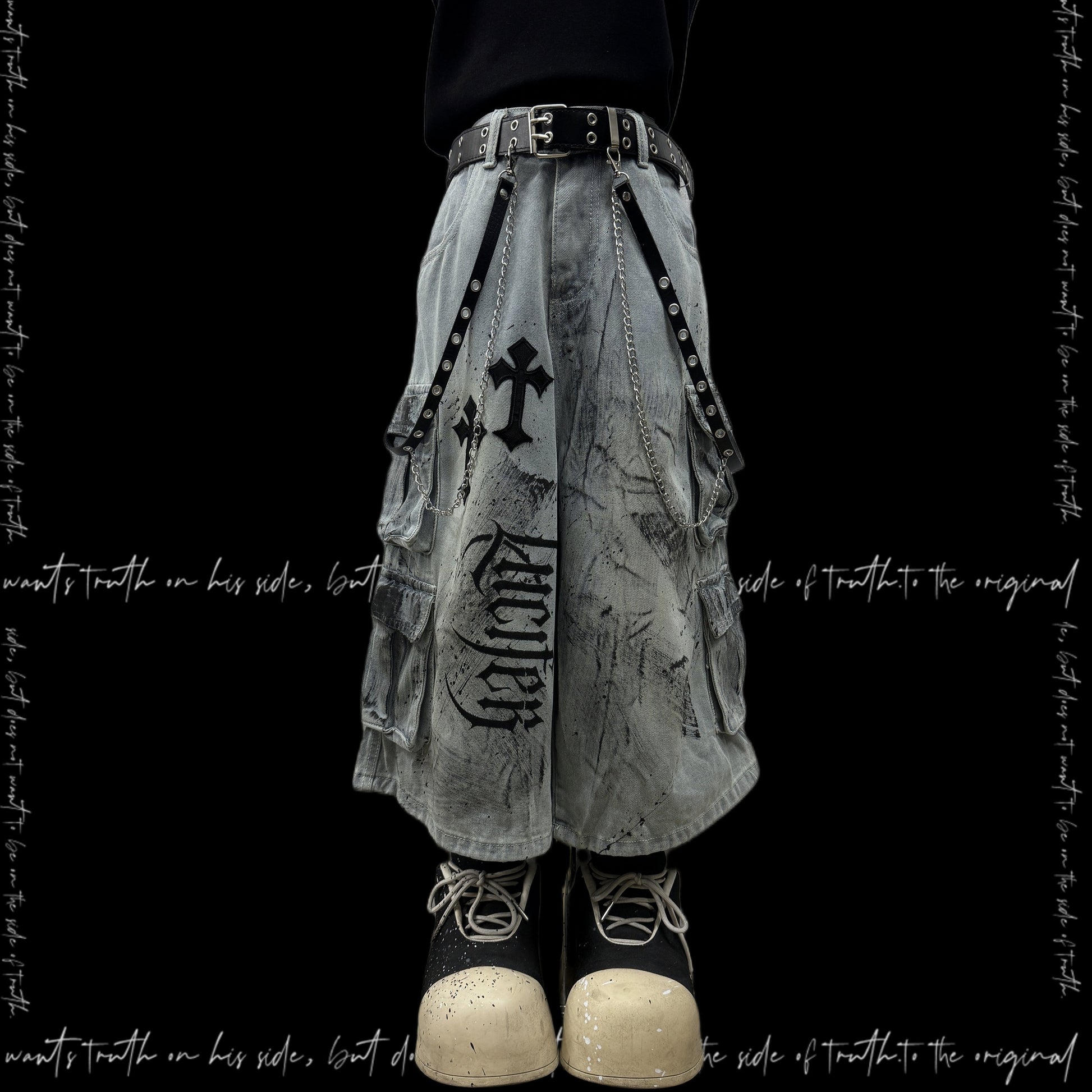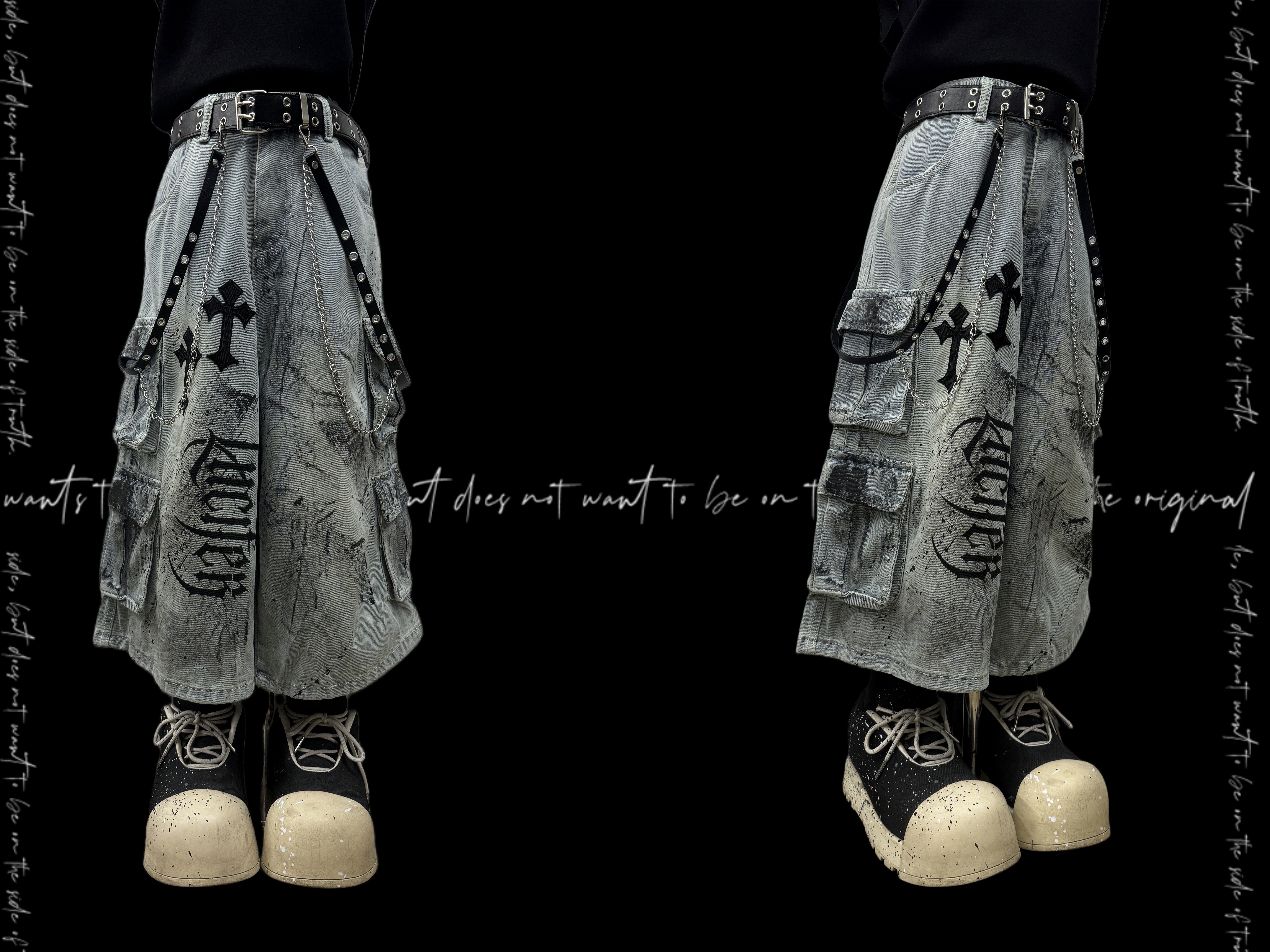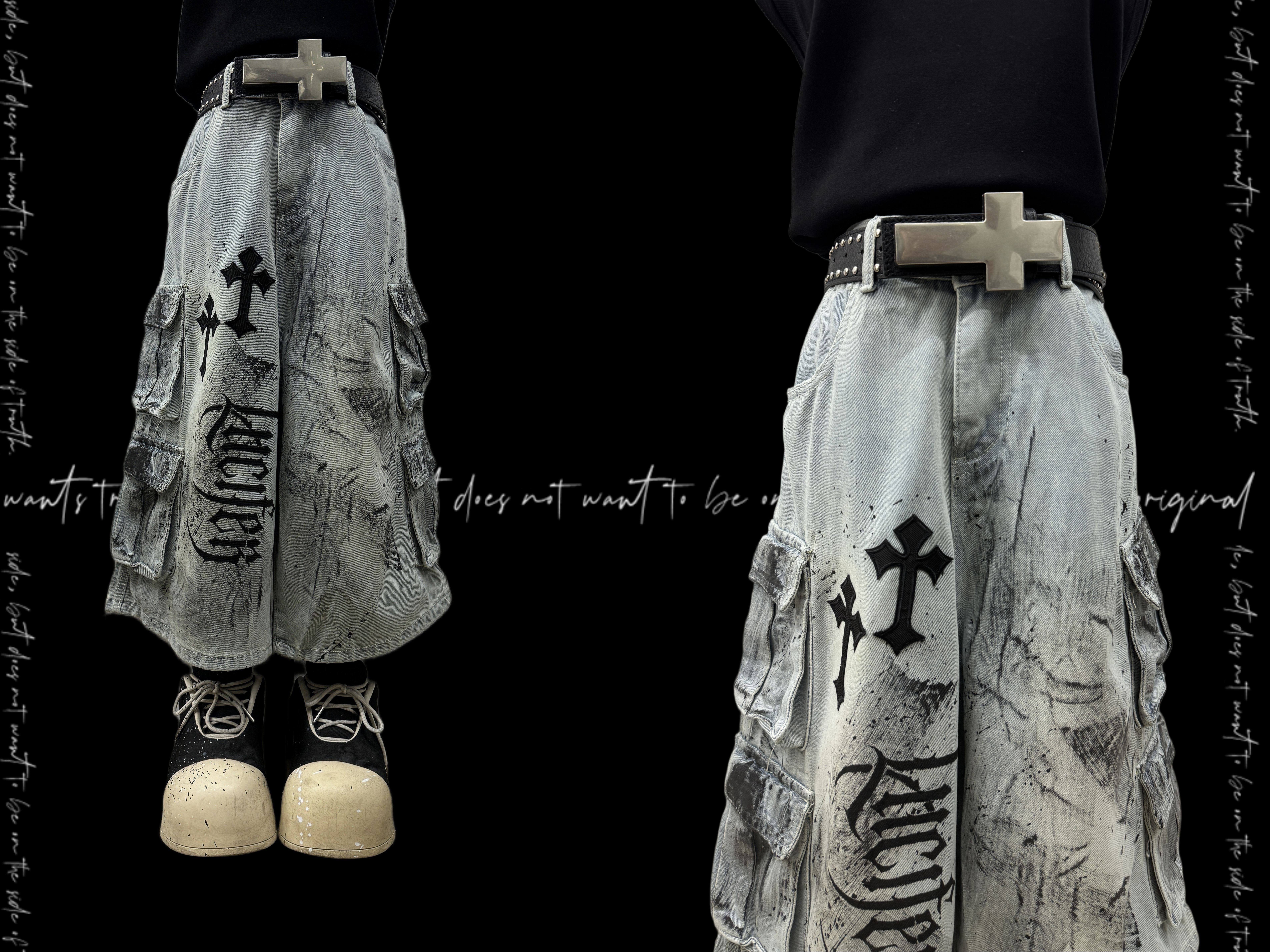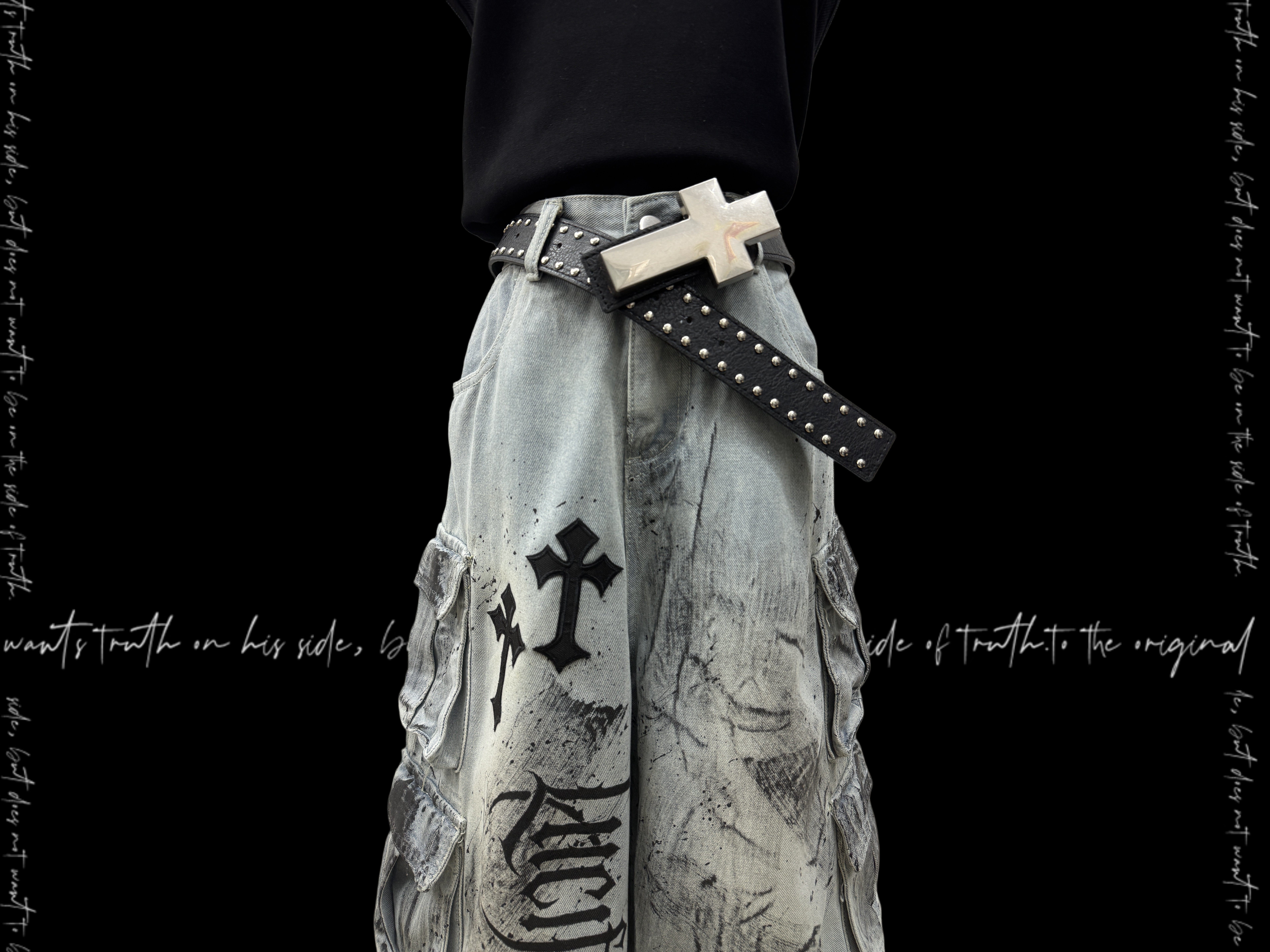 Cross Print Cargo Wide Leg Cropped Denim Jeans & Skull Belt & Cross Belt & Belt Chain WN23794