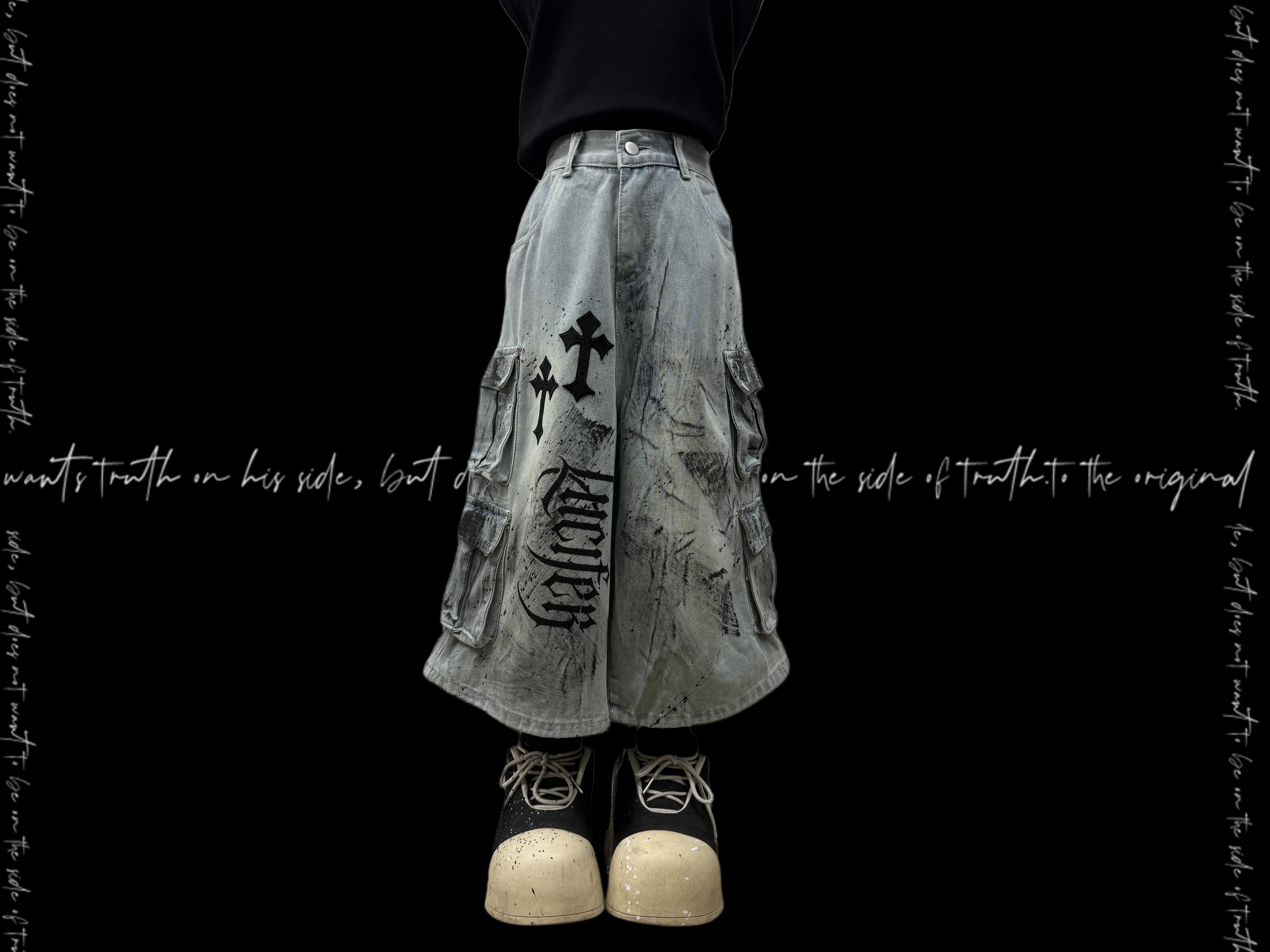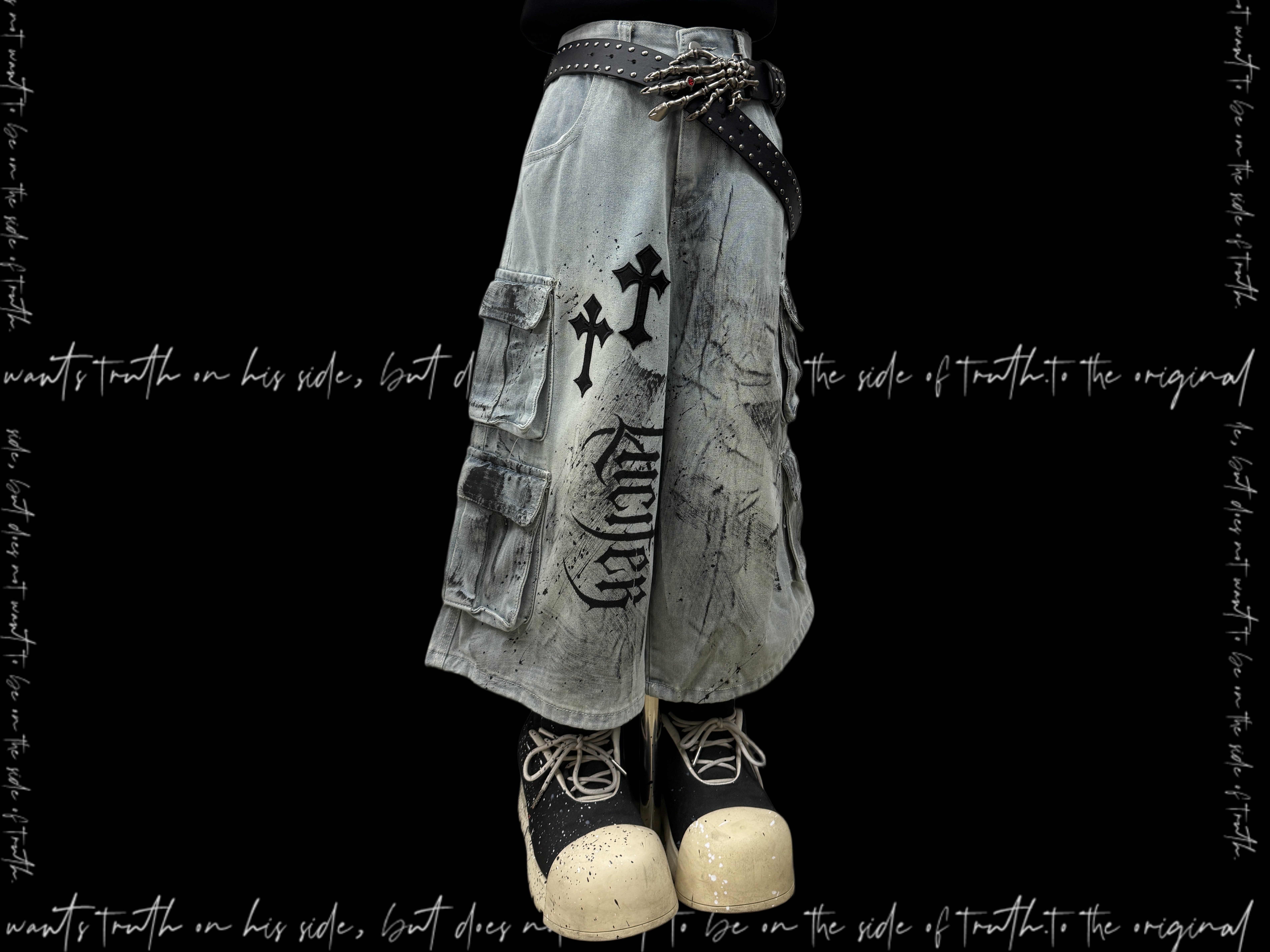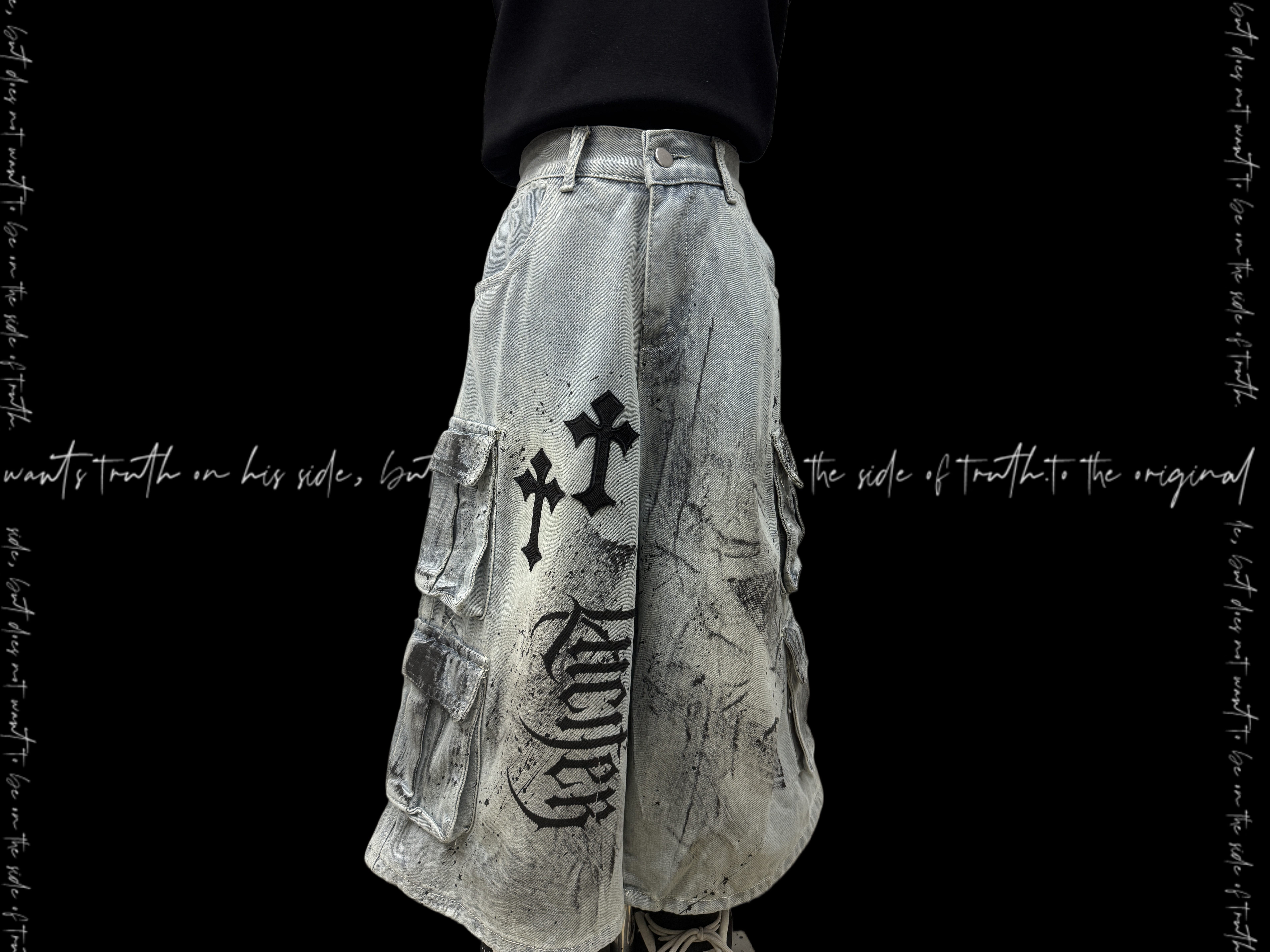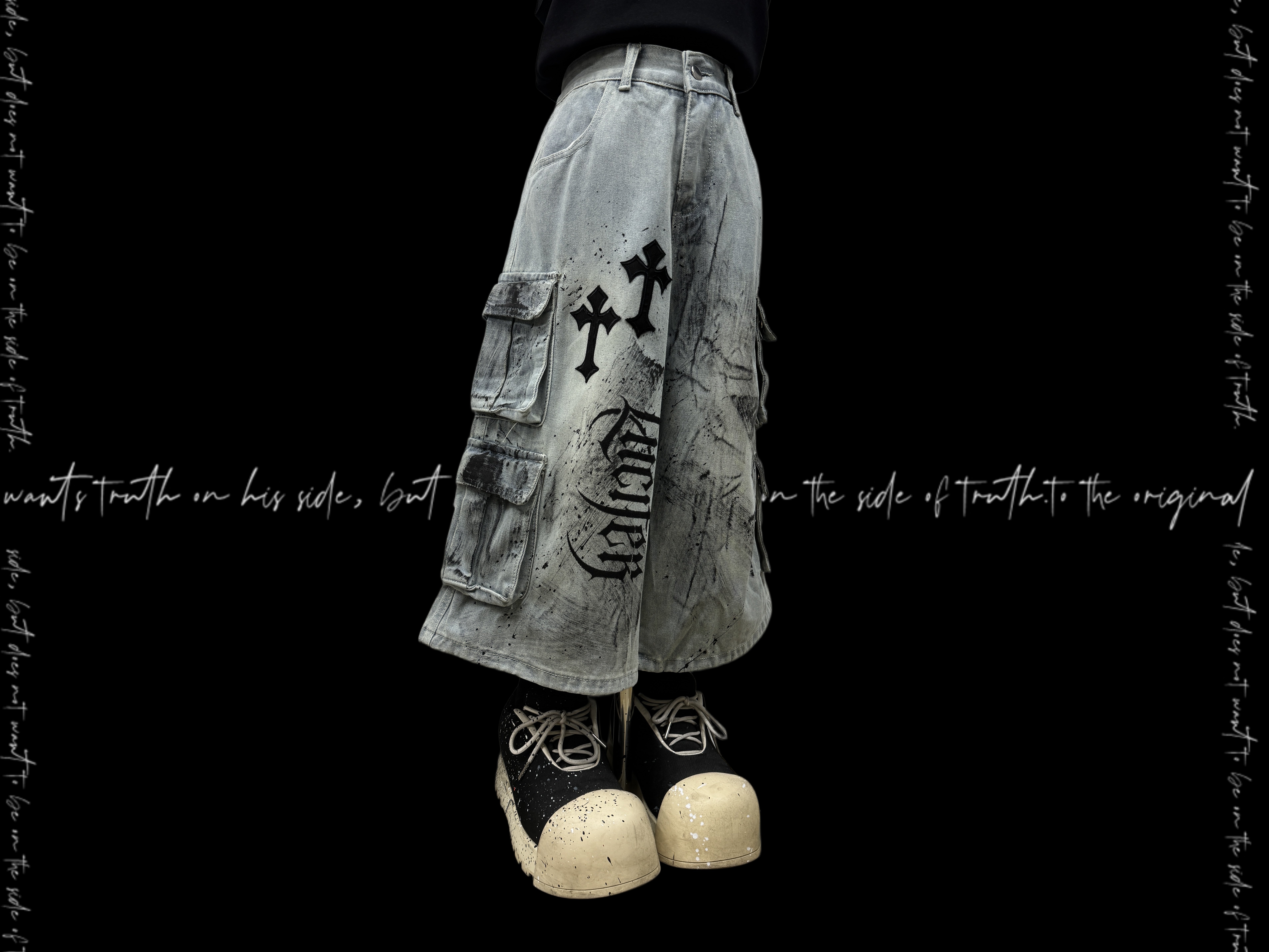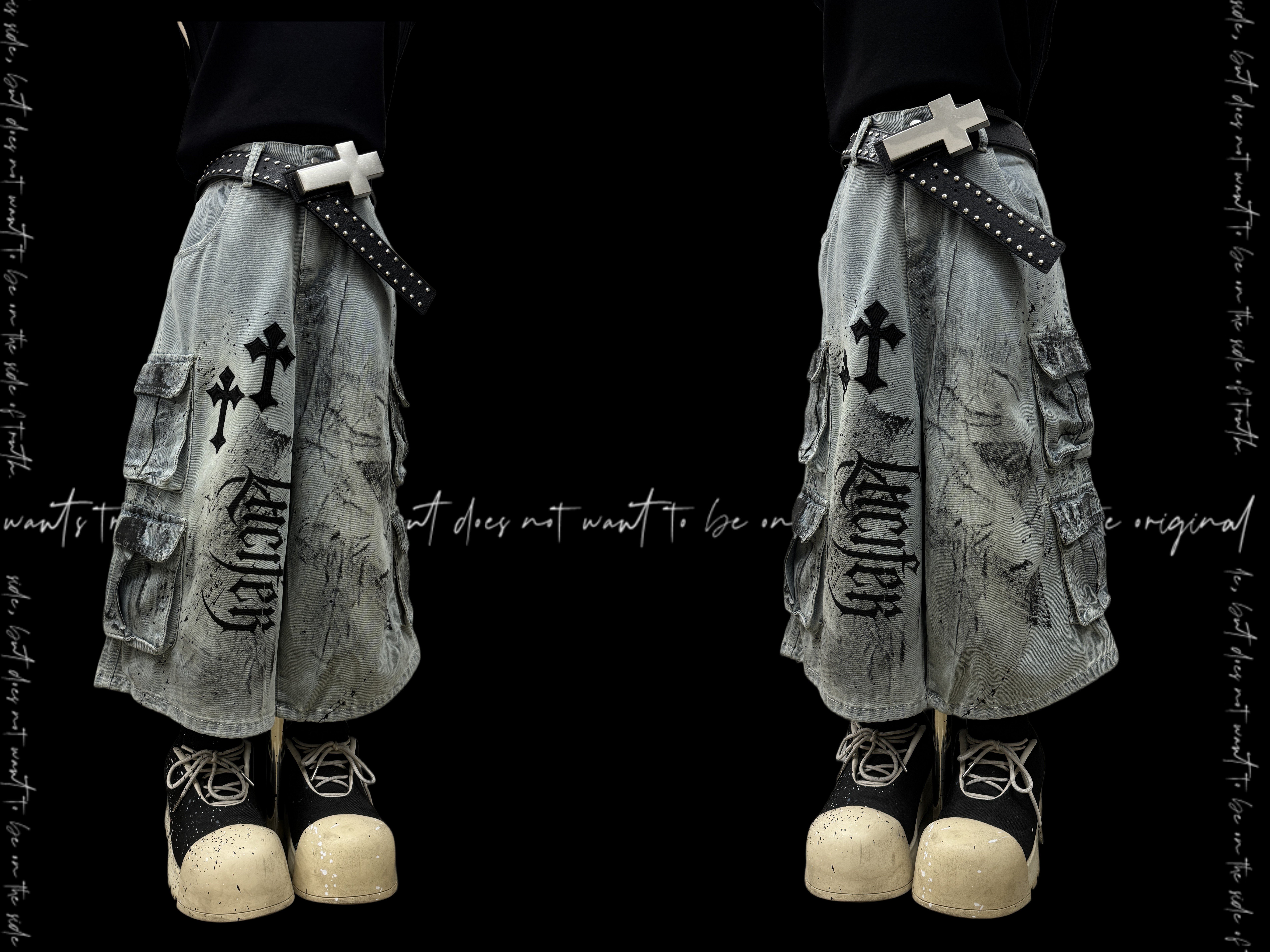 Cross Print Cargo Wide Leg Cropped Denim Jeans & Skull Belt & Cross Belt & Belt Chain WN23794