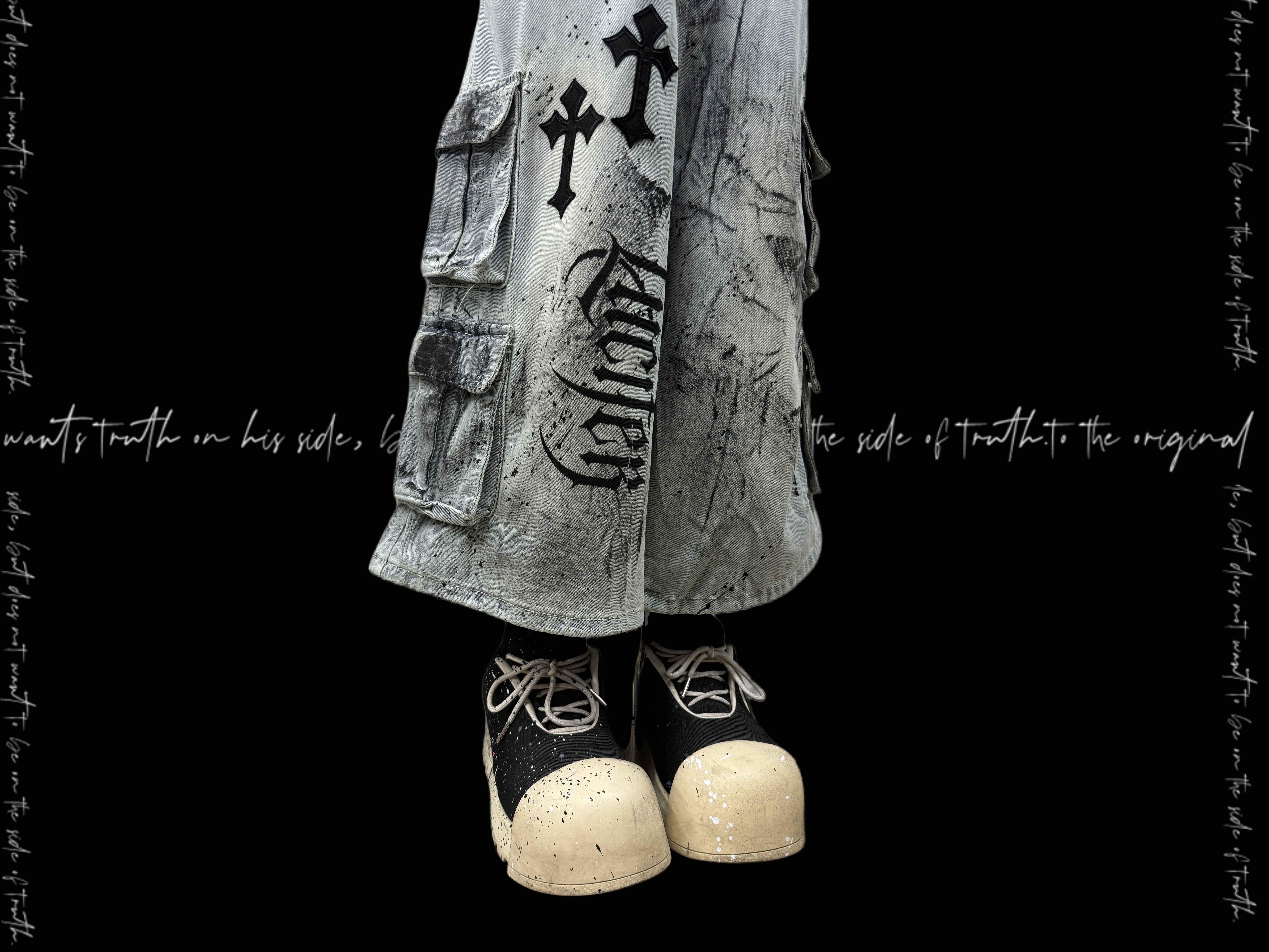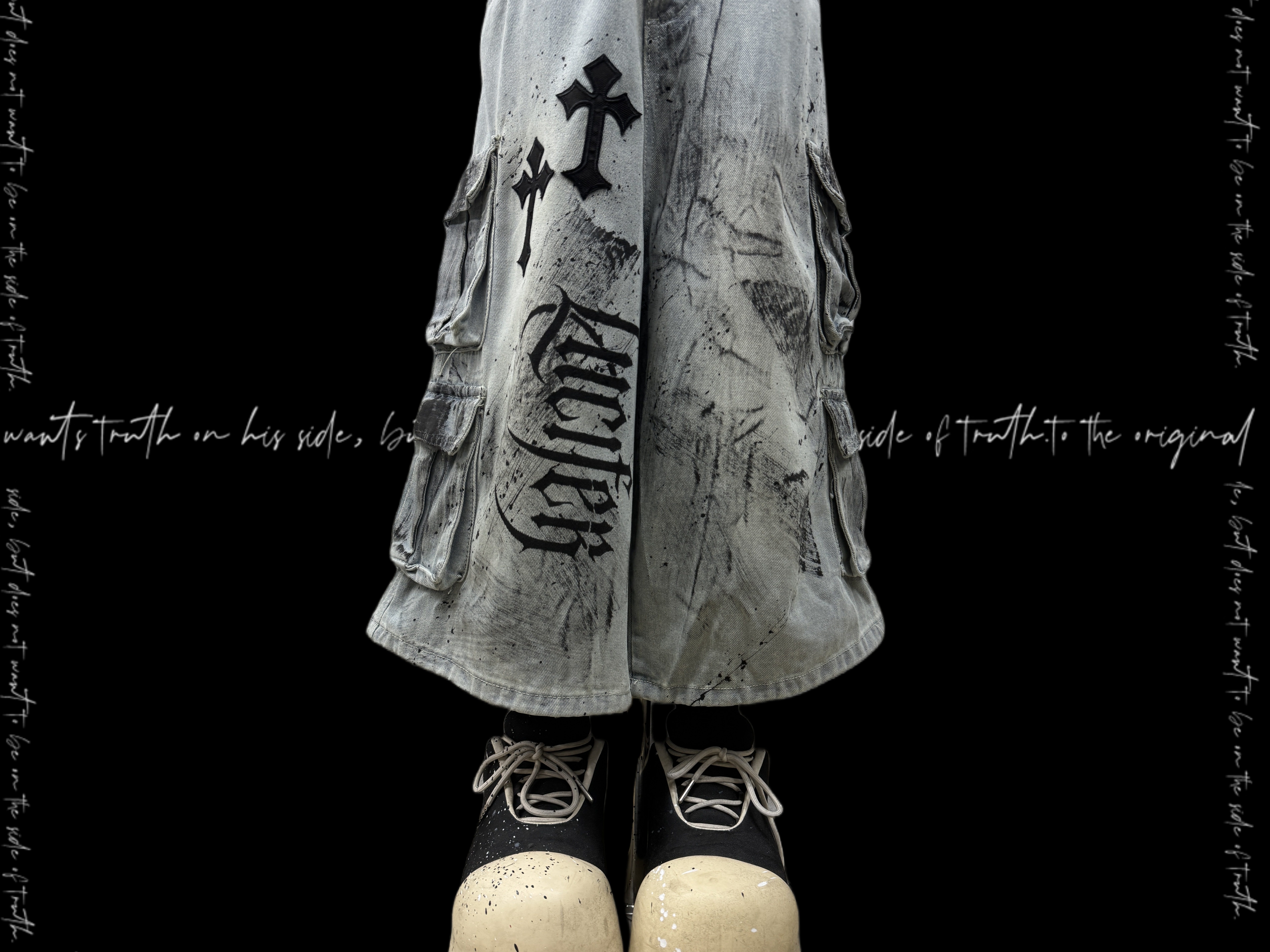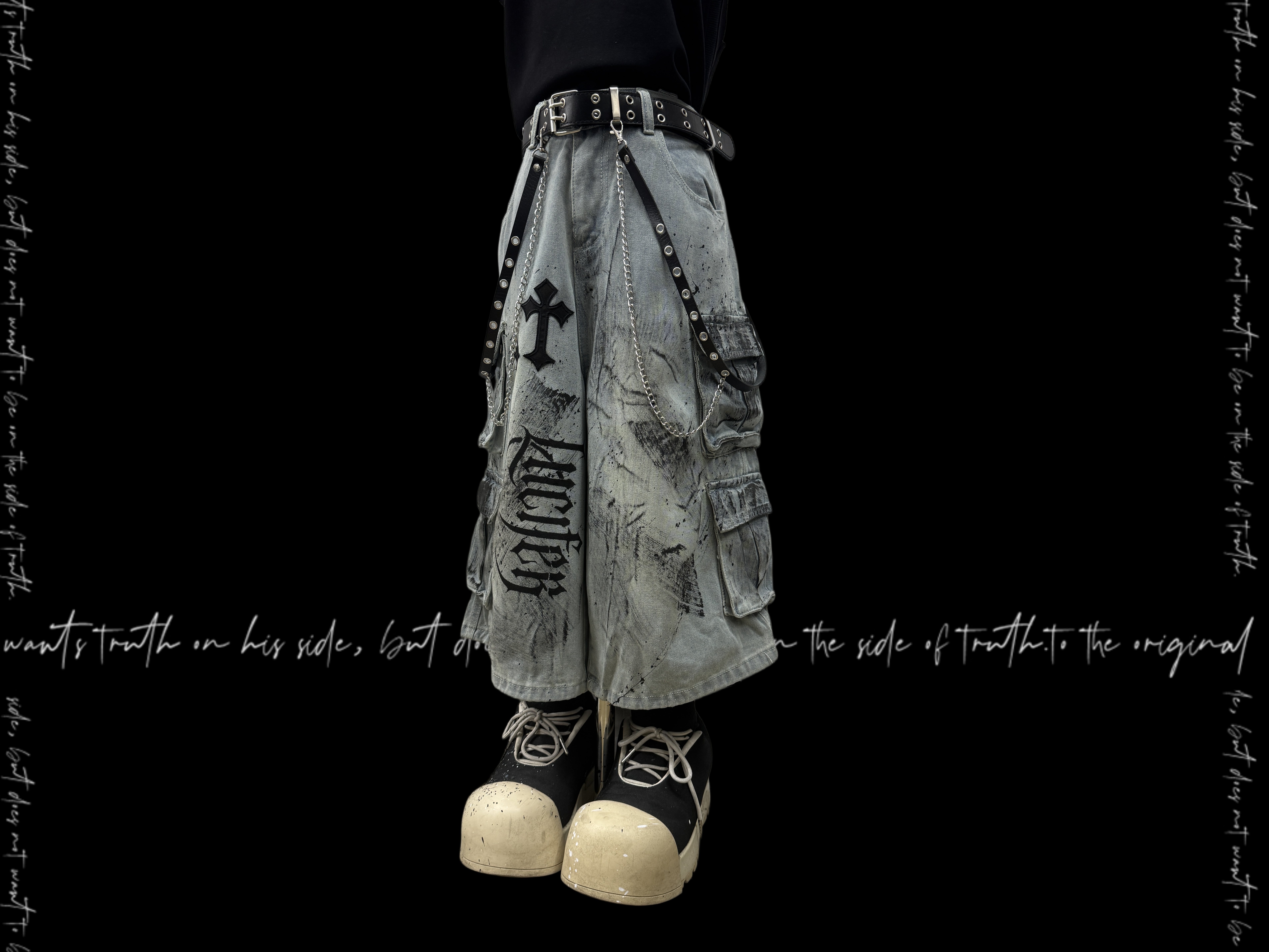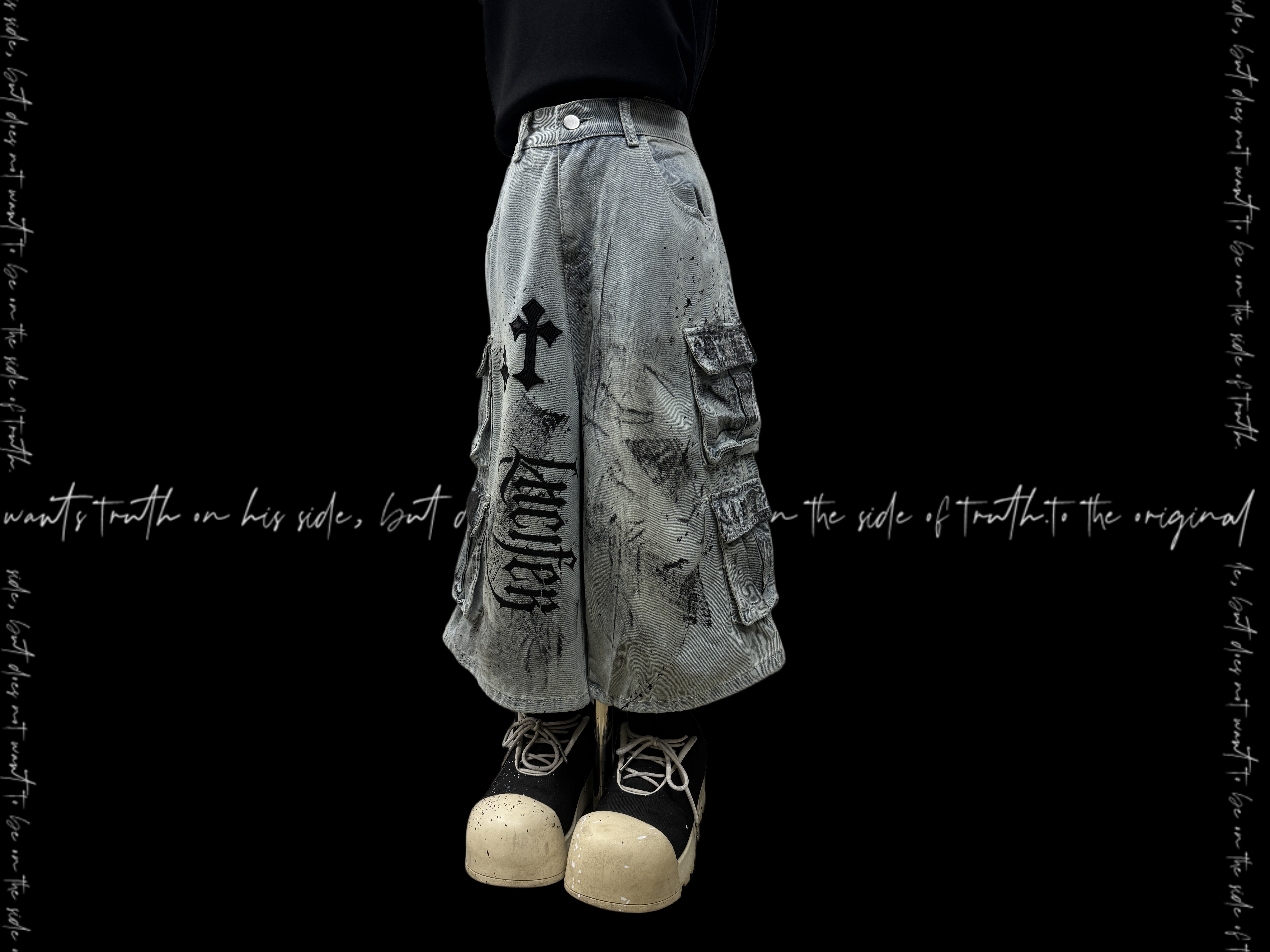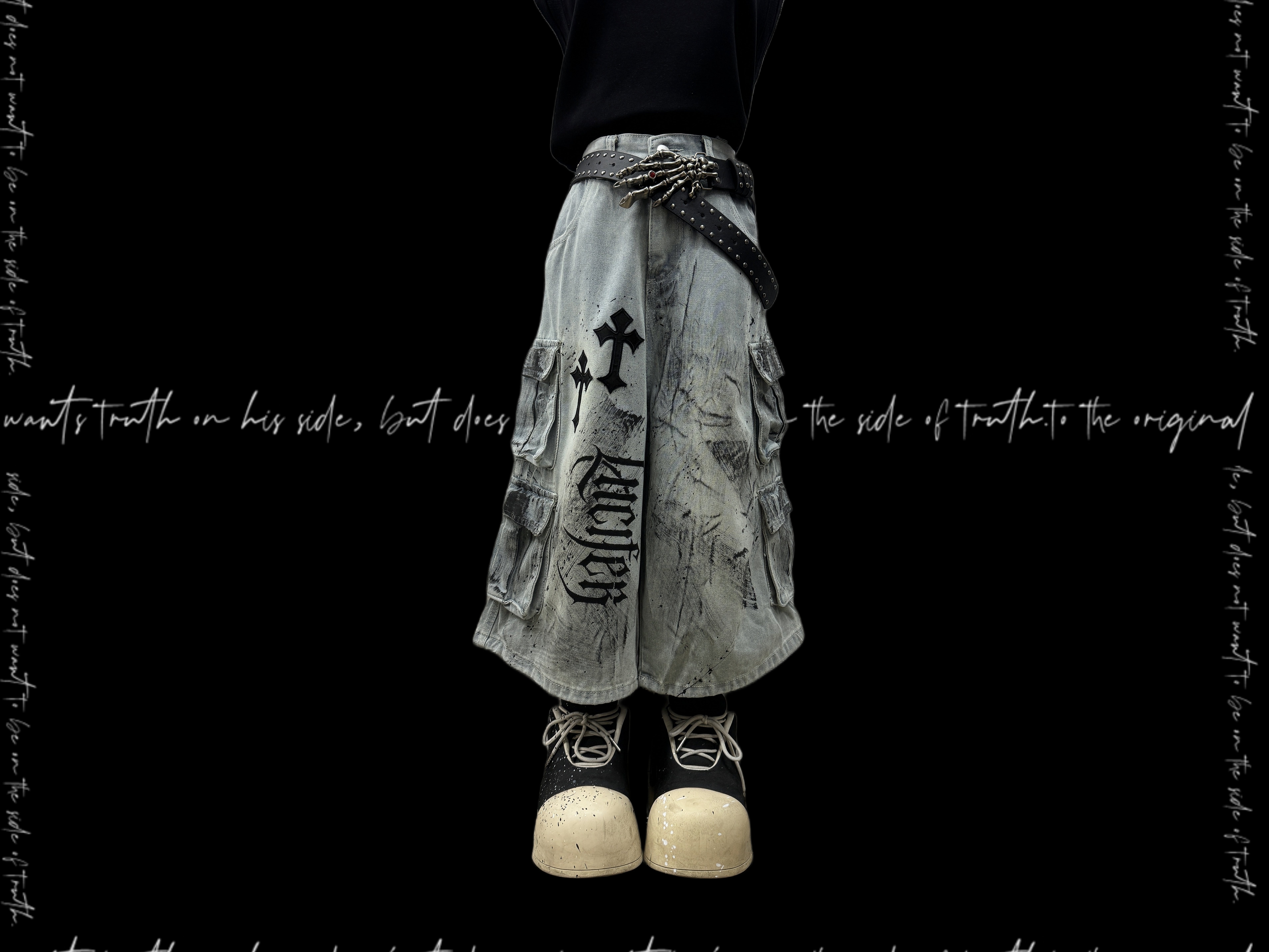 Cross Print Cargo Wide Leg Cropped Denim Jeans & Skull Belt & Cross Belt & Belt Chain WN23794