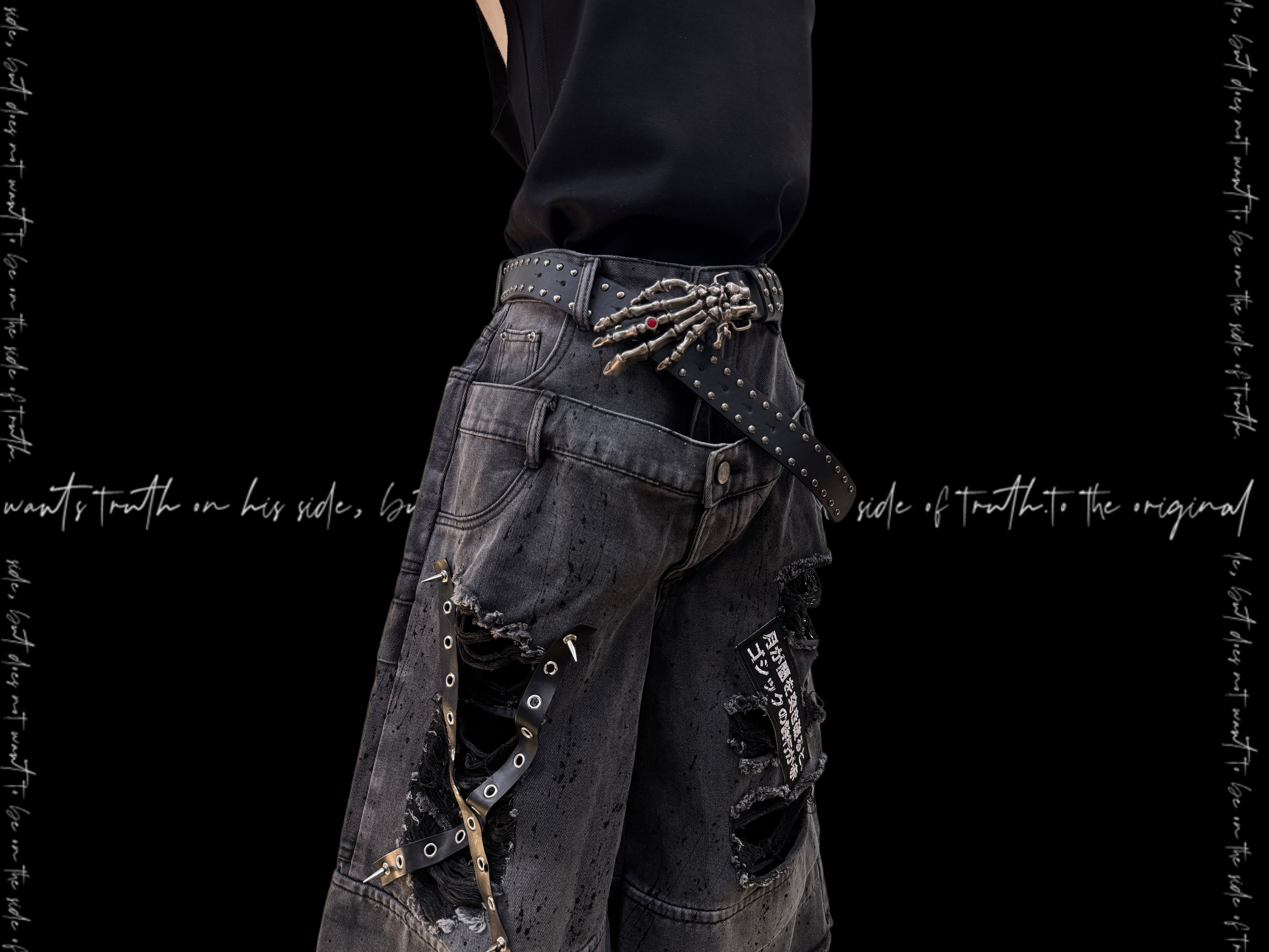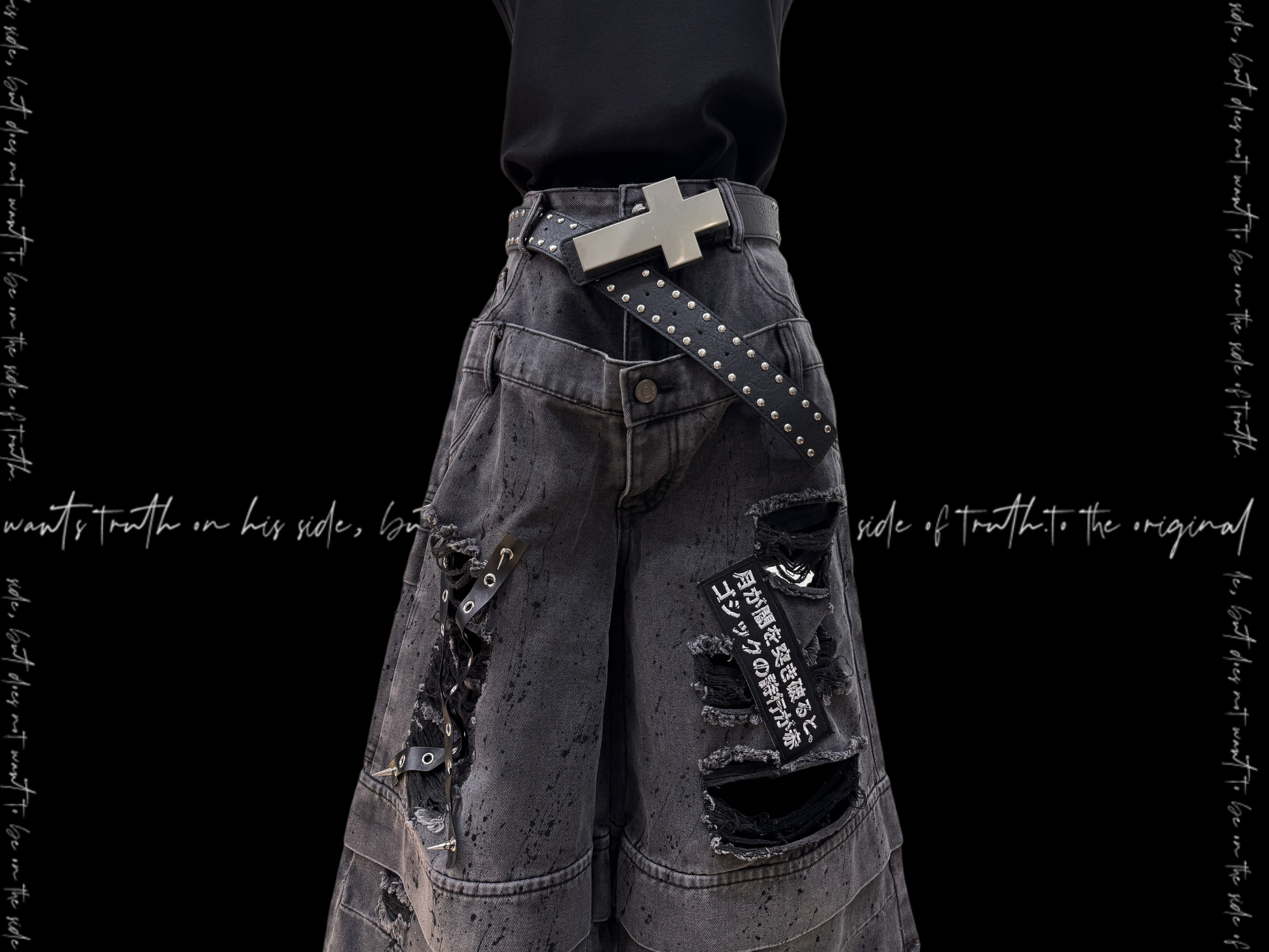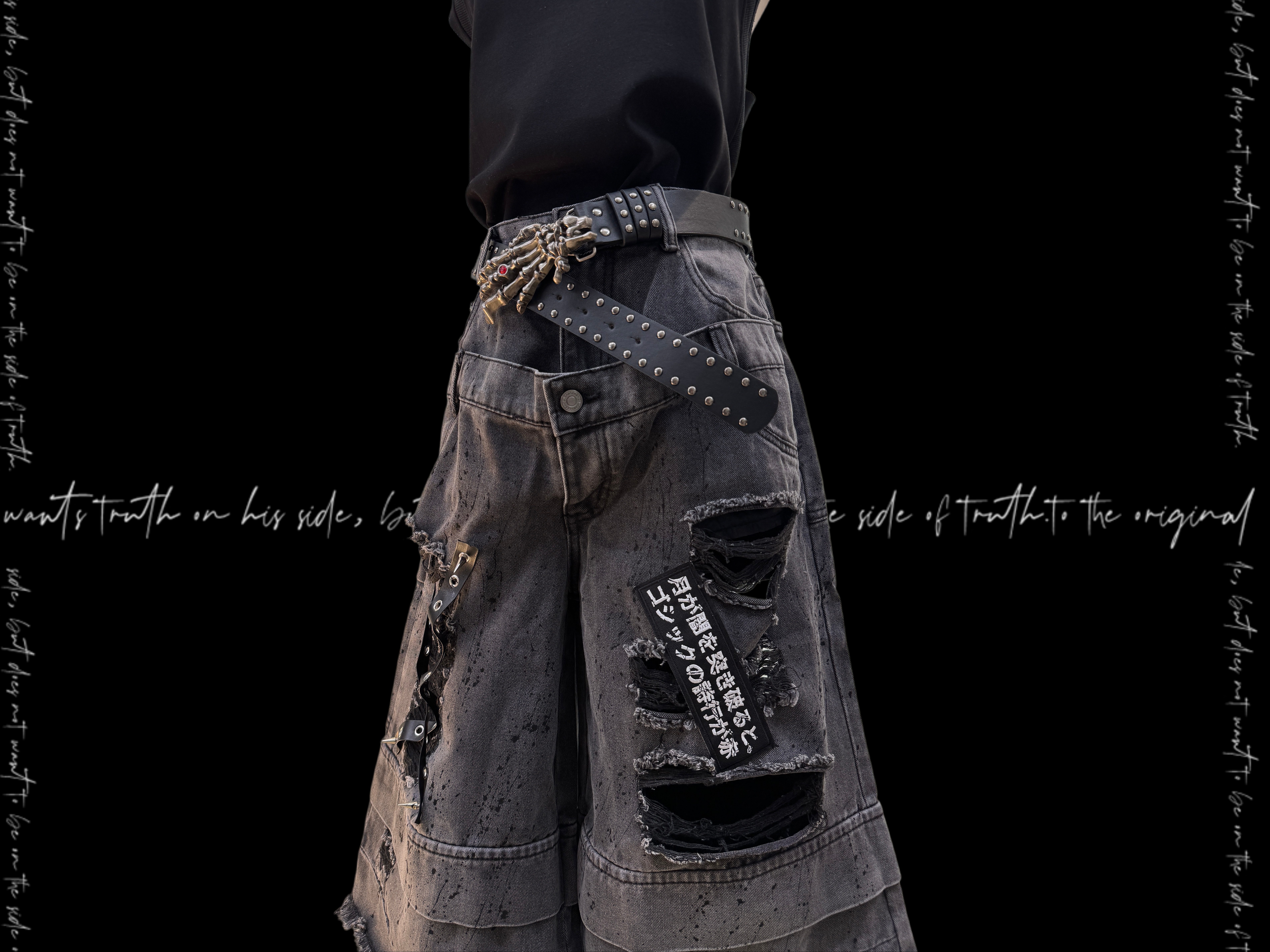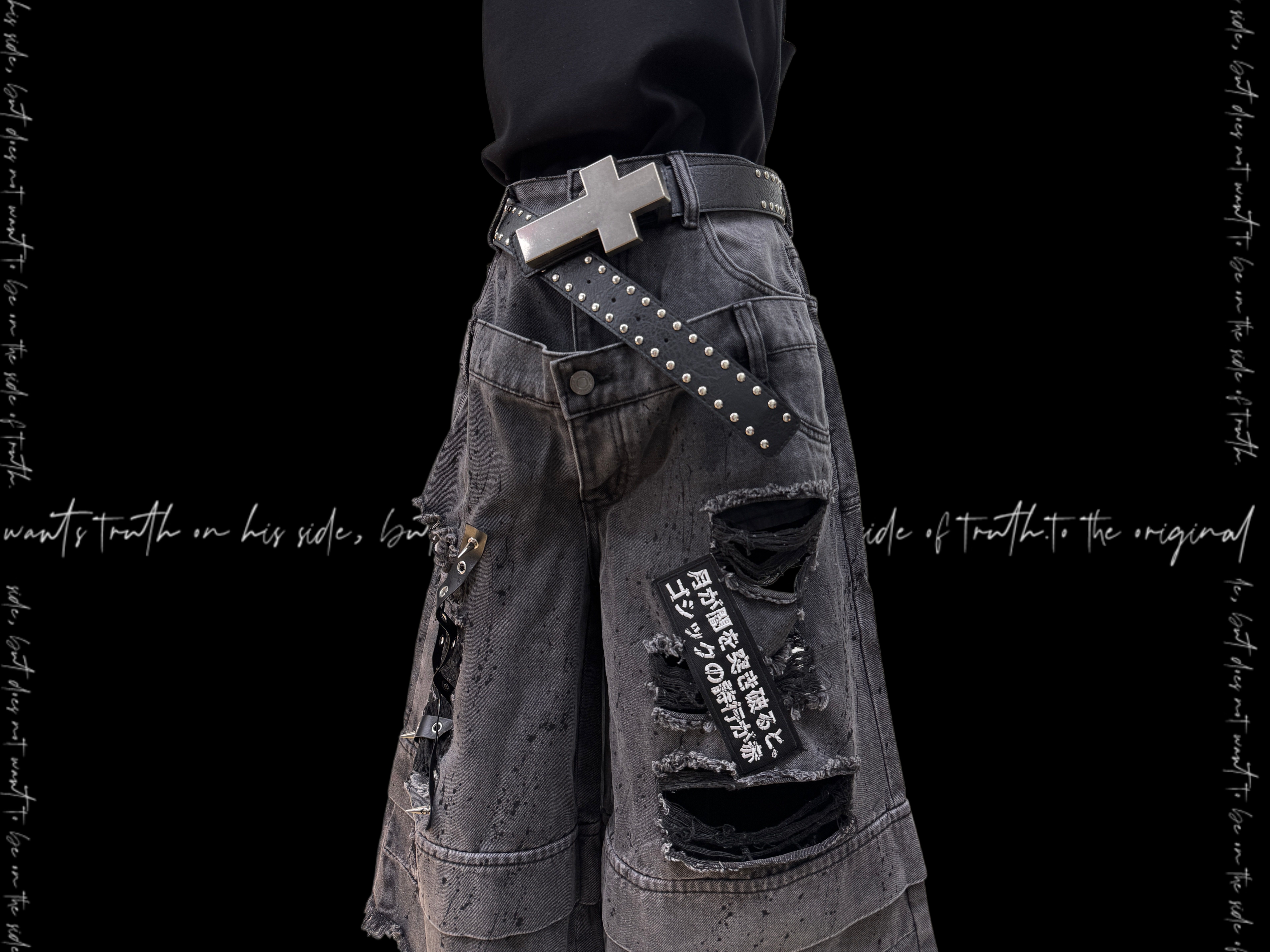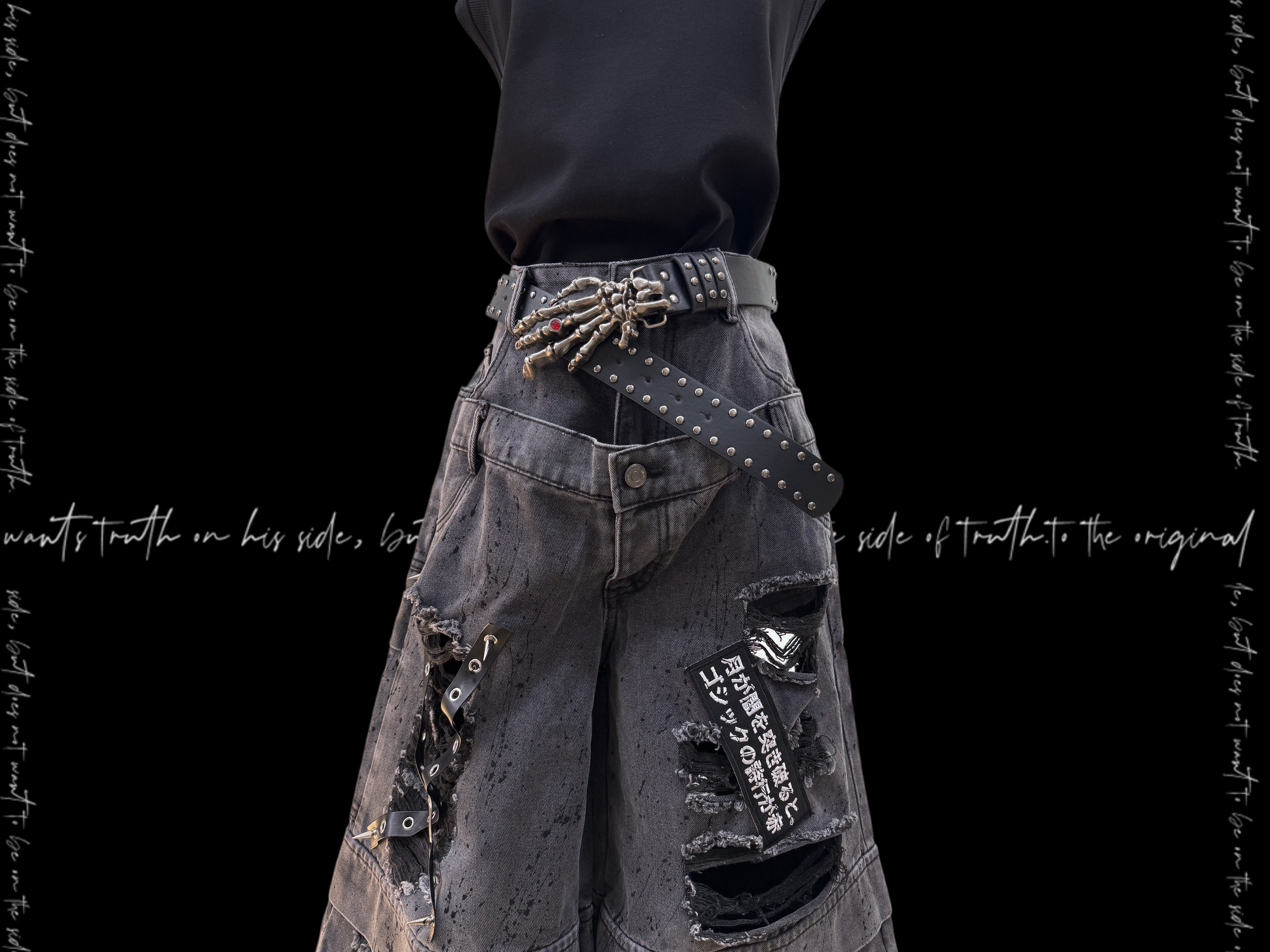 Damage Cutout Raw Hem Wide Leg Denim Jeans & Skull Belt & Cross Belt & Belt Chain WN23828