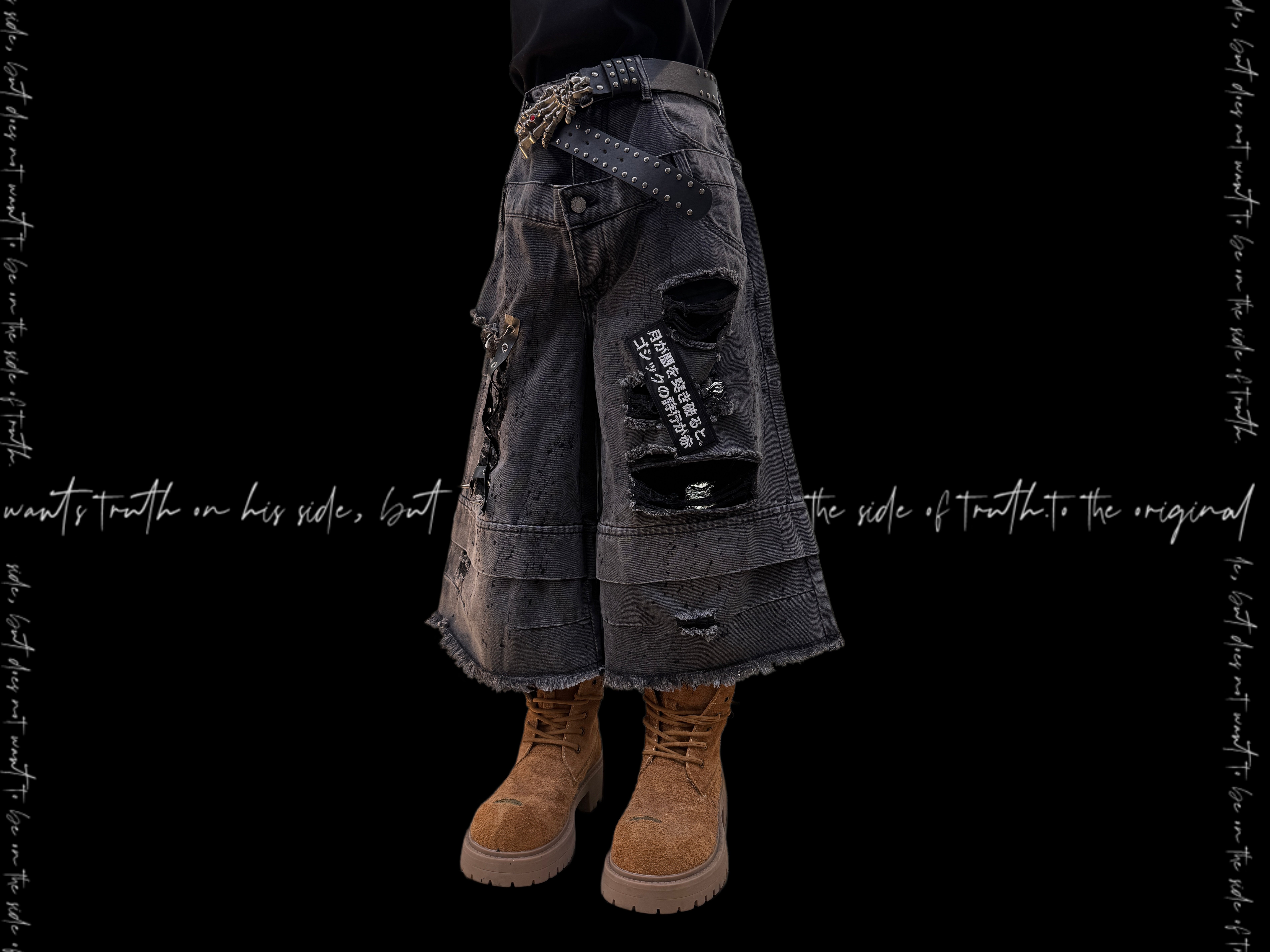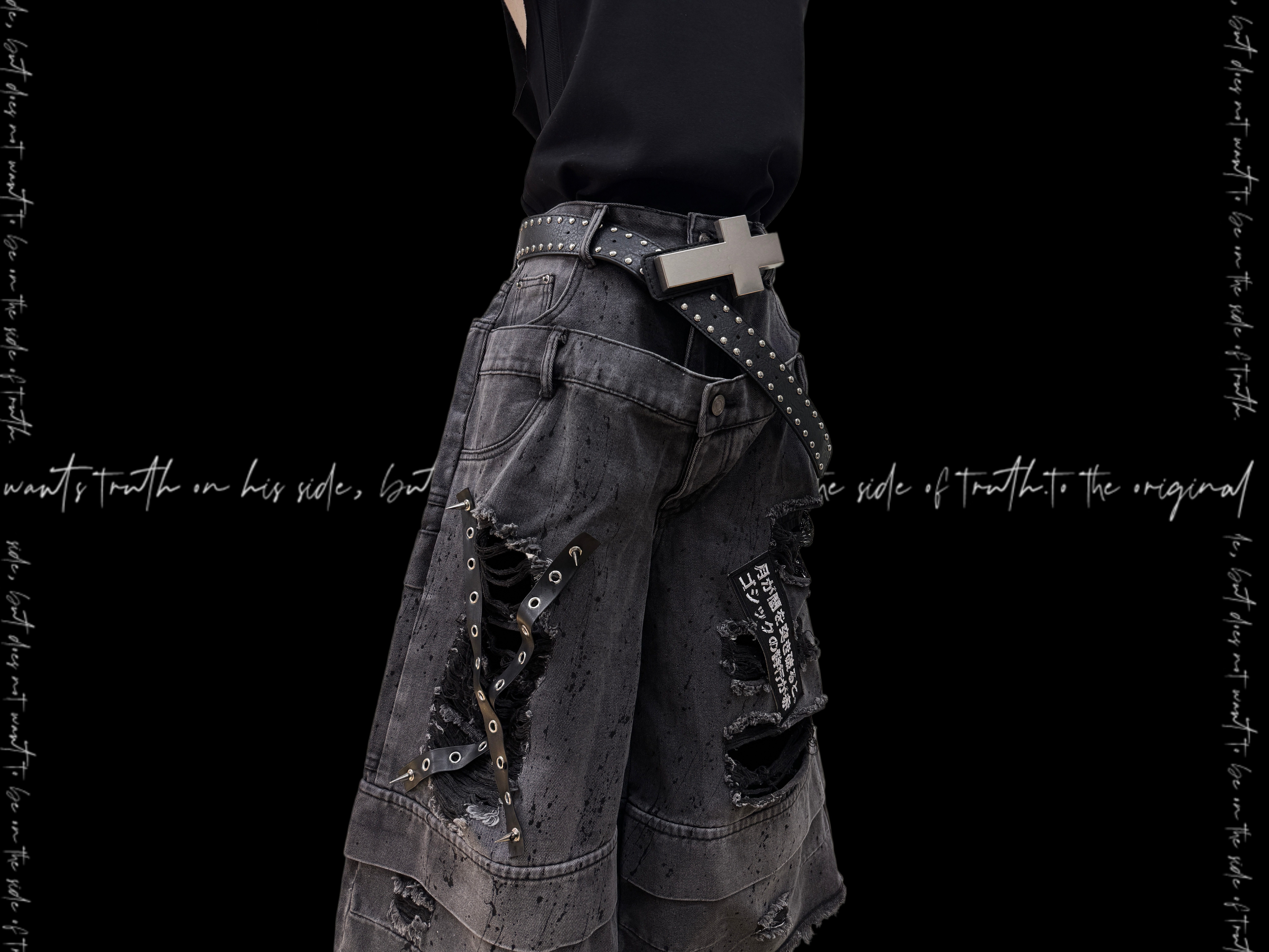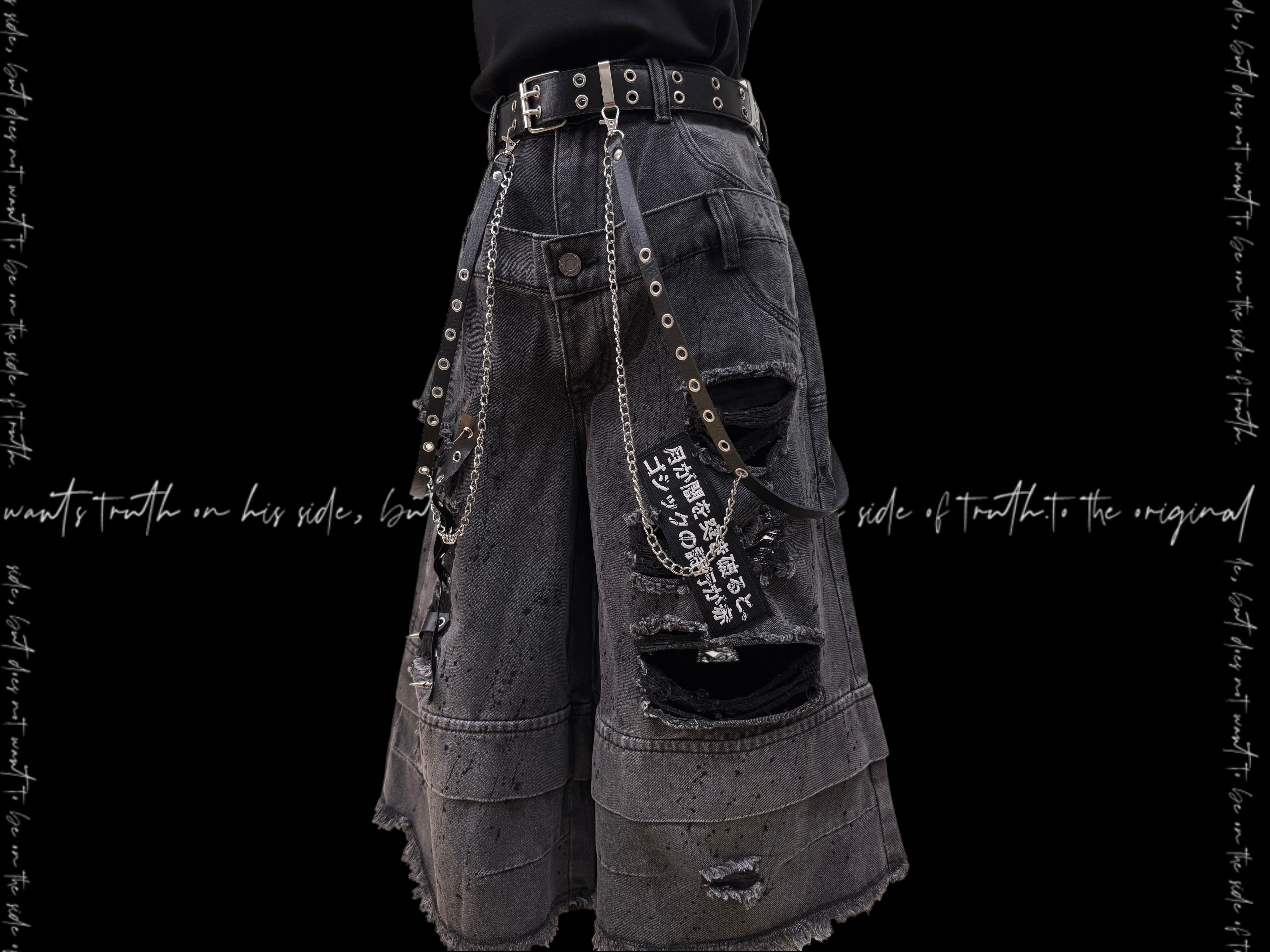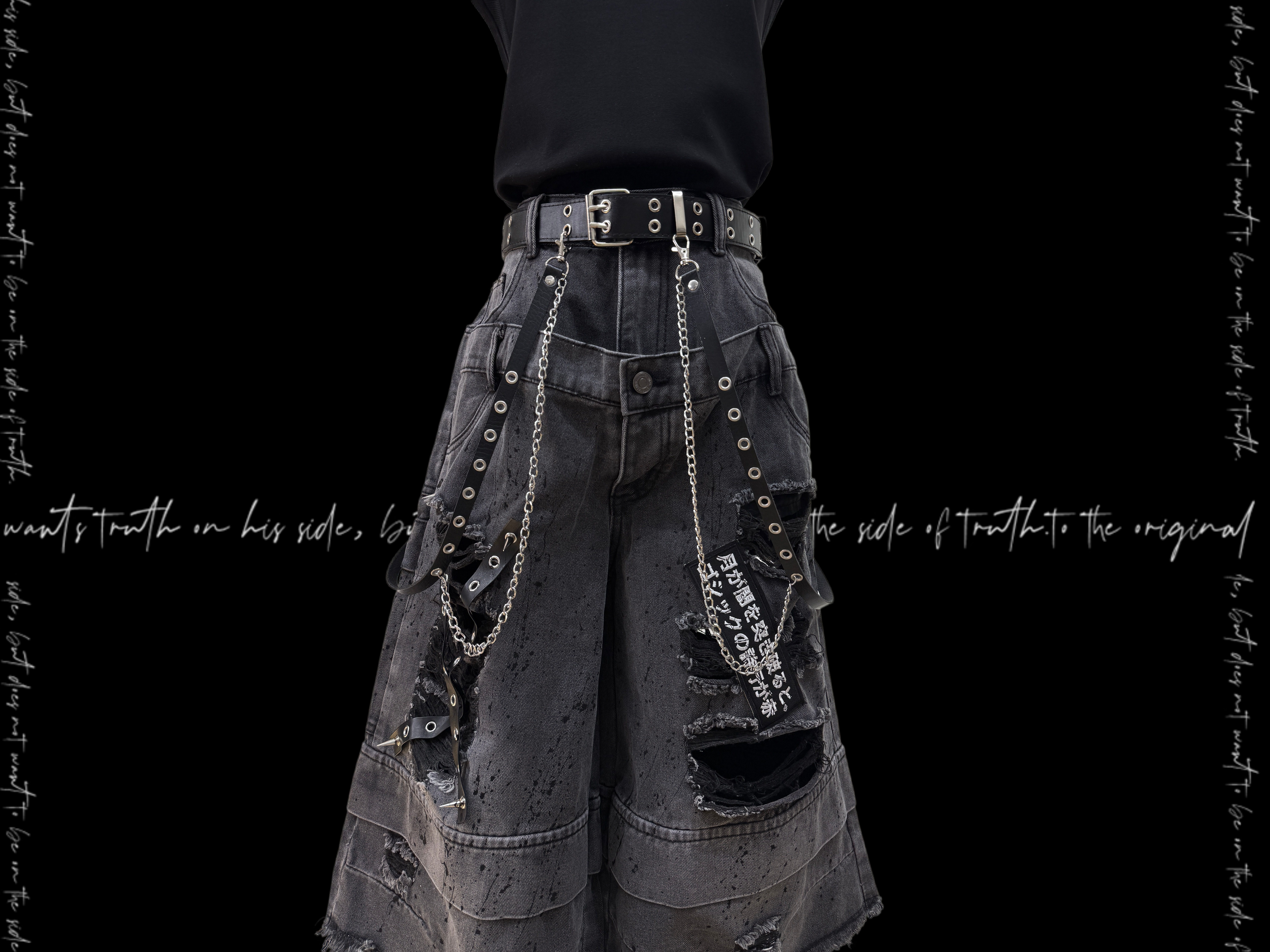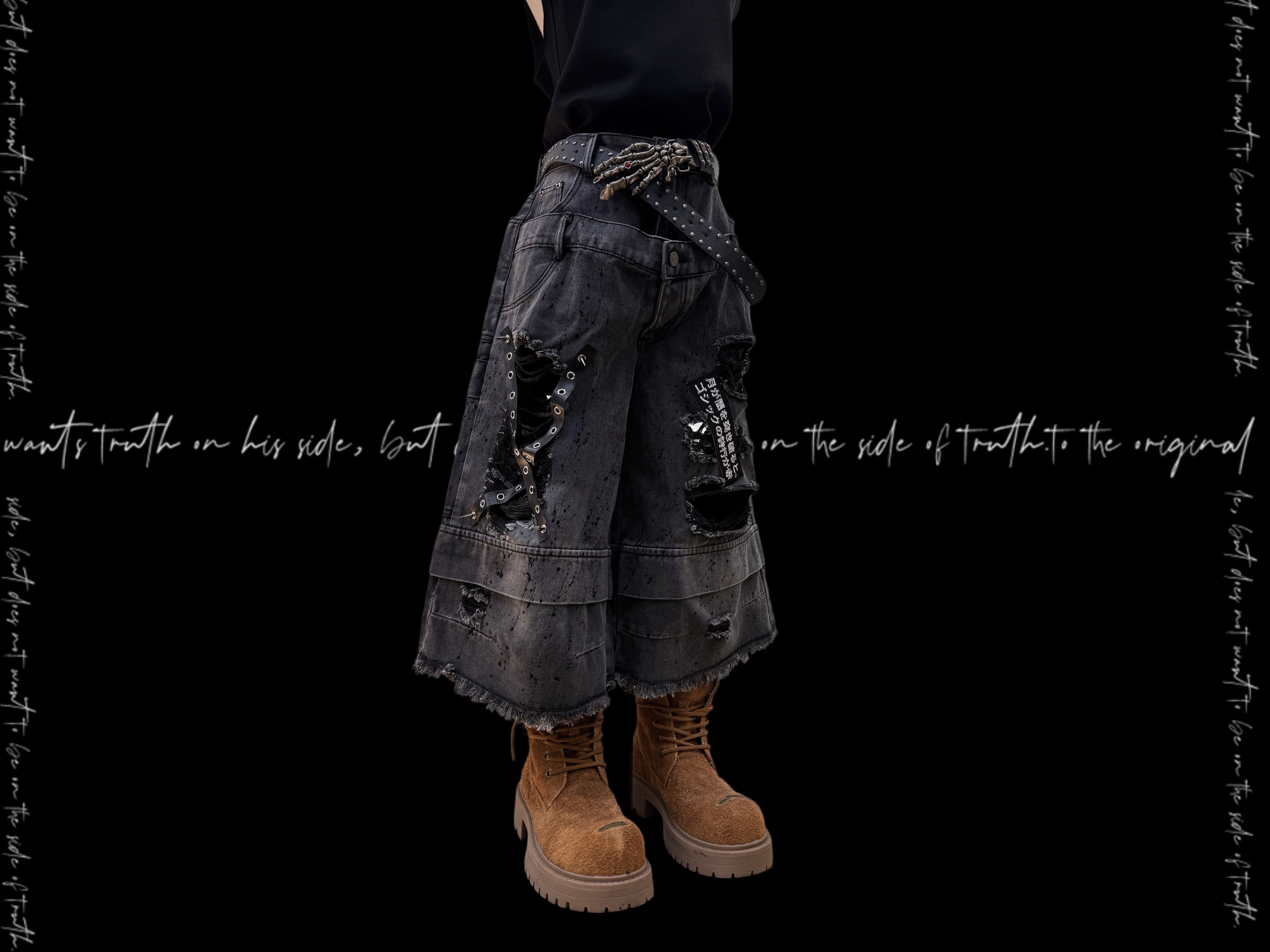 Damage Cutout Raw Hem Wide Leg Denim Jeans & Skull Belt & Cross Belt & Belt Chain WN23828