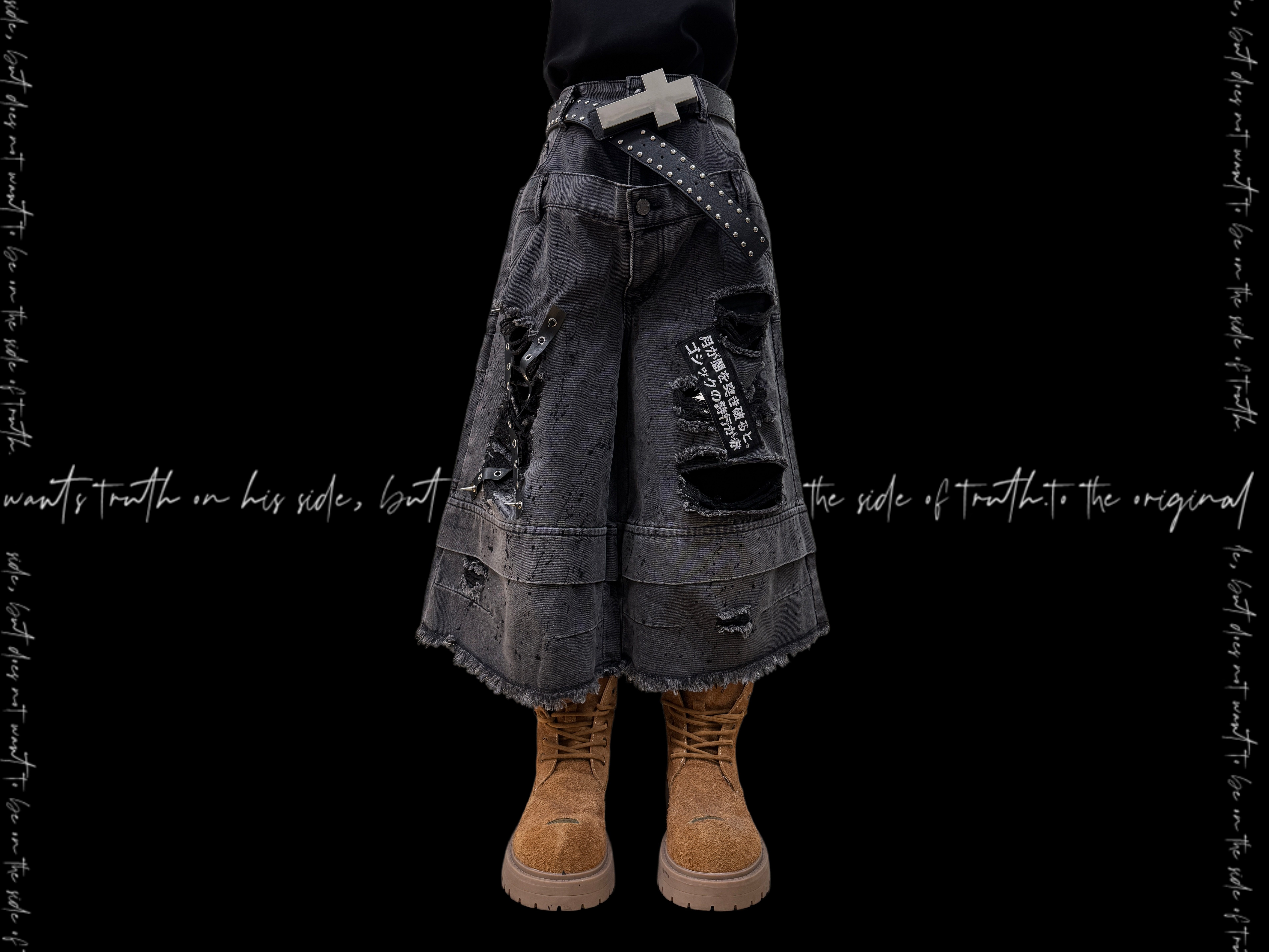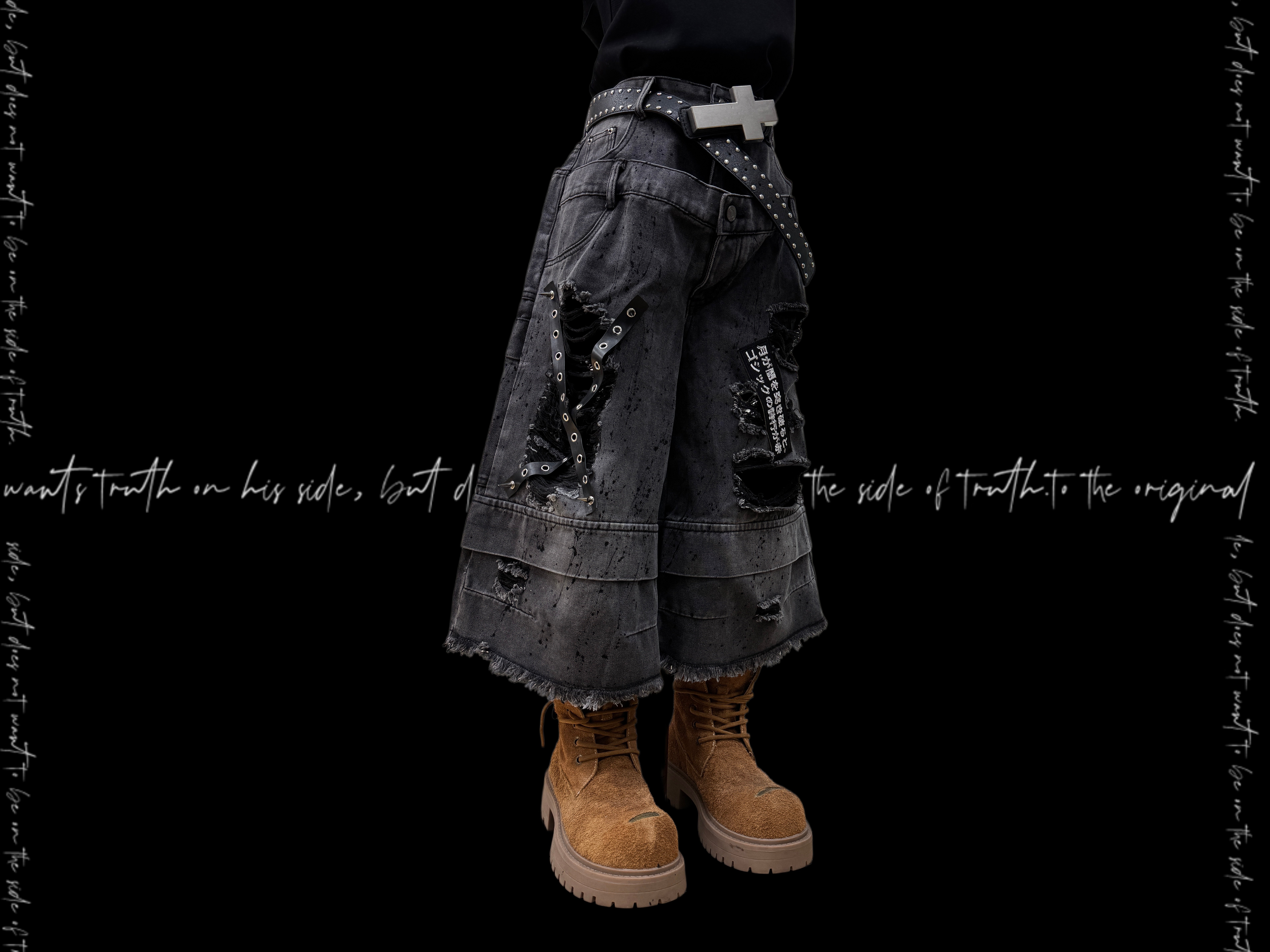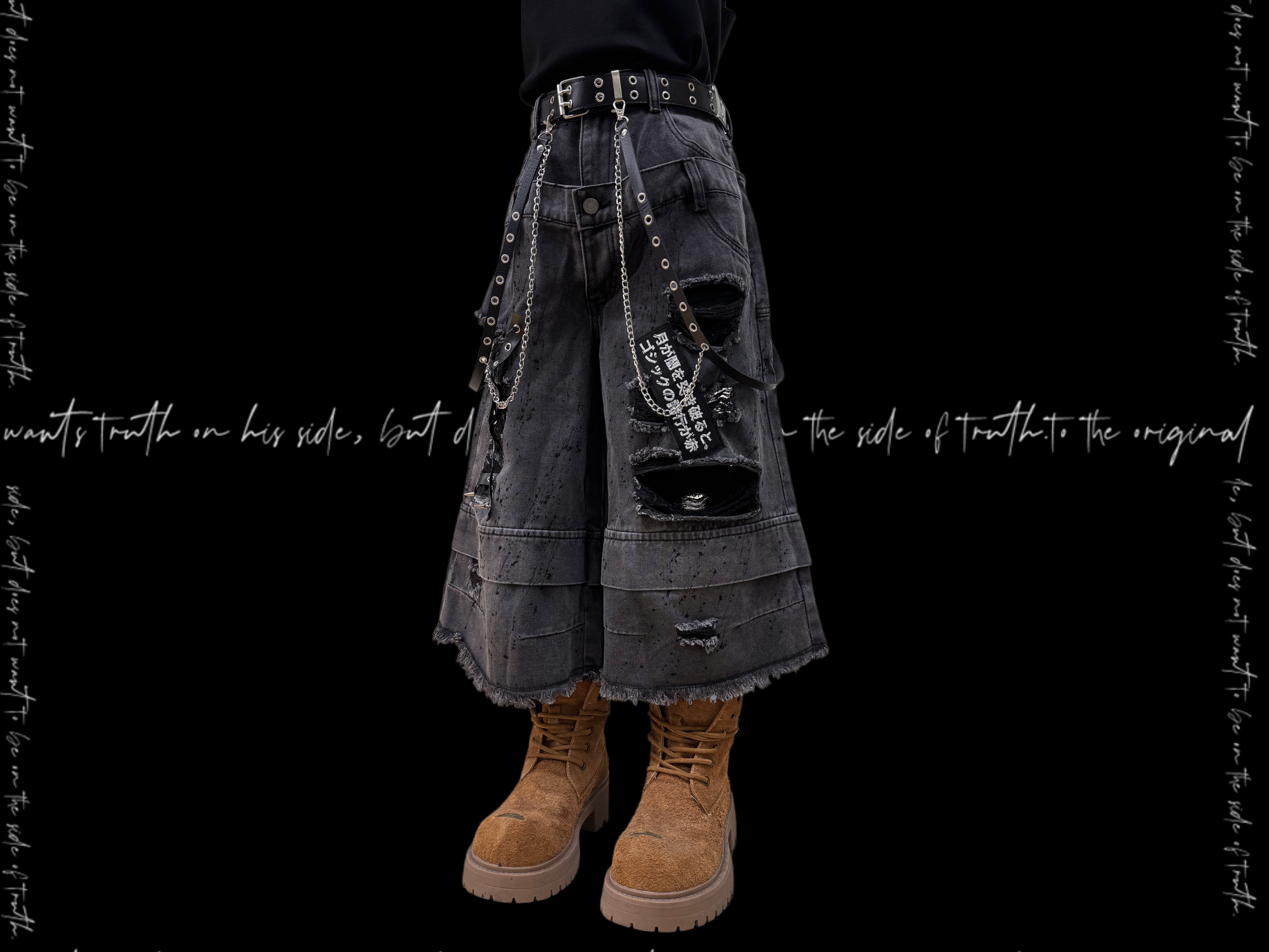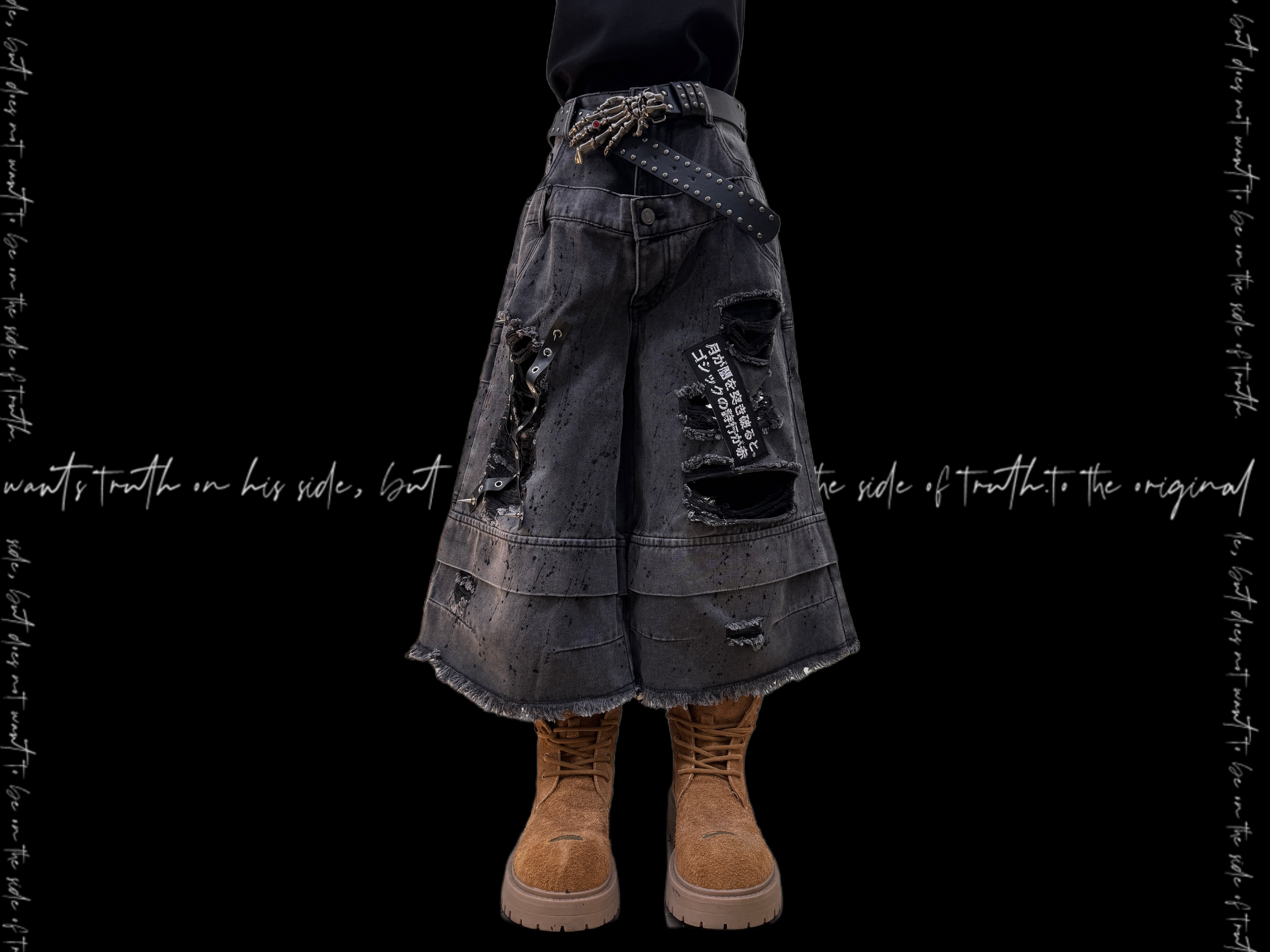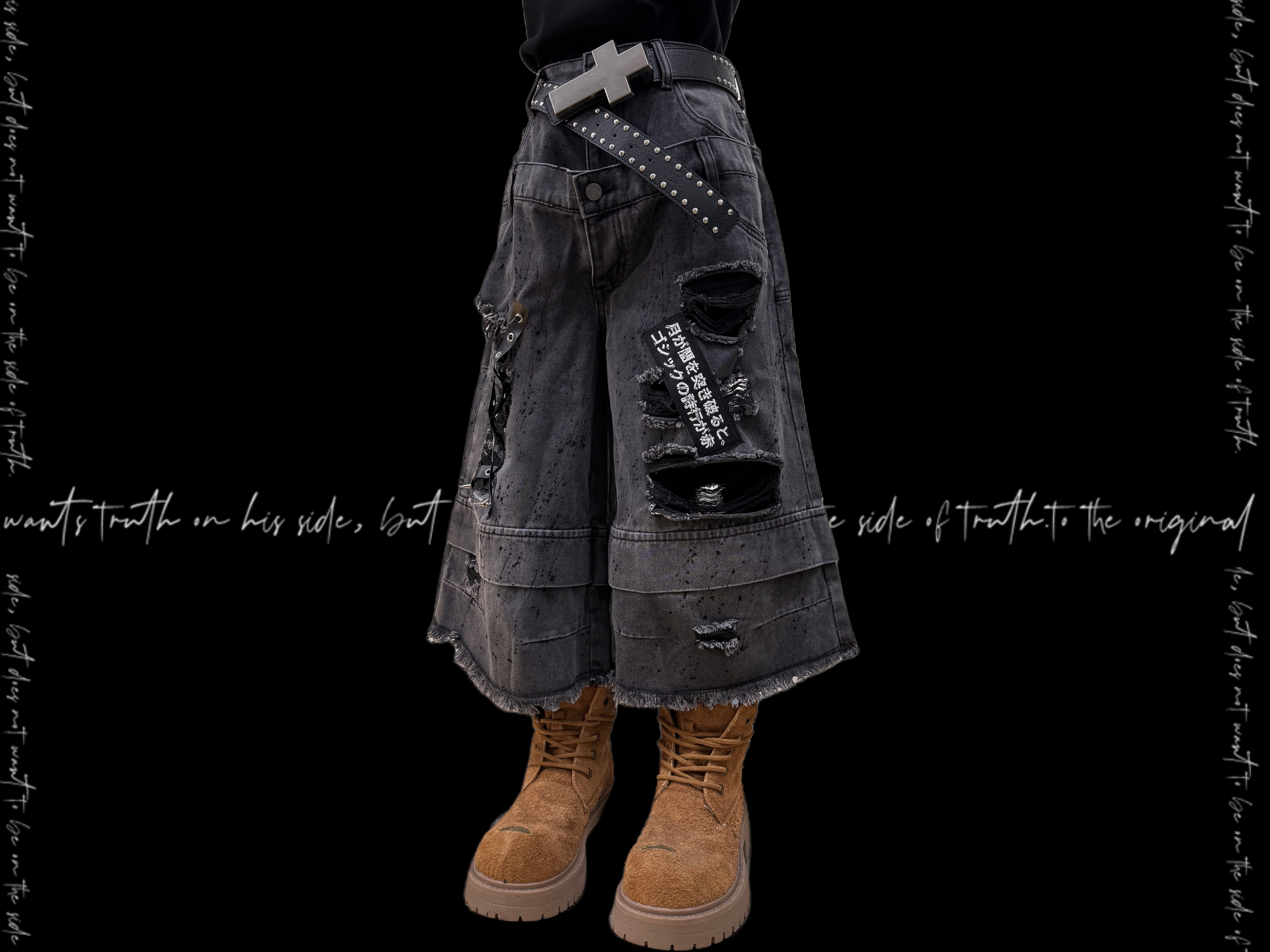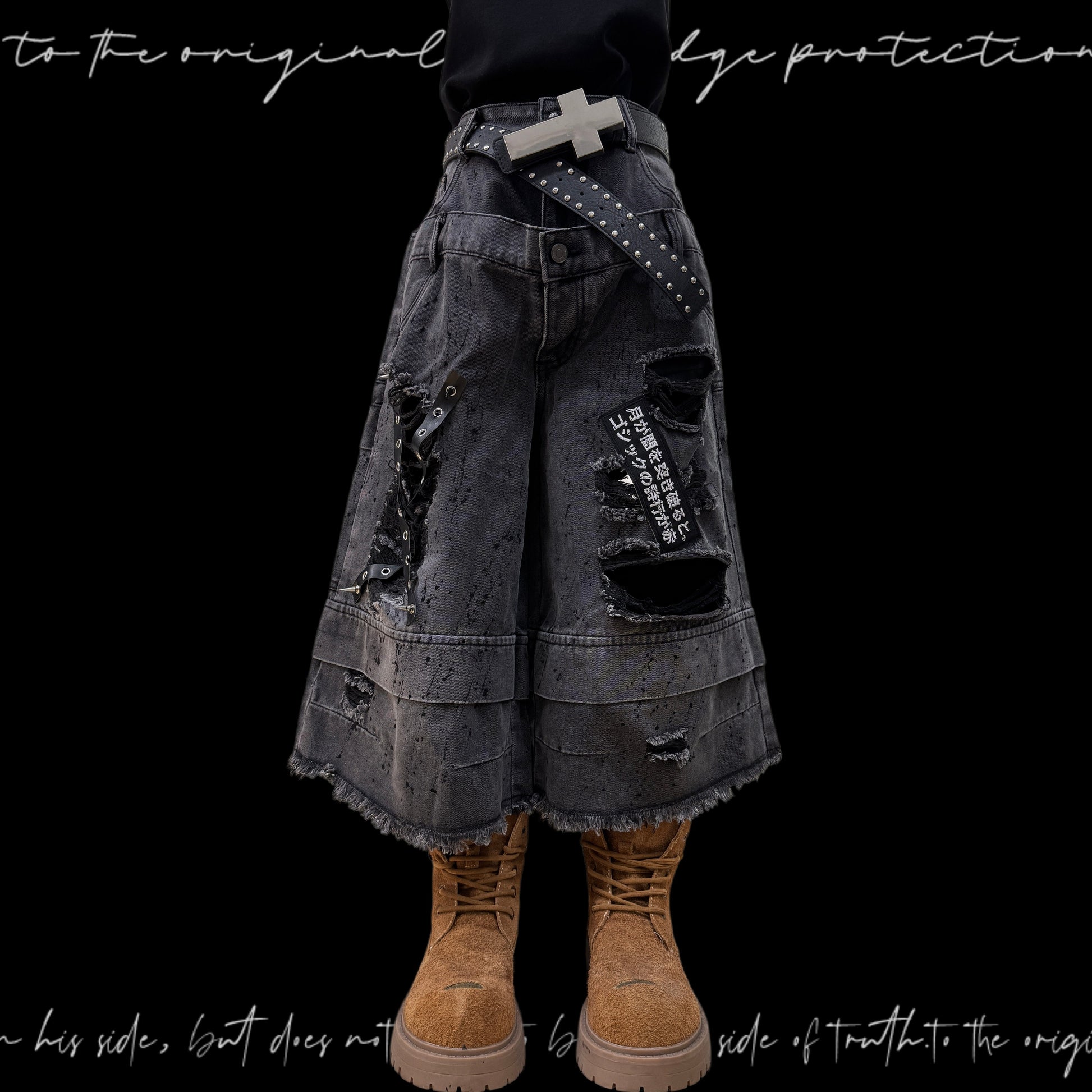 Damage Cutout Raw Hem Wide Leg Denim Jeans & Skull Belt & Cross Belt & Belt Chain WN23828