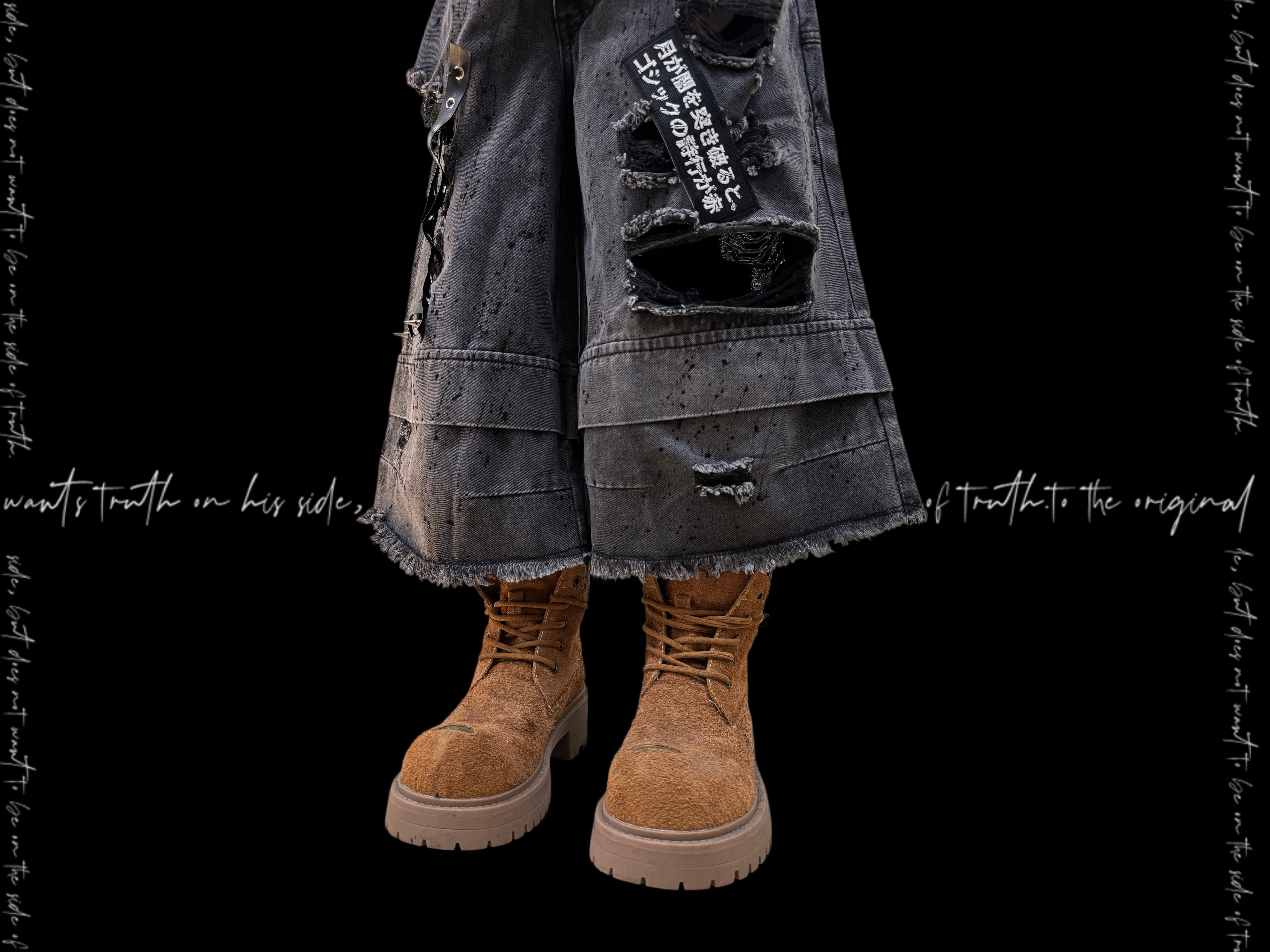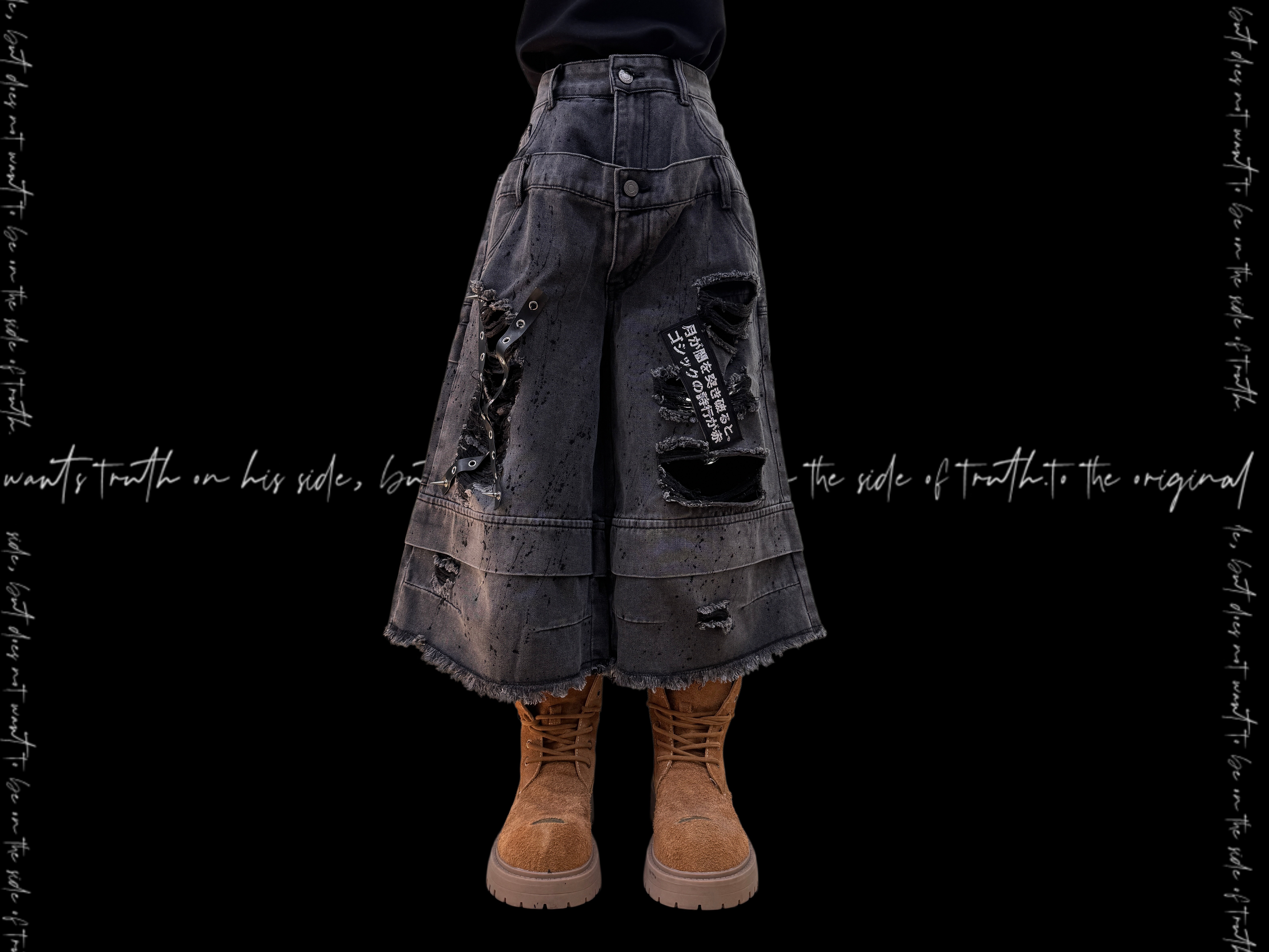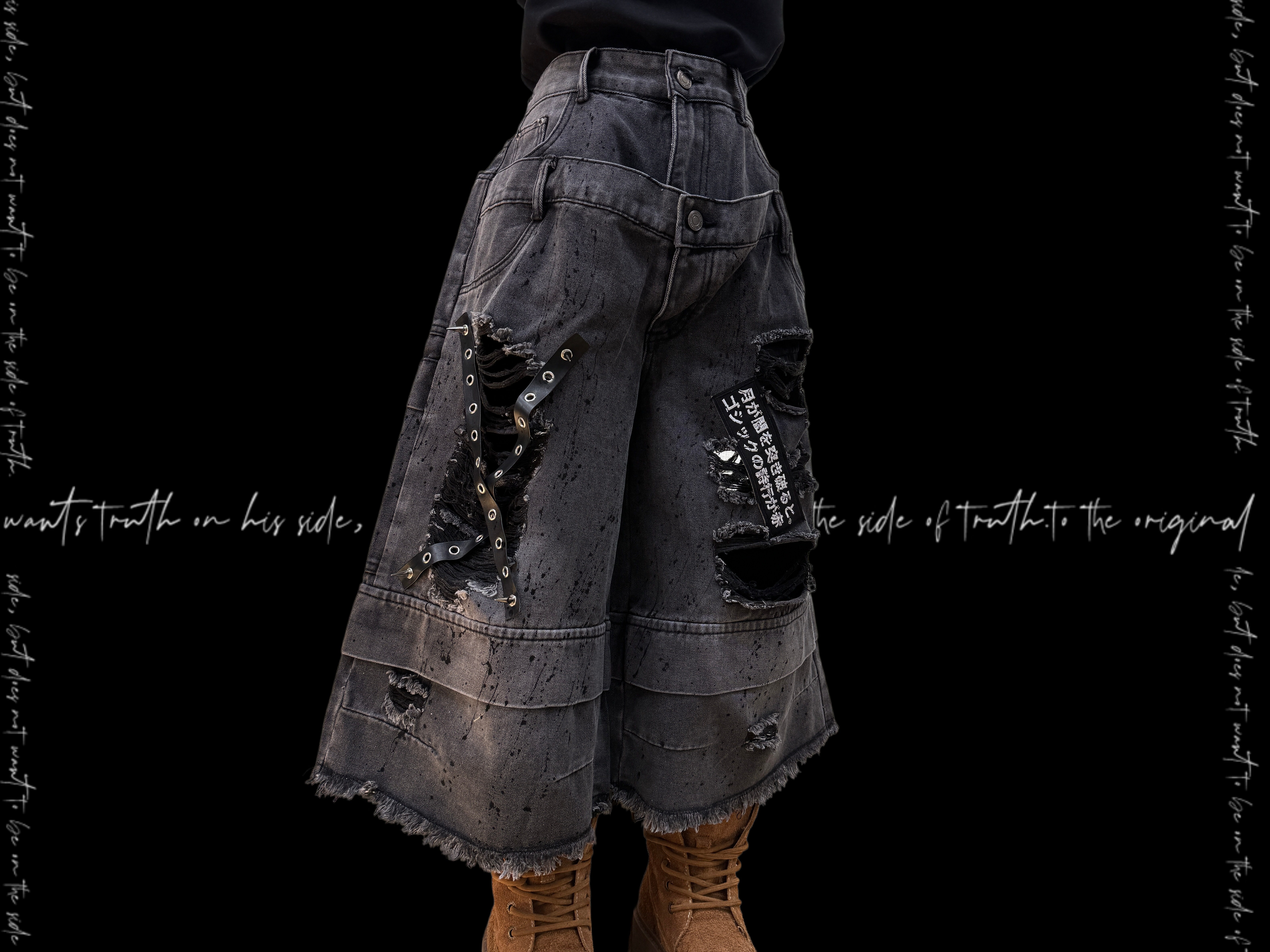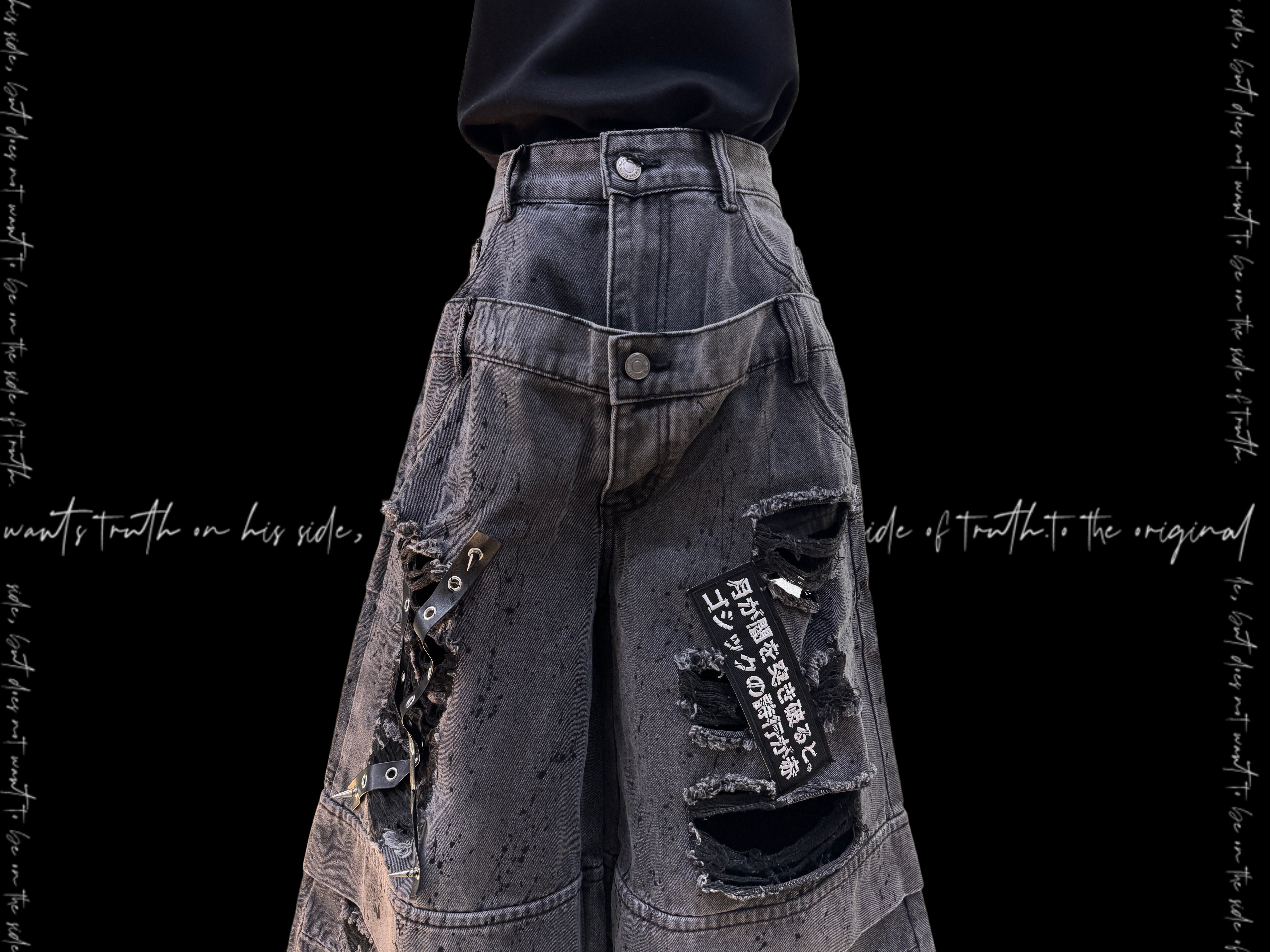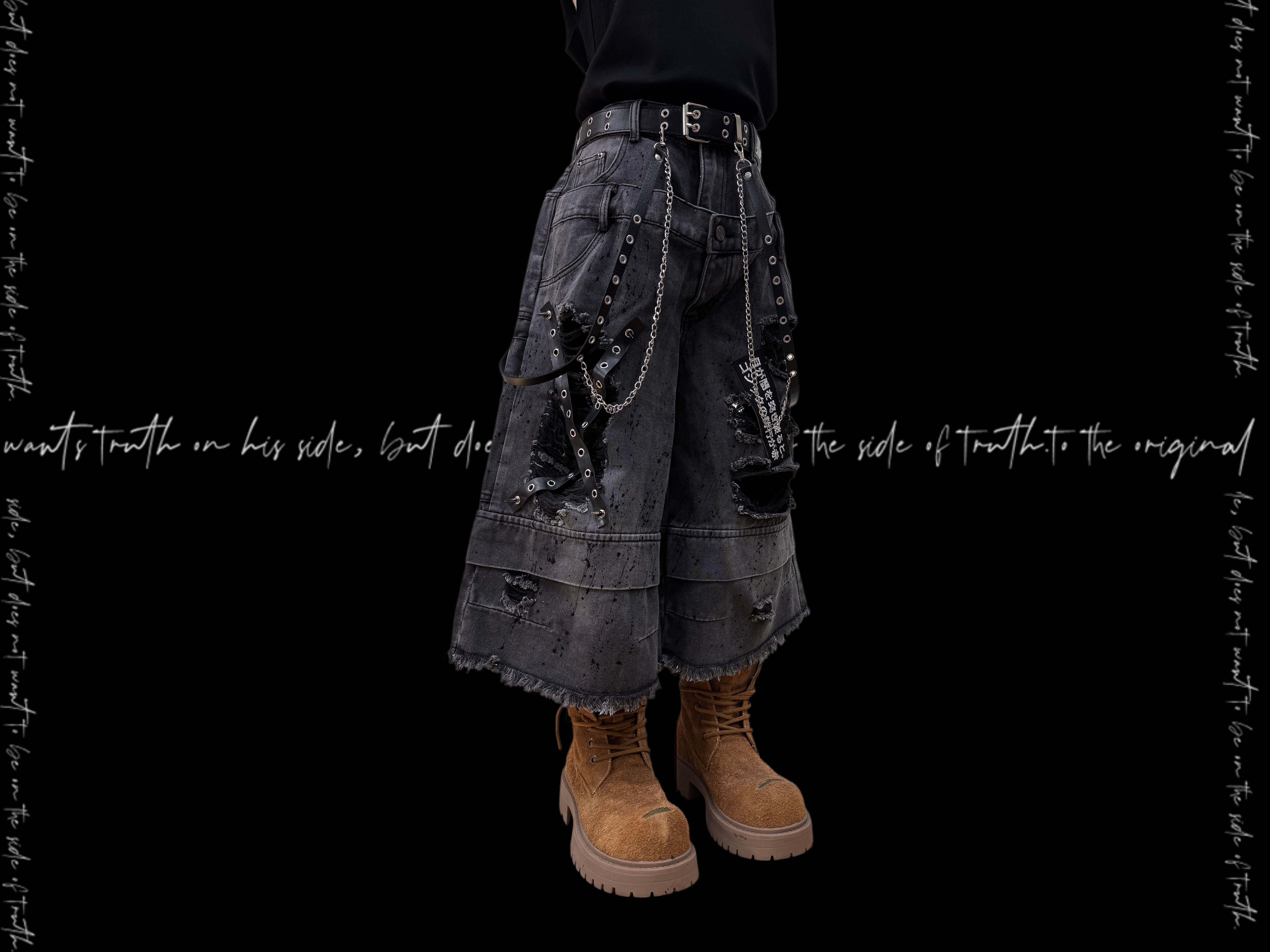 Damage Cutout Raw Hem Wide Leg Denim Jeans & Skull Belt & Cross Belt & Belt Chain WN23828