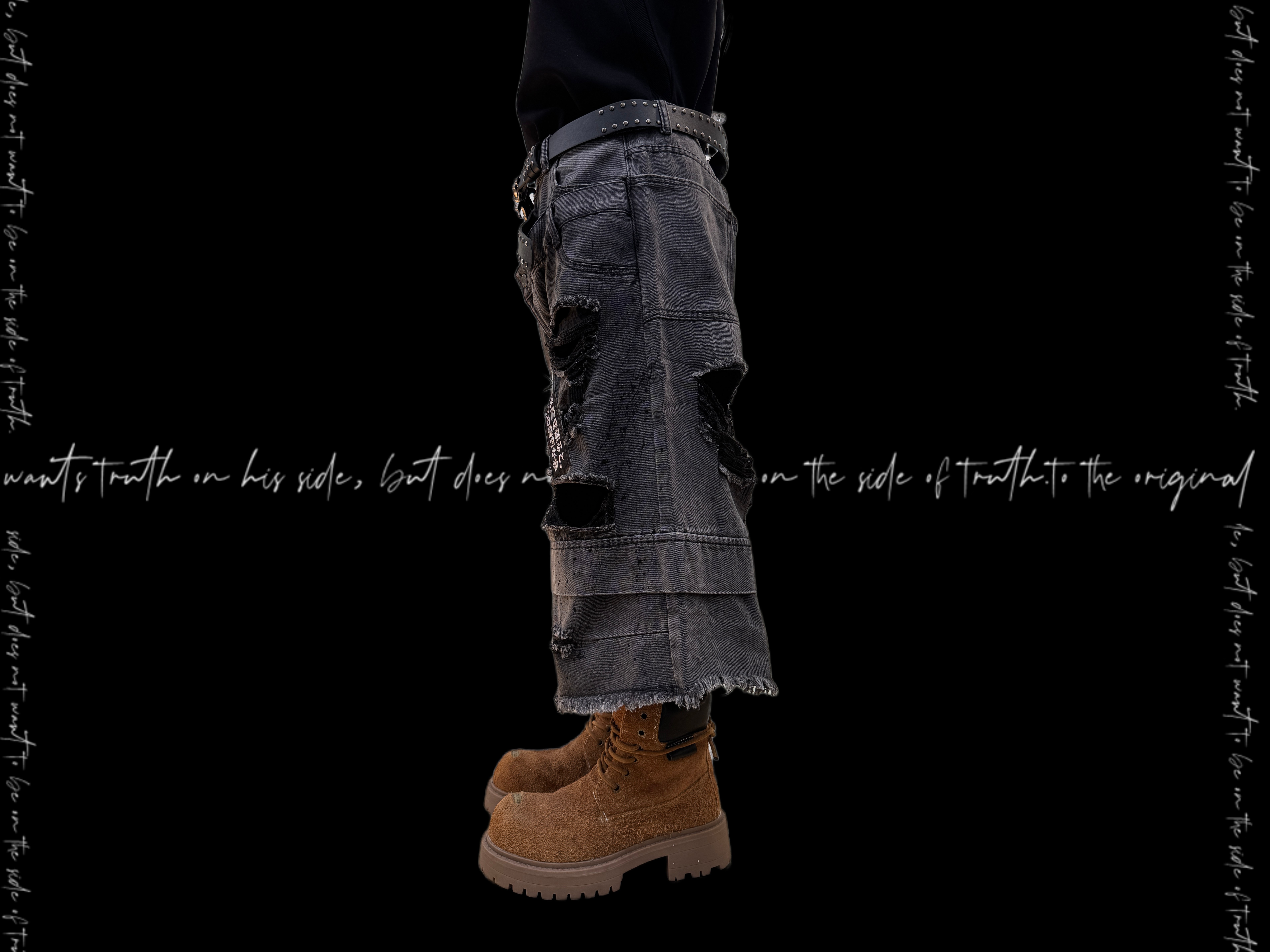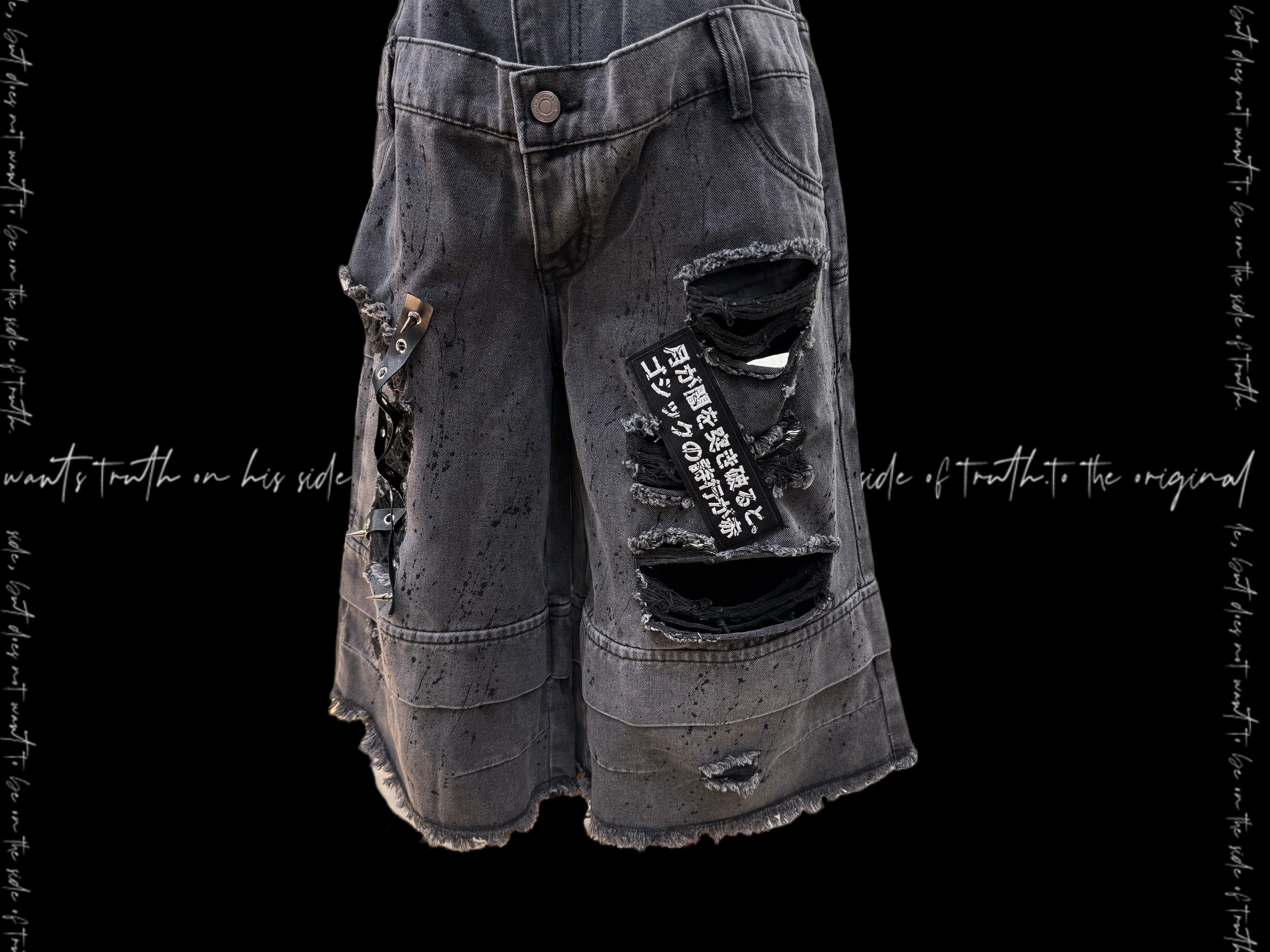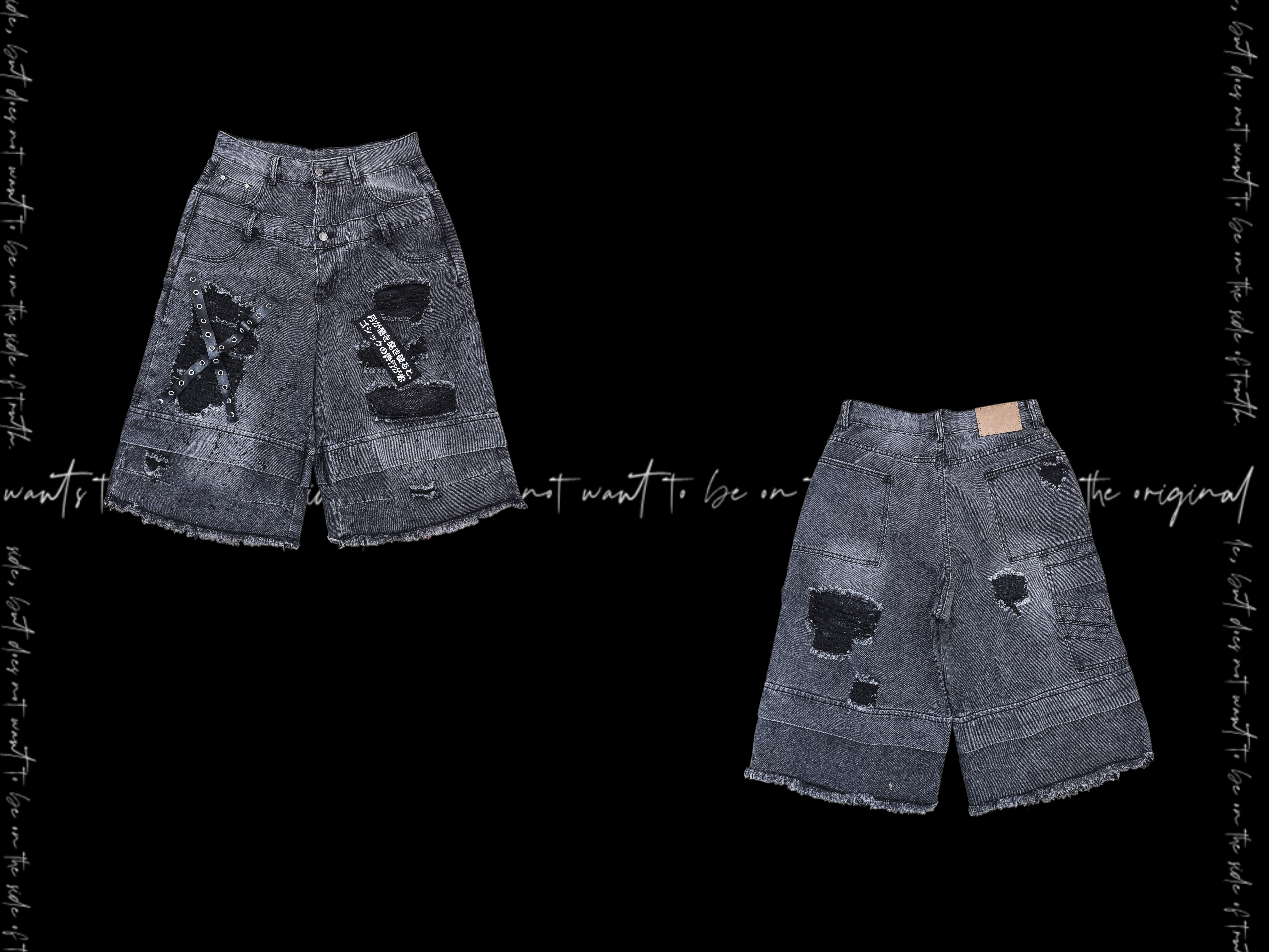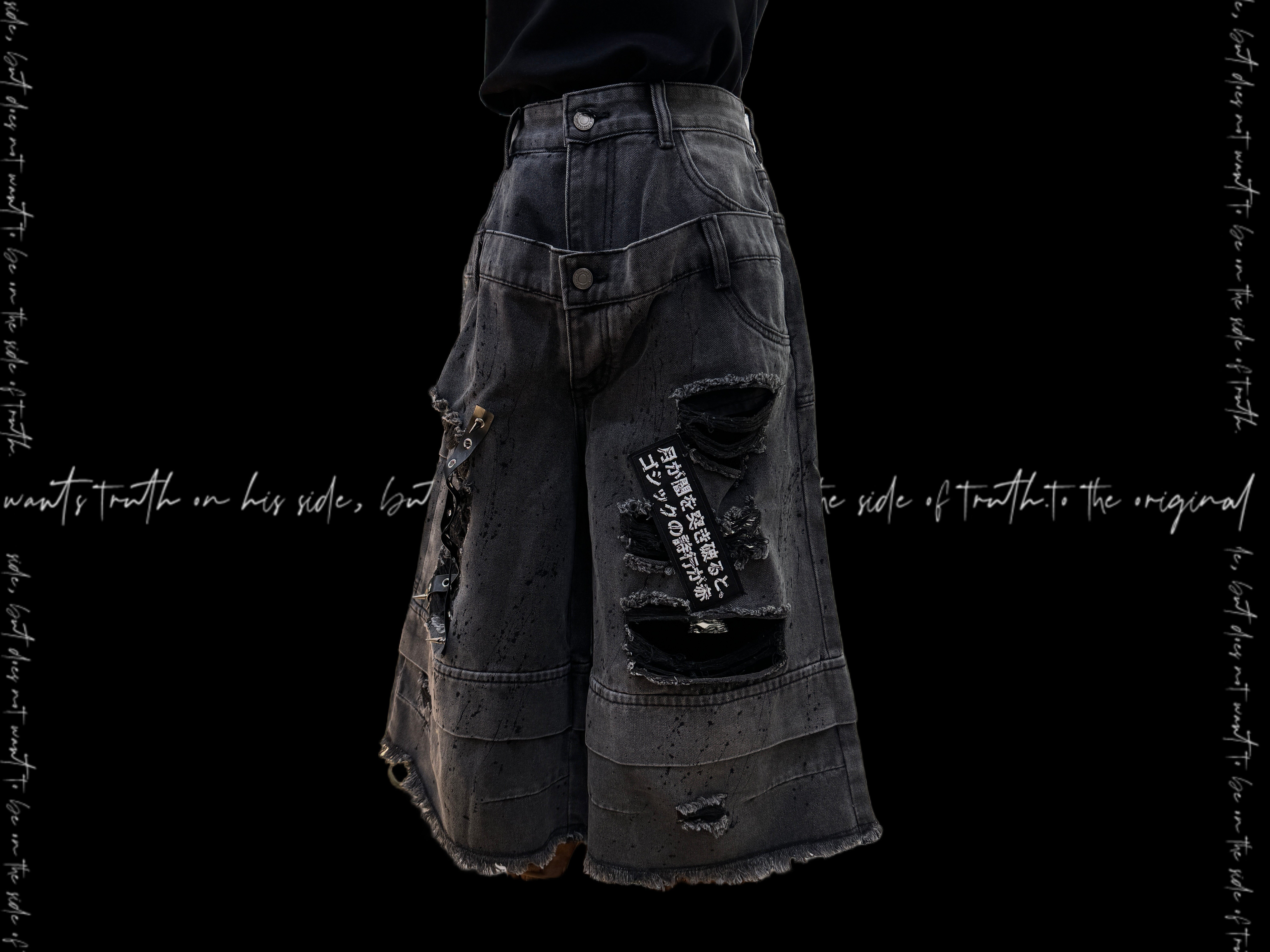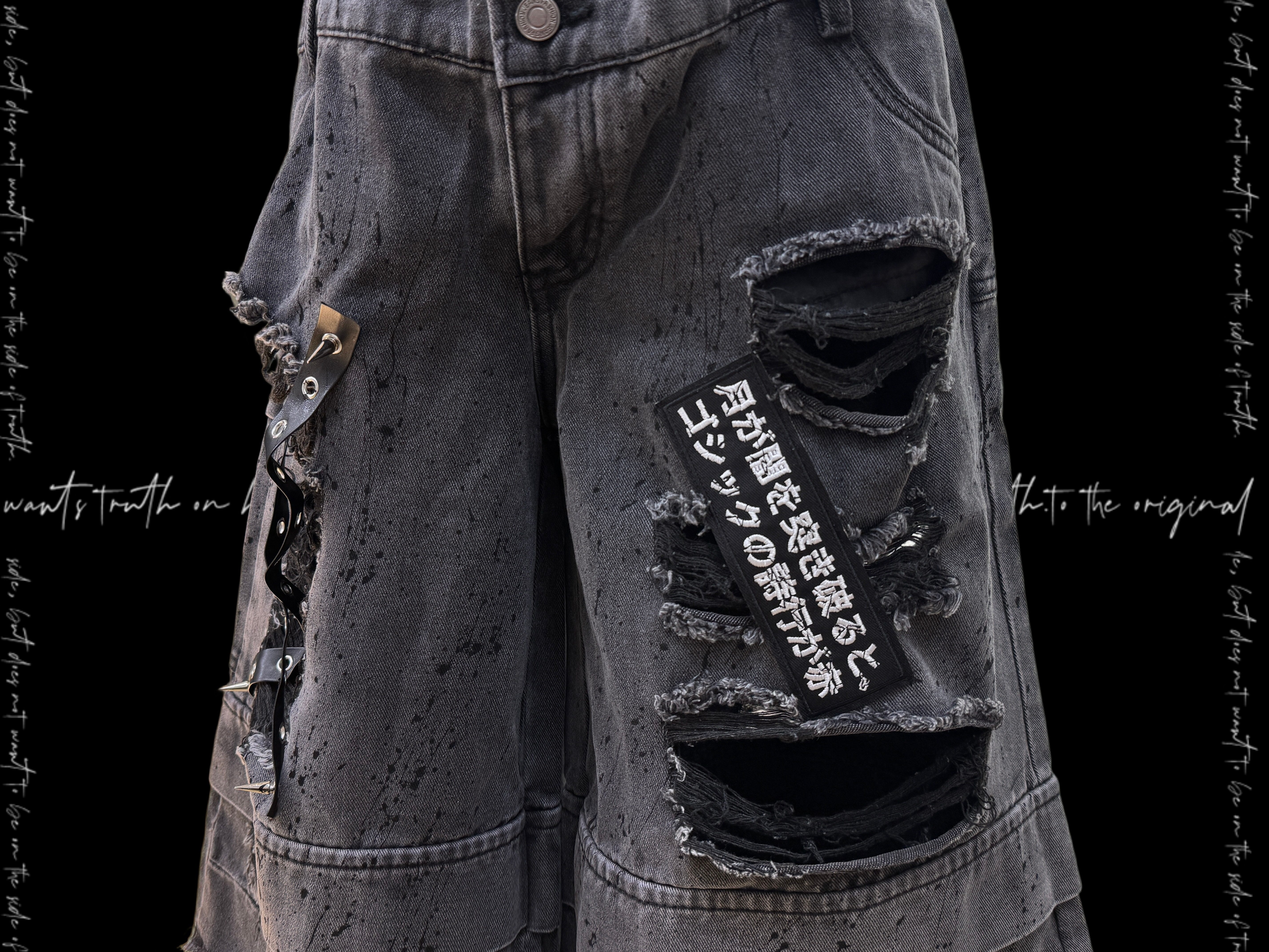 Damage Cutout Raw Hem Wide Leg Denim Jeans & Skull Belt & Cross Belt & Belt Chain WN23828