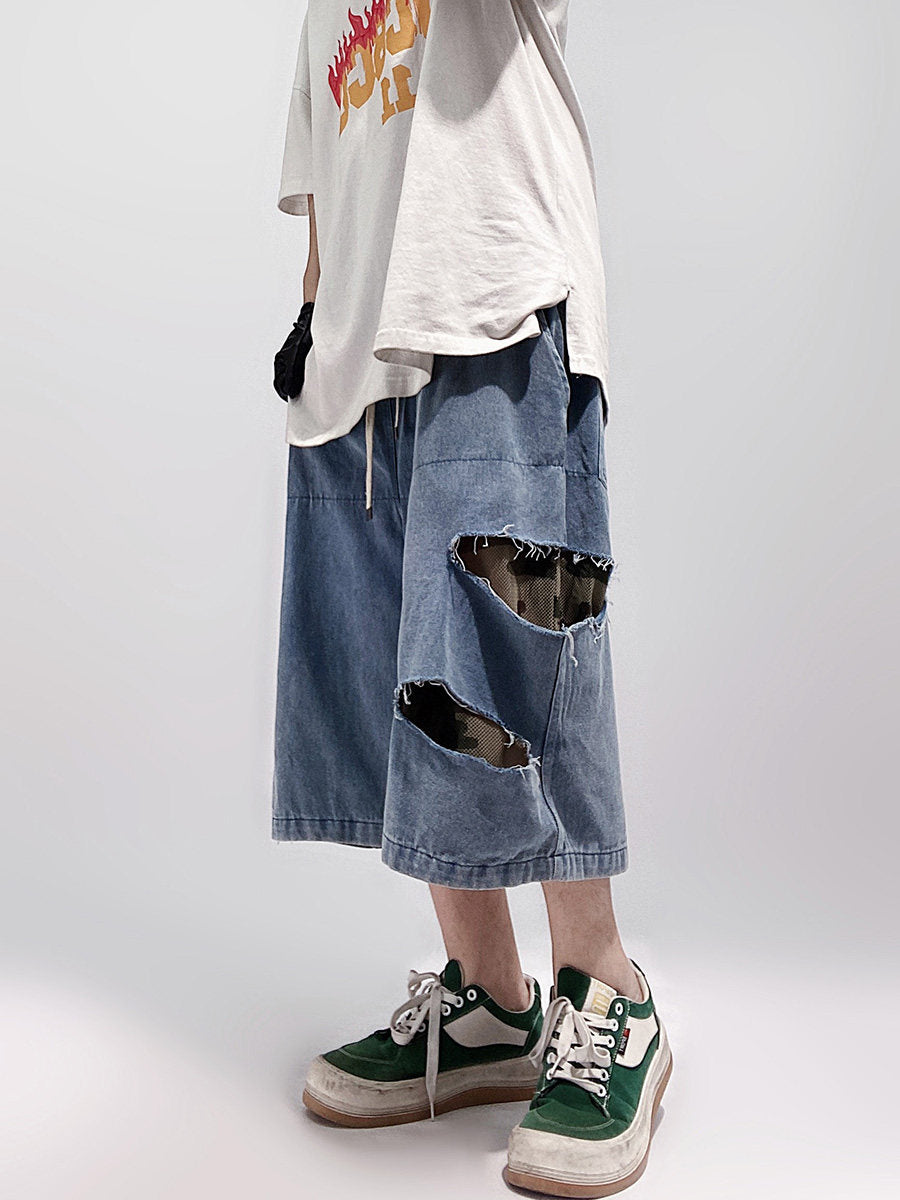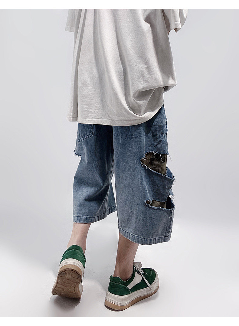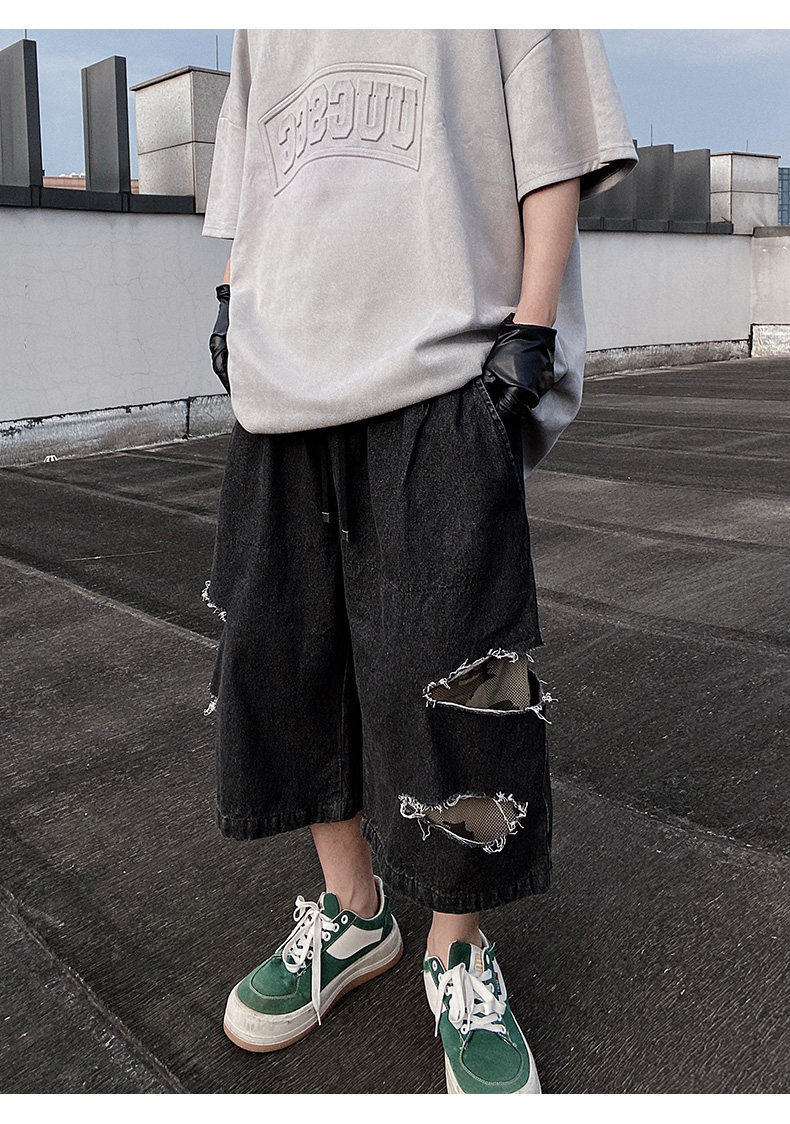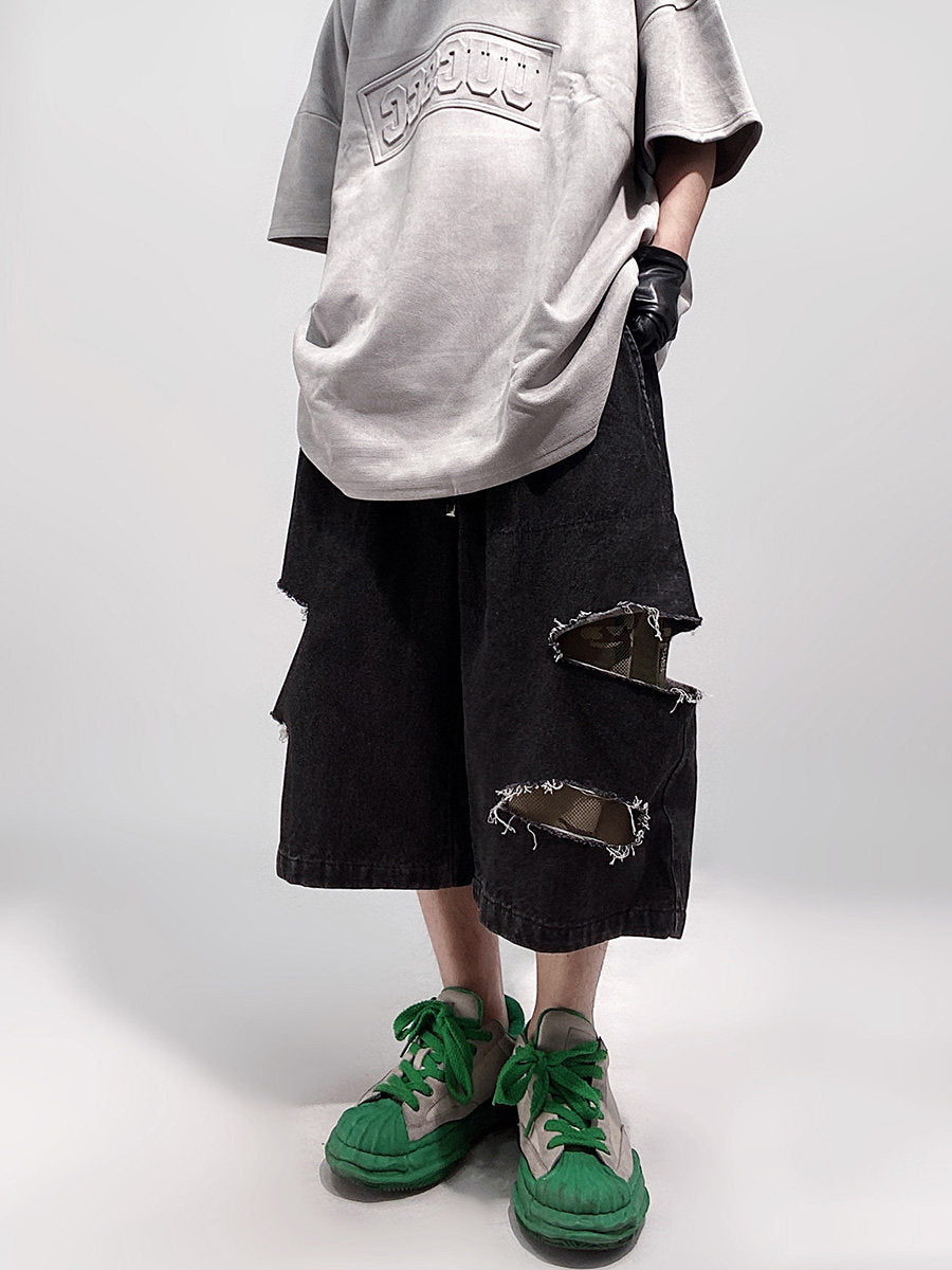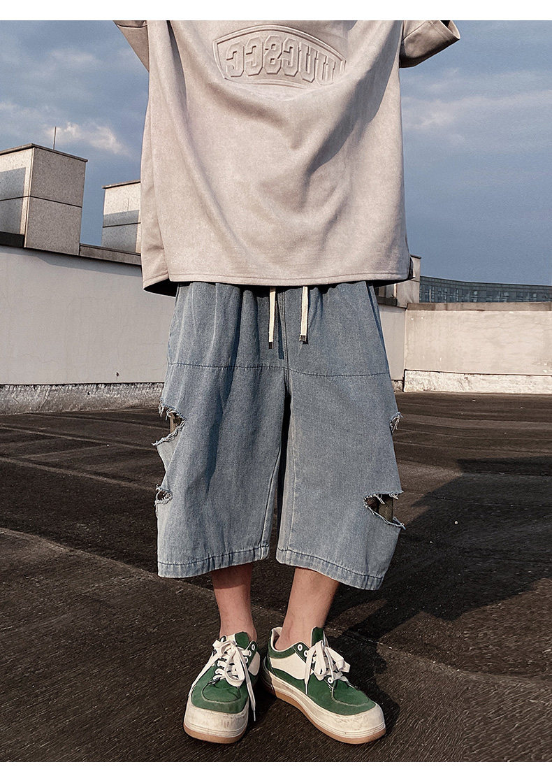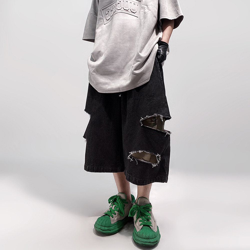 Damage Wide Leg Denim Half Jeans WN24013