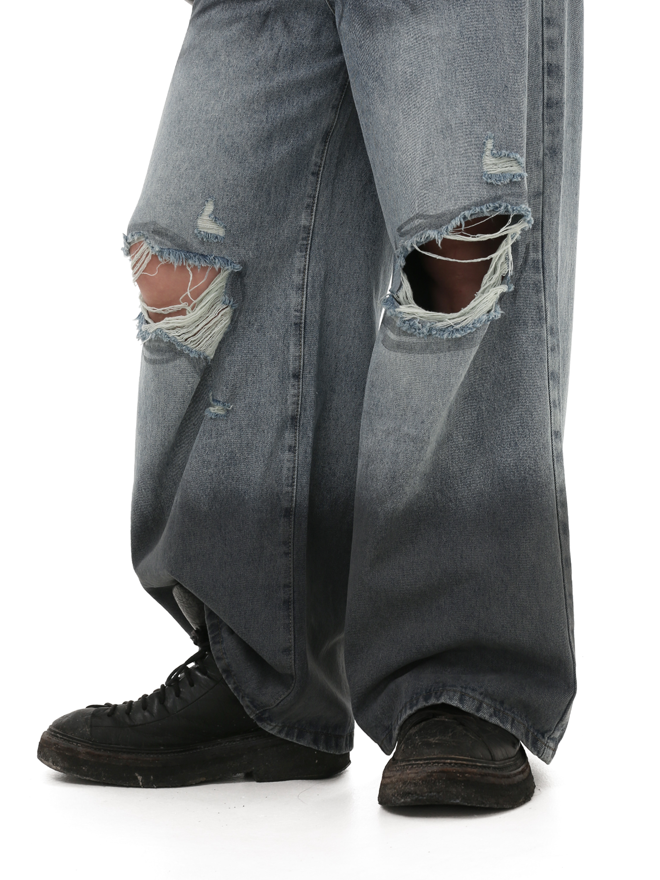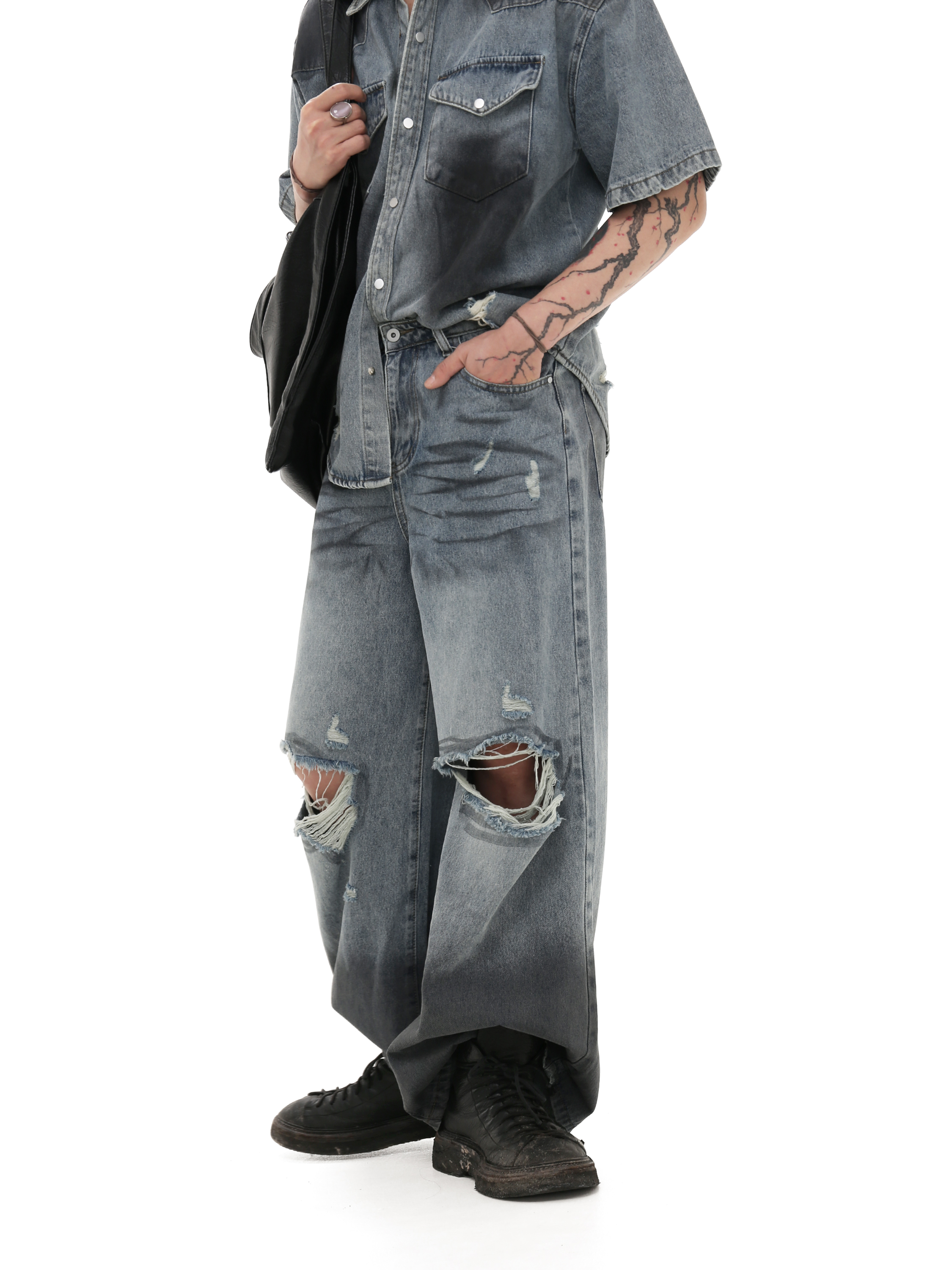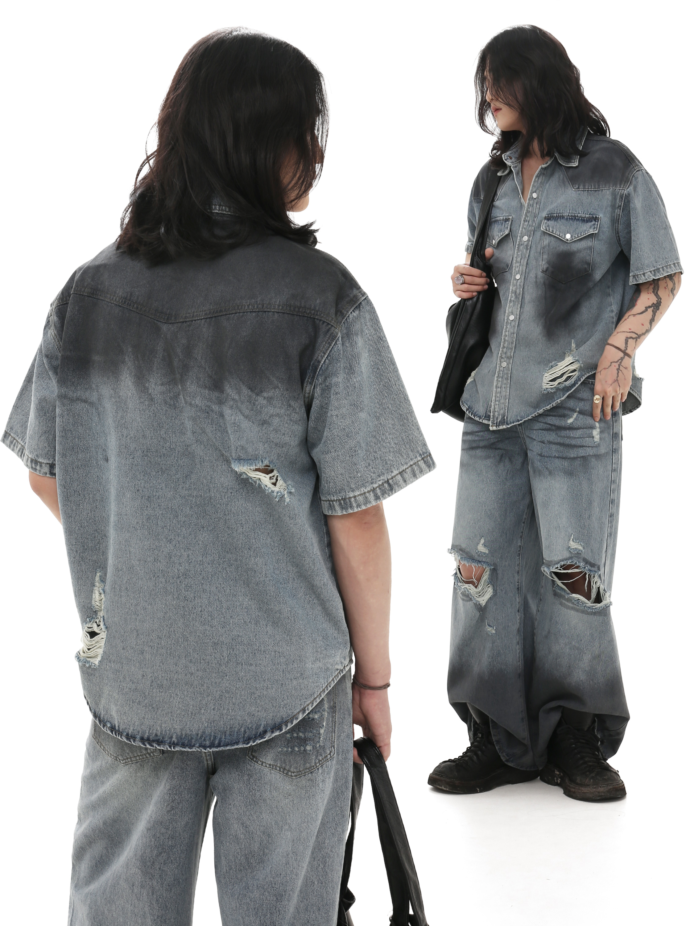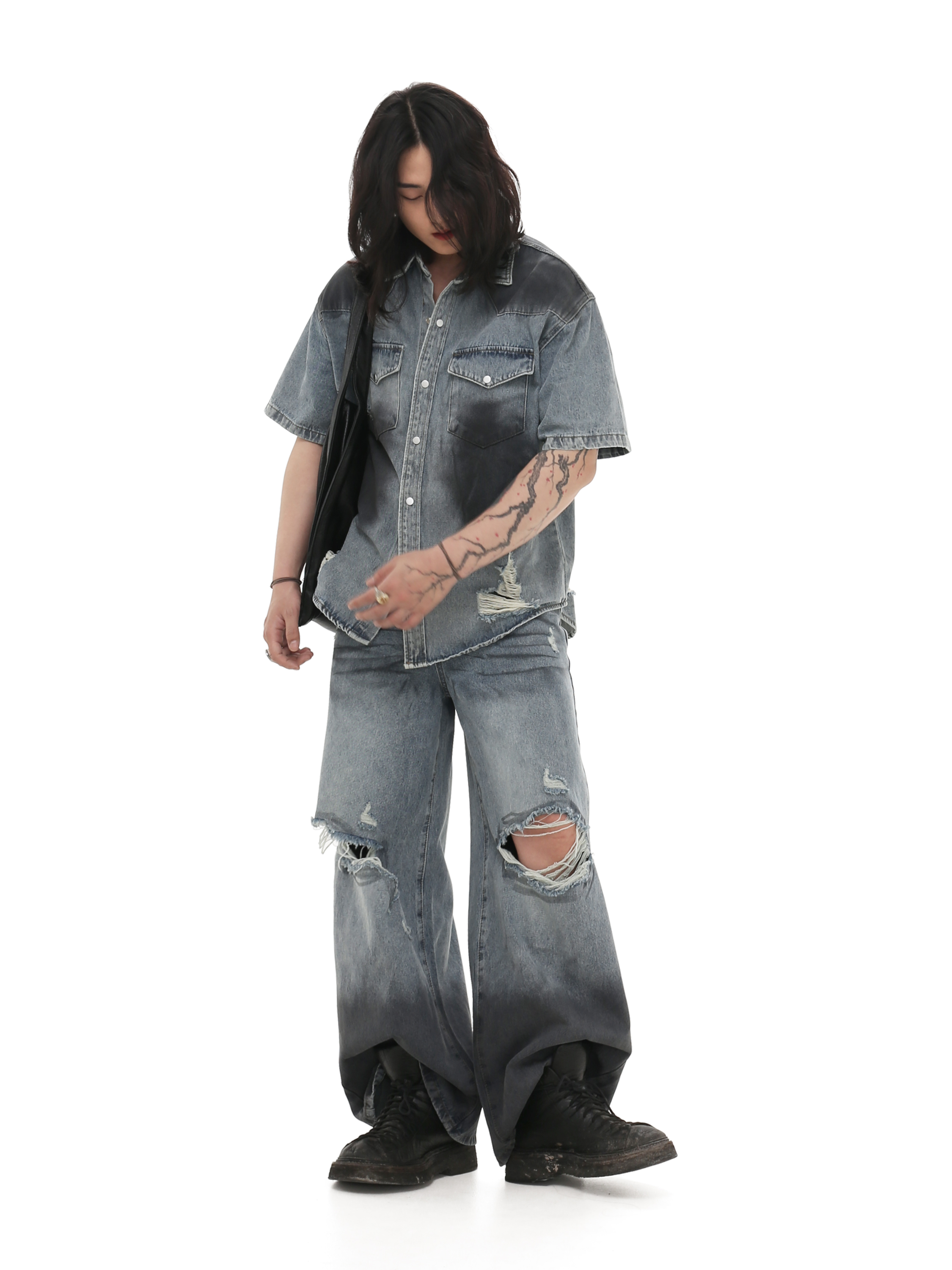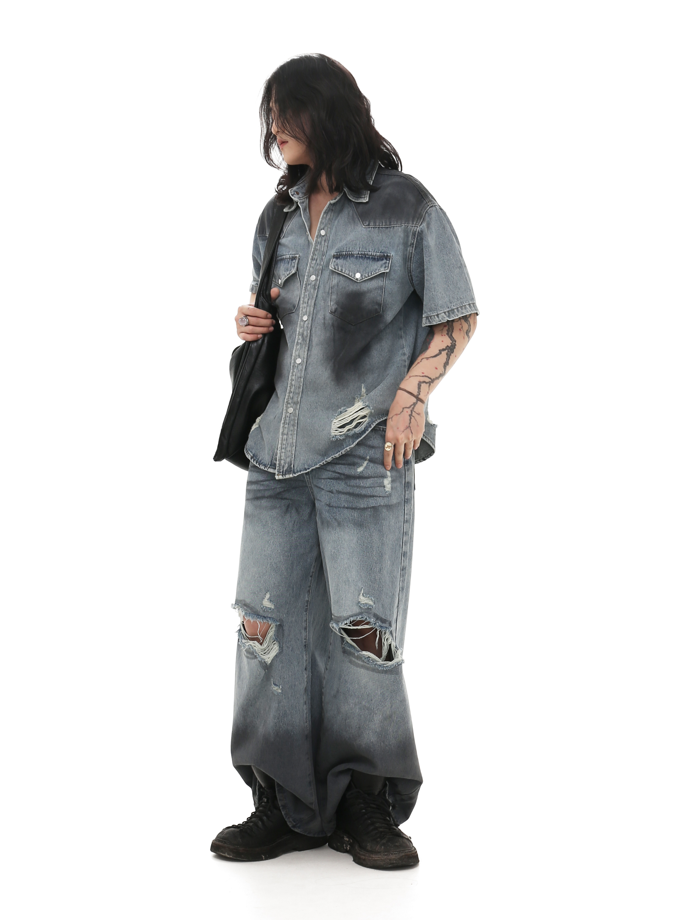Damaged Denim Short Sleeve Shirt & Denim Jeans Setup WN7982