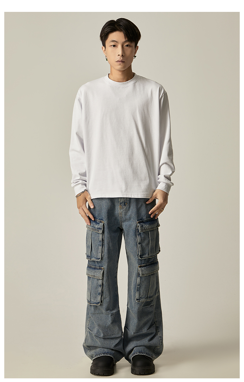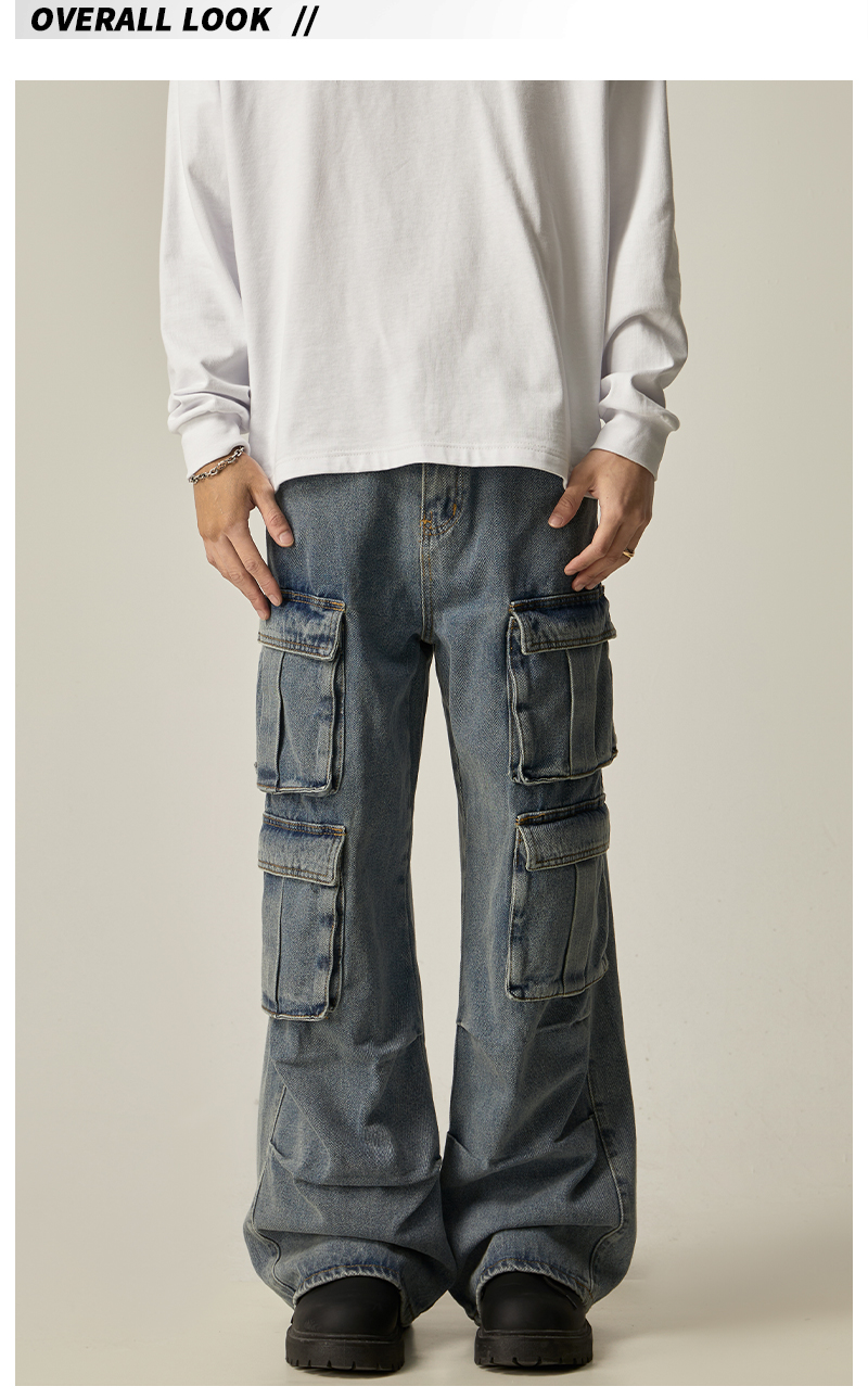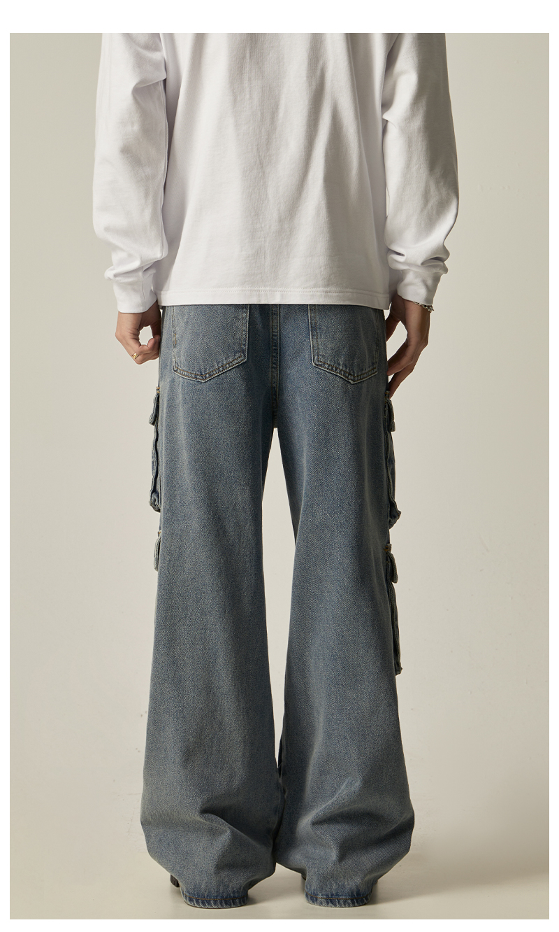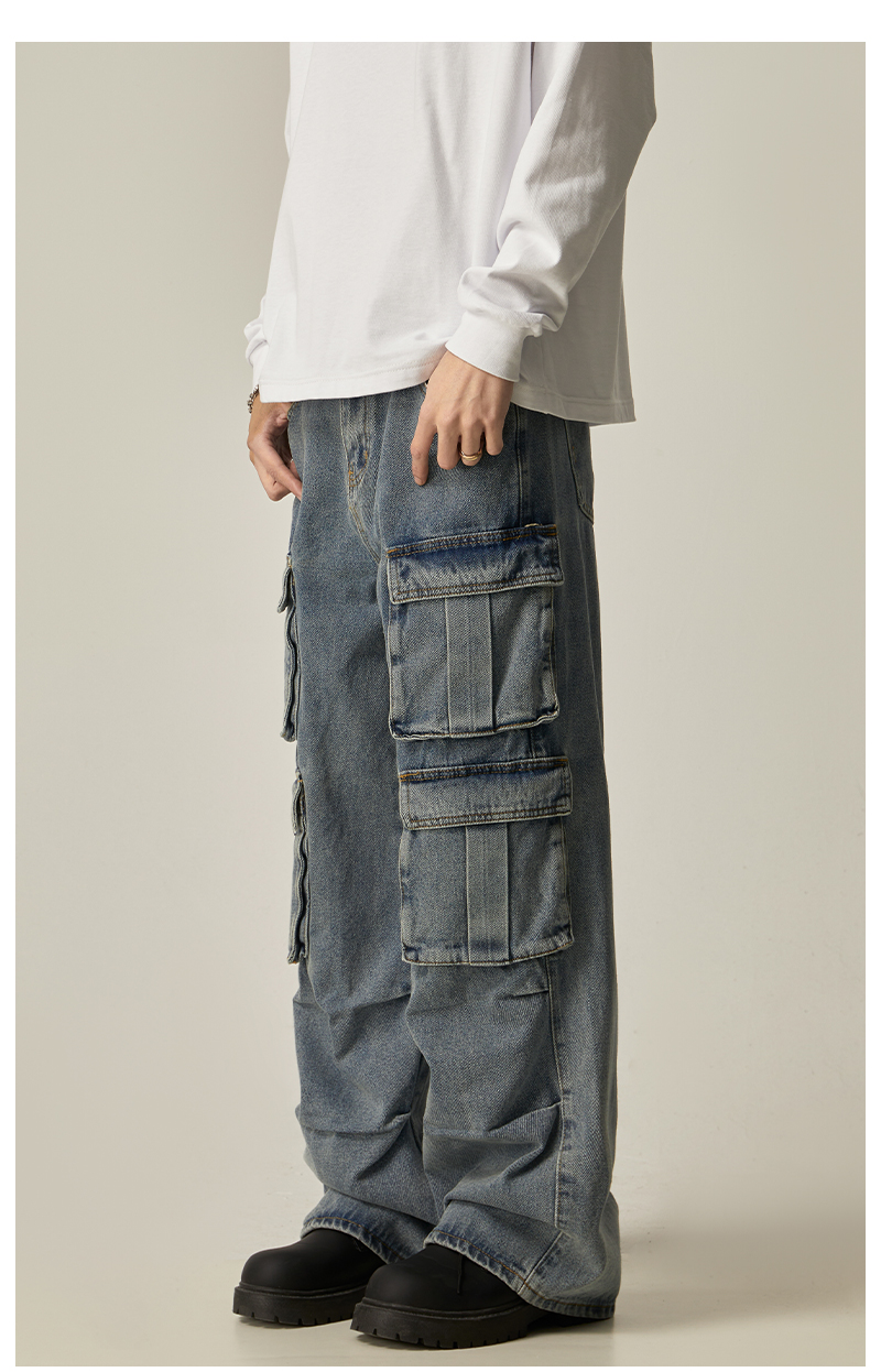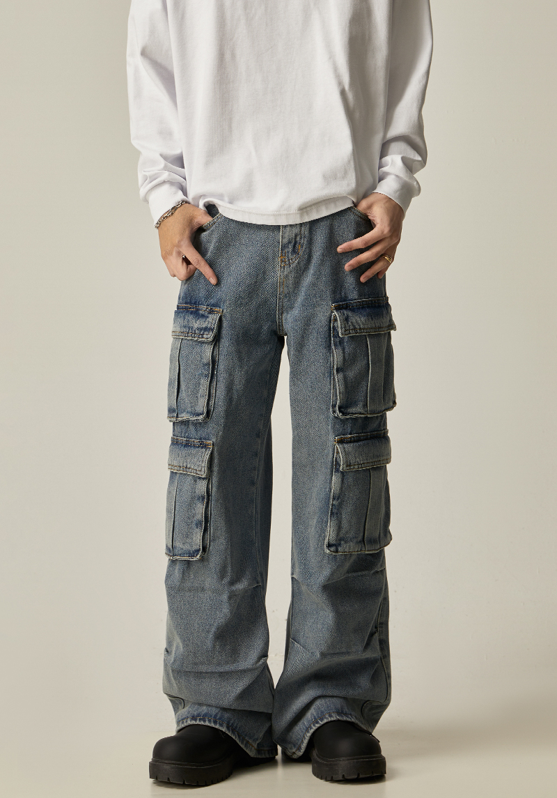 Washed Multi Pocket Straight Cargo Denim Jeans WN8978