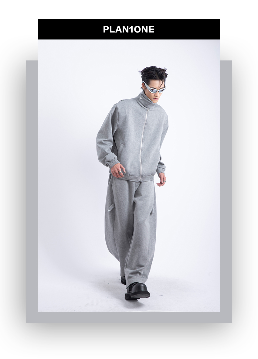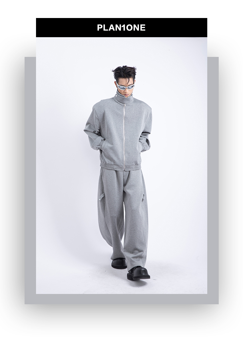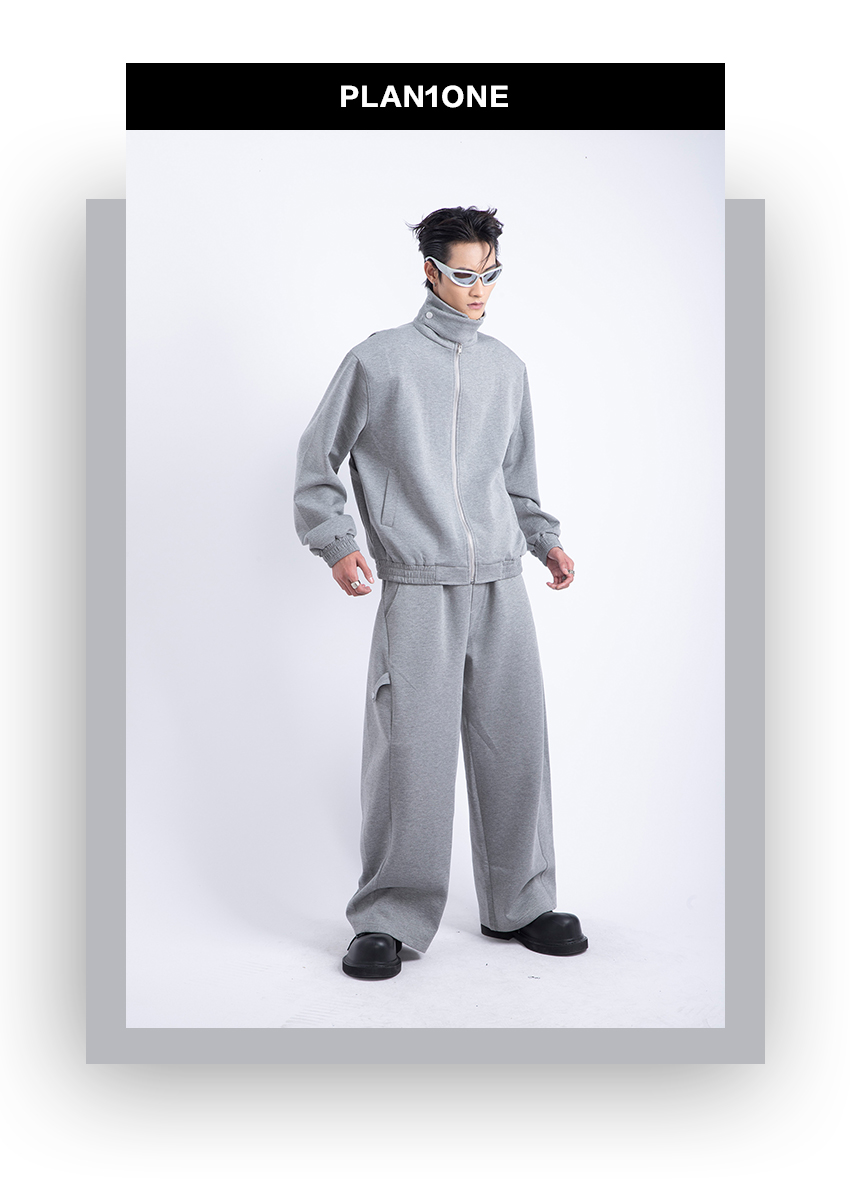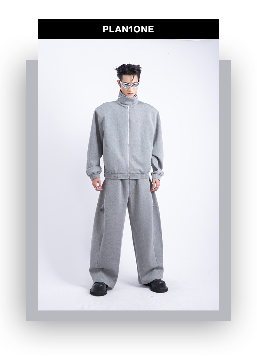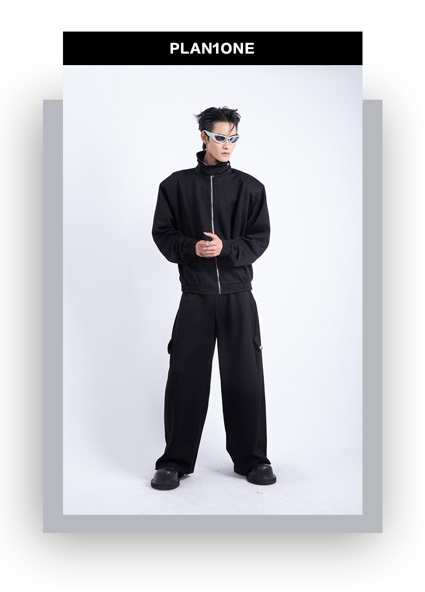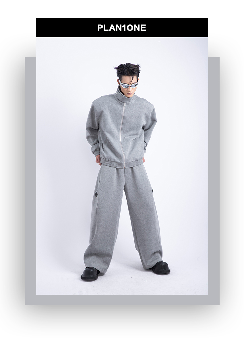 Stand Neck Shoulder Pad Zipper Jacket & Wide Leg Sweatpants Setup WN9259