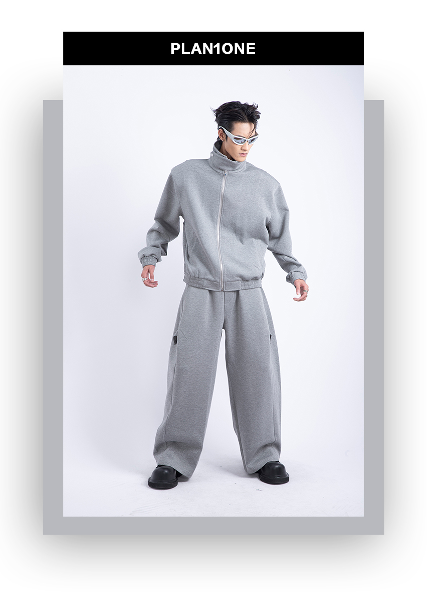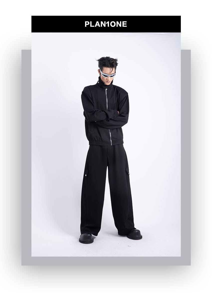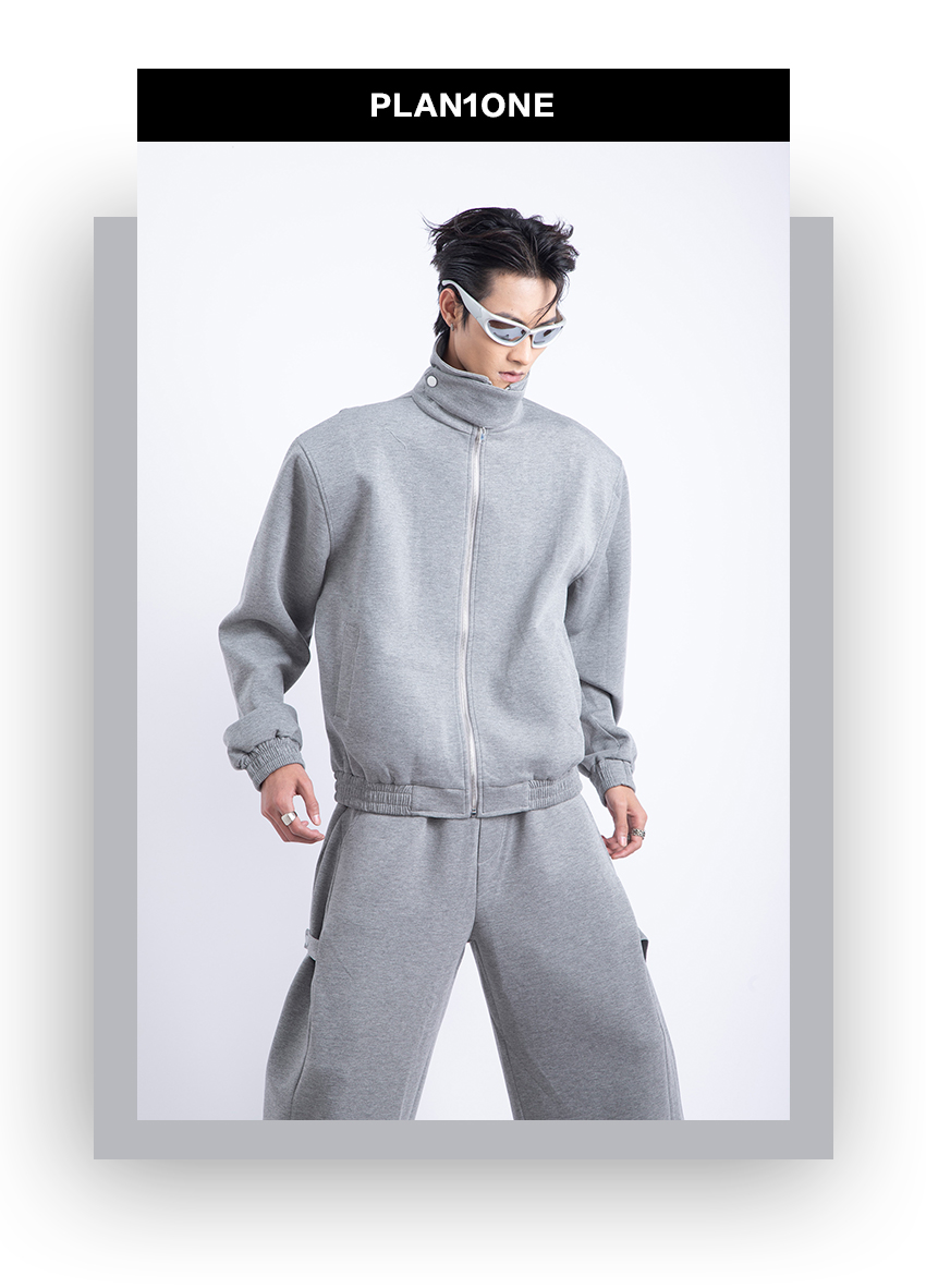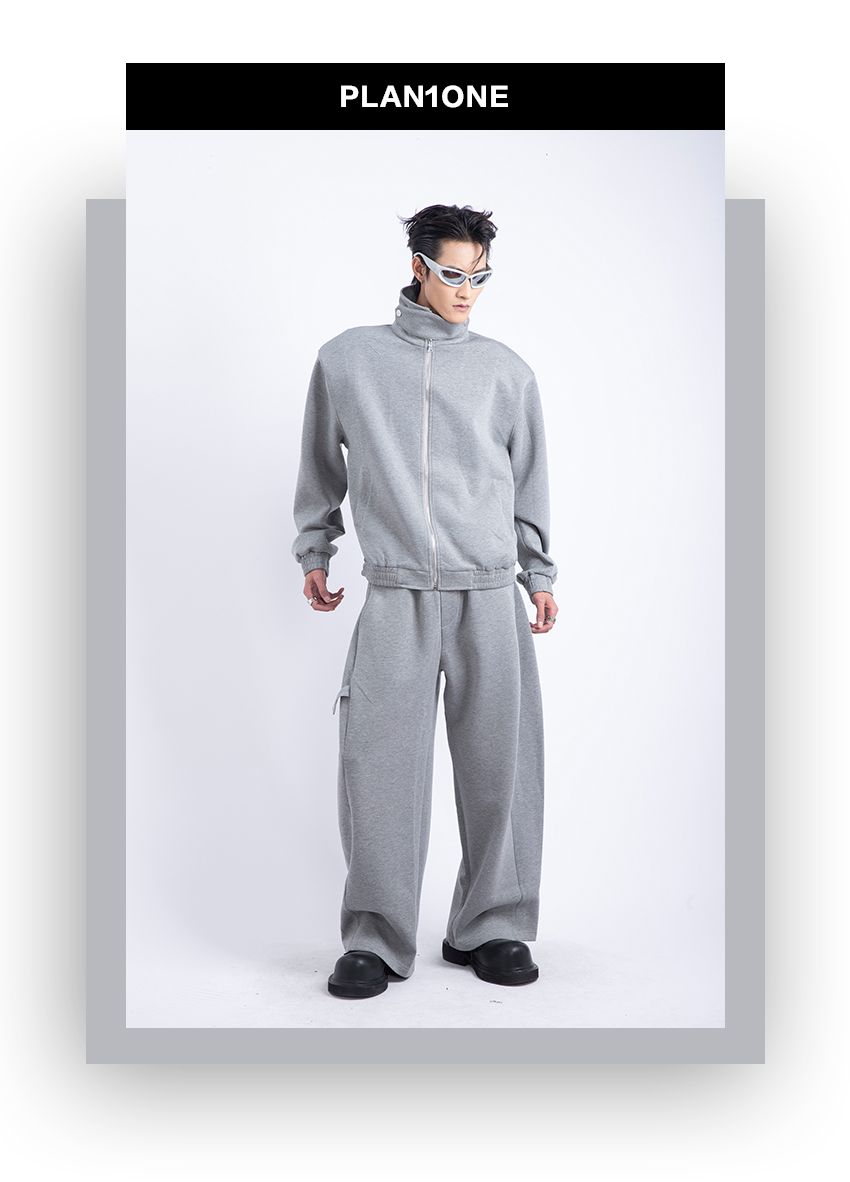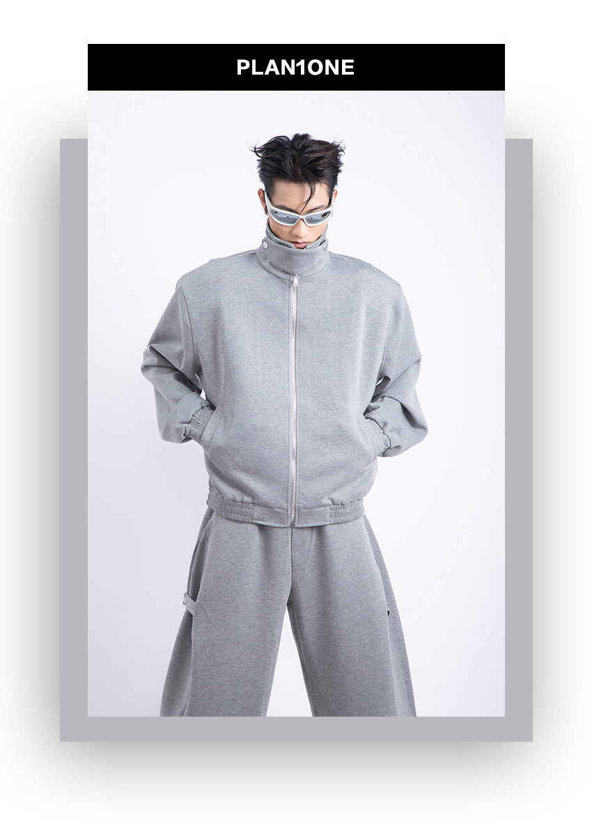 Stand Neck Shoulder Pad Zipper Jacket & Wide Leg Sweatpants Setup WN9259