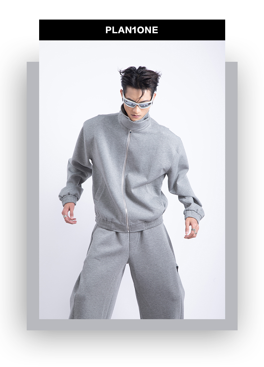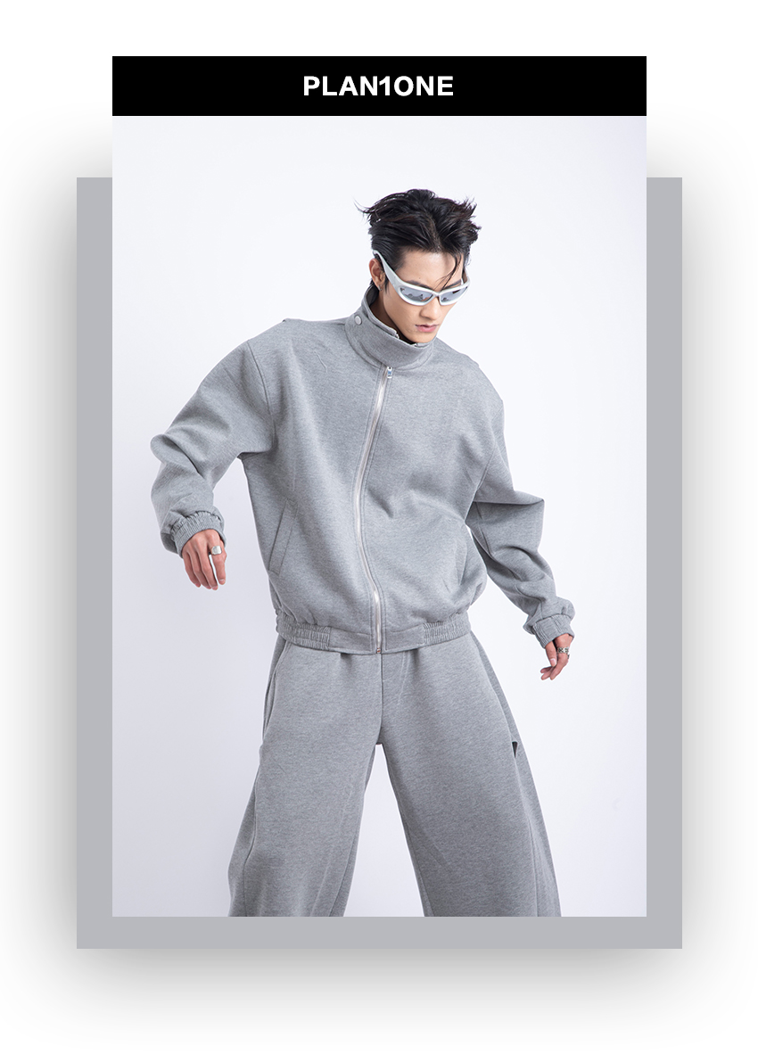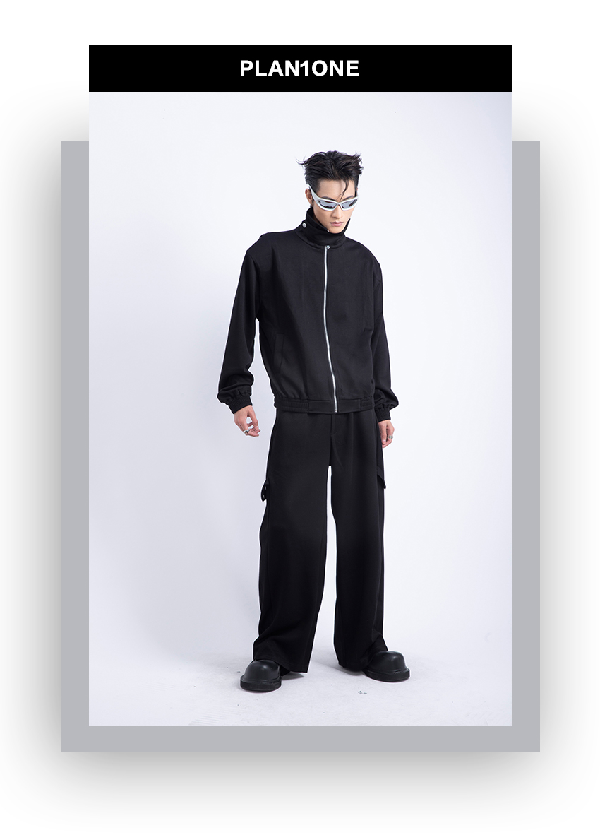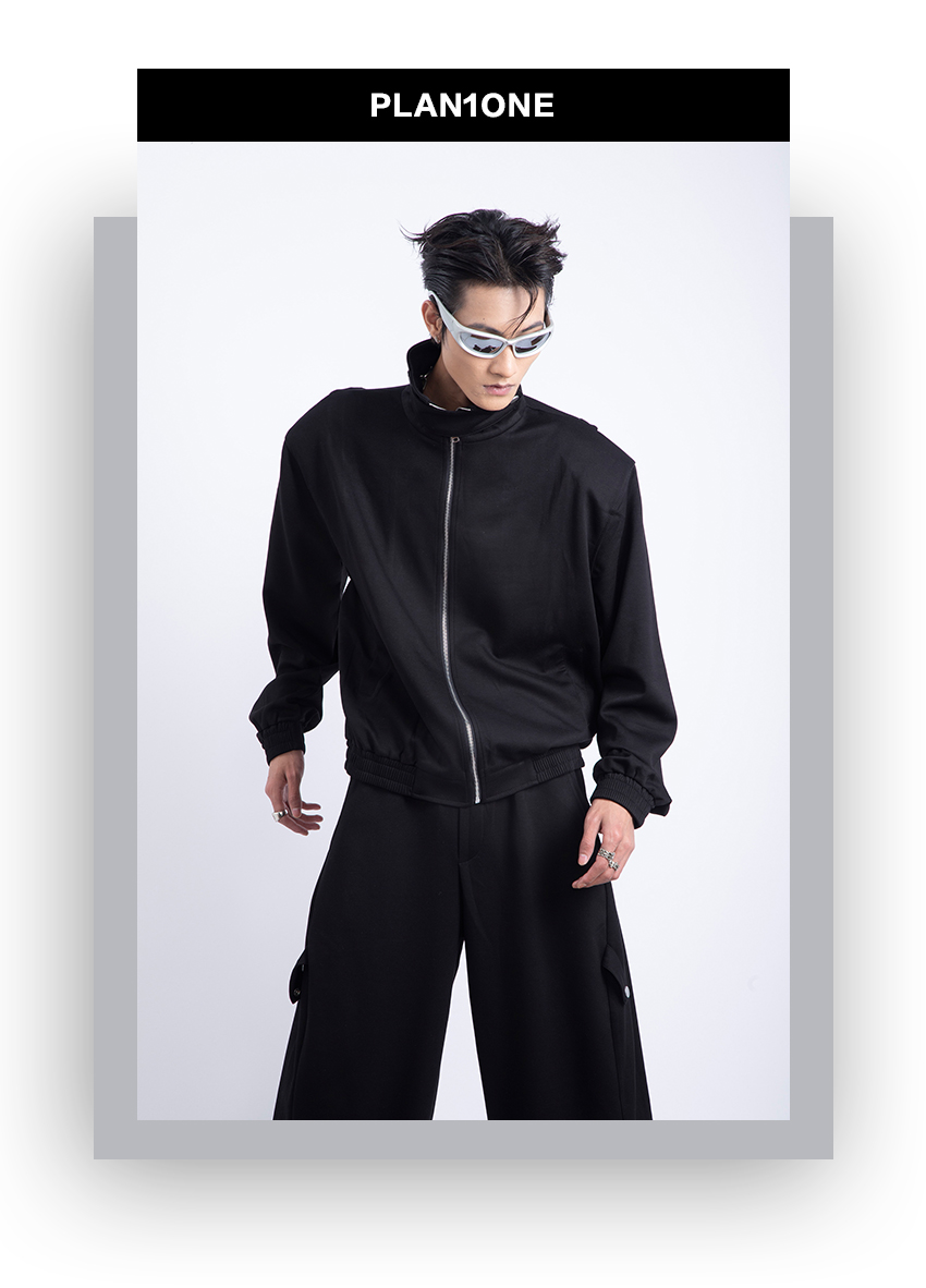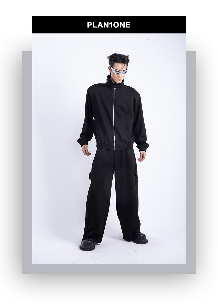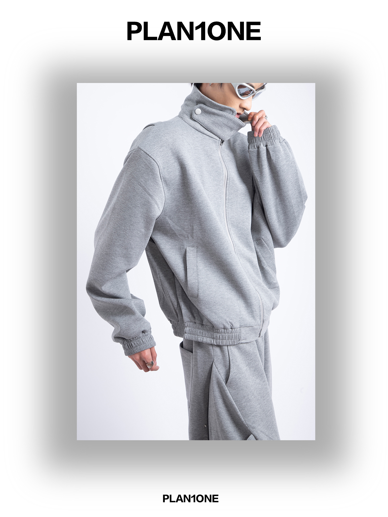 Stand Neck Shoulder Pad Zipper Jacket & Wide Leg Sweatpants Setup WN9259