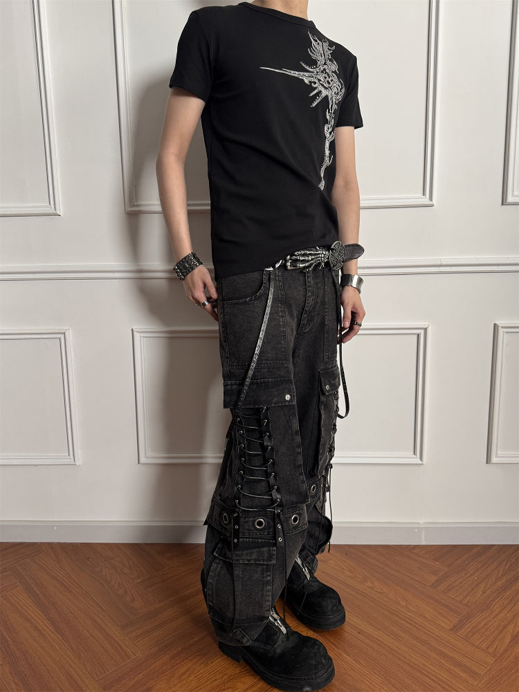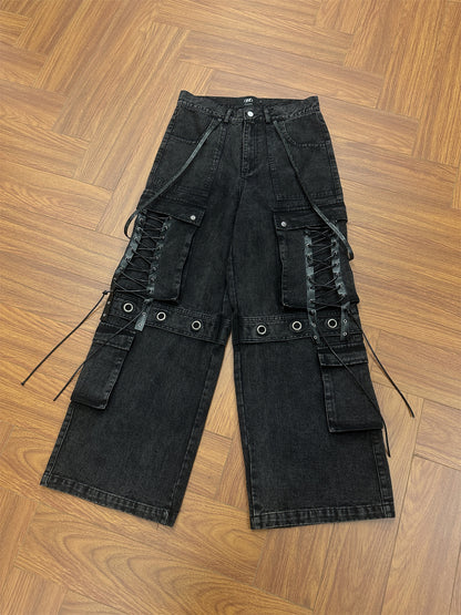 Studs Strap Damage Wide-Leg Cargo Denim Jeans WN15752