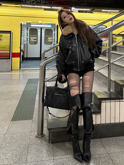 Holy Cross Fake Fur Collar Patchwork PU Leather Bomber Jacket WN15860