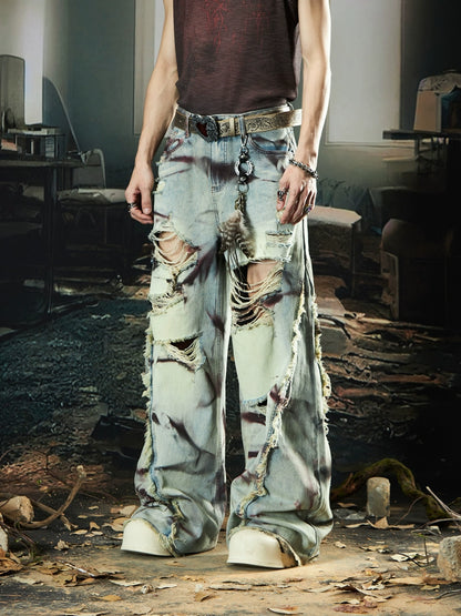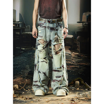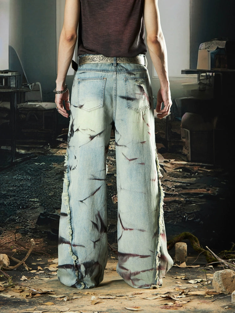 Fringe Tie-Dye Paint Damage Wide Leg Straight Denim Jeans WN18476