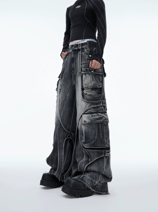 Multi Pocket Heavyweight Wide Leg Cargo Denim Jeans WN8679