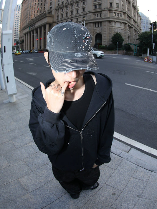 Washed Denim Damage Rhinestone Baseball Cap WN17064