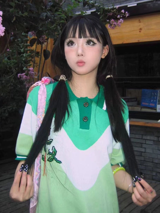 Floral Embroidery Patchwork Oversize Knit Polo Shirt WN17063