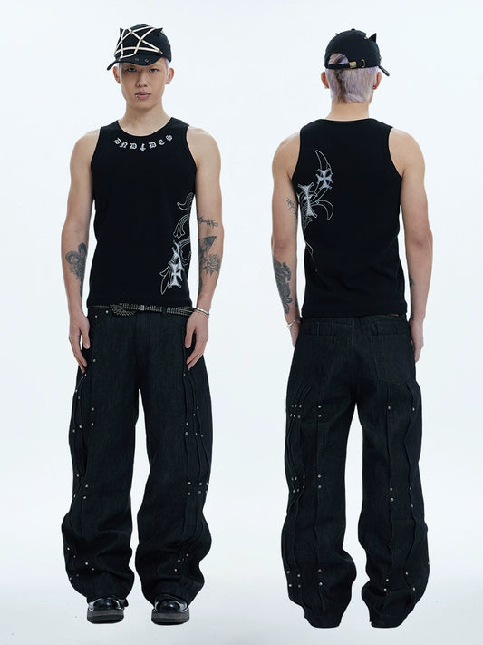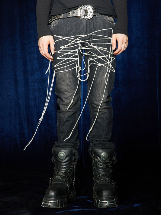 Lightning Wave Pattern Washed Straight Flare Denim Jeans WN17034