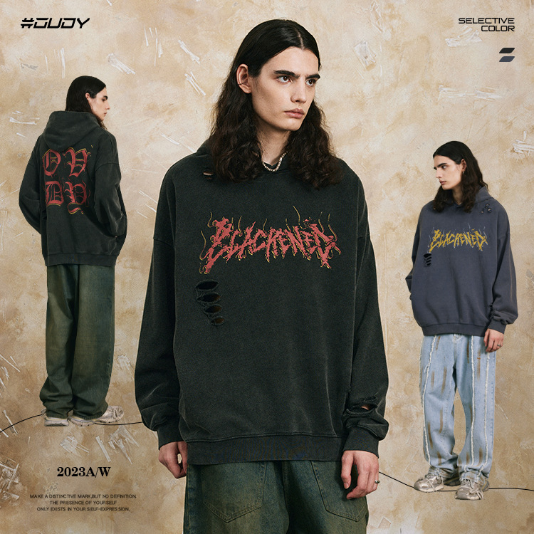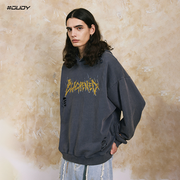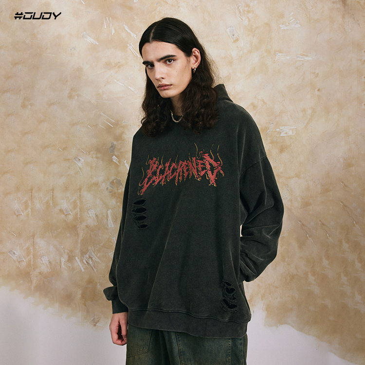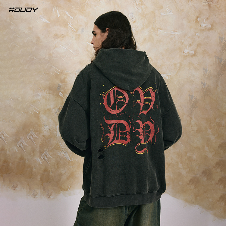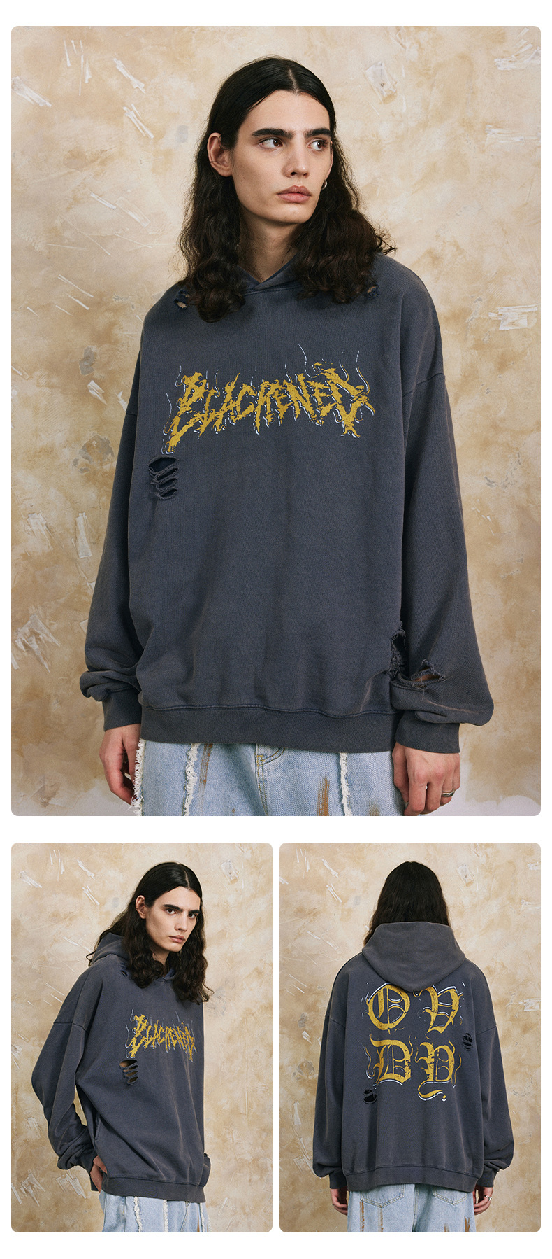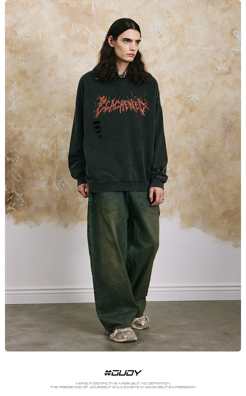 Washed Damage Fleece Linning Pullover Hoodie WN12552