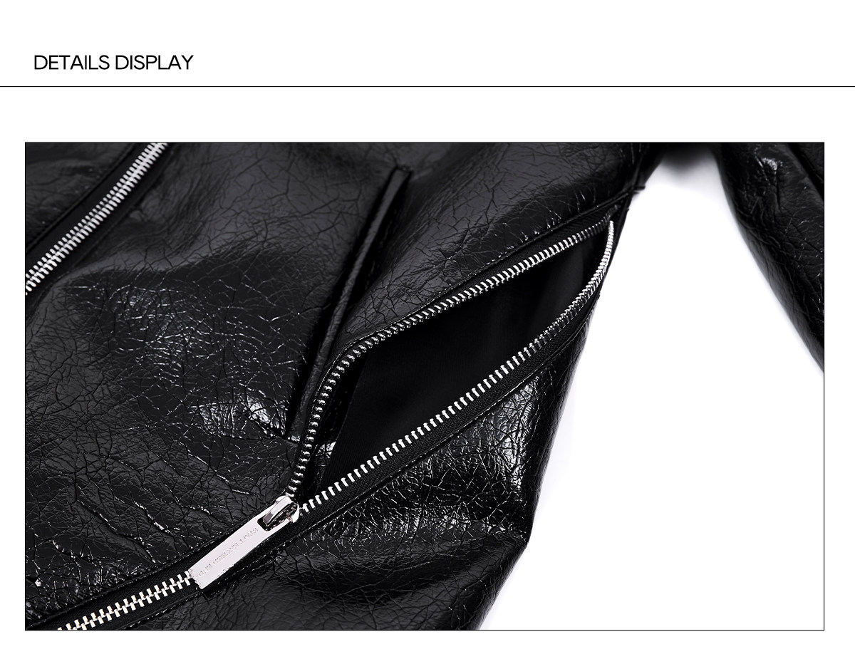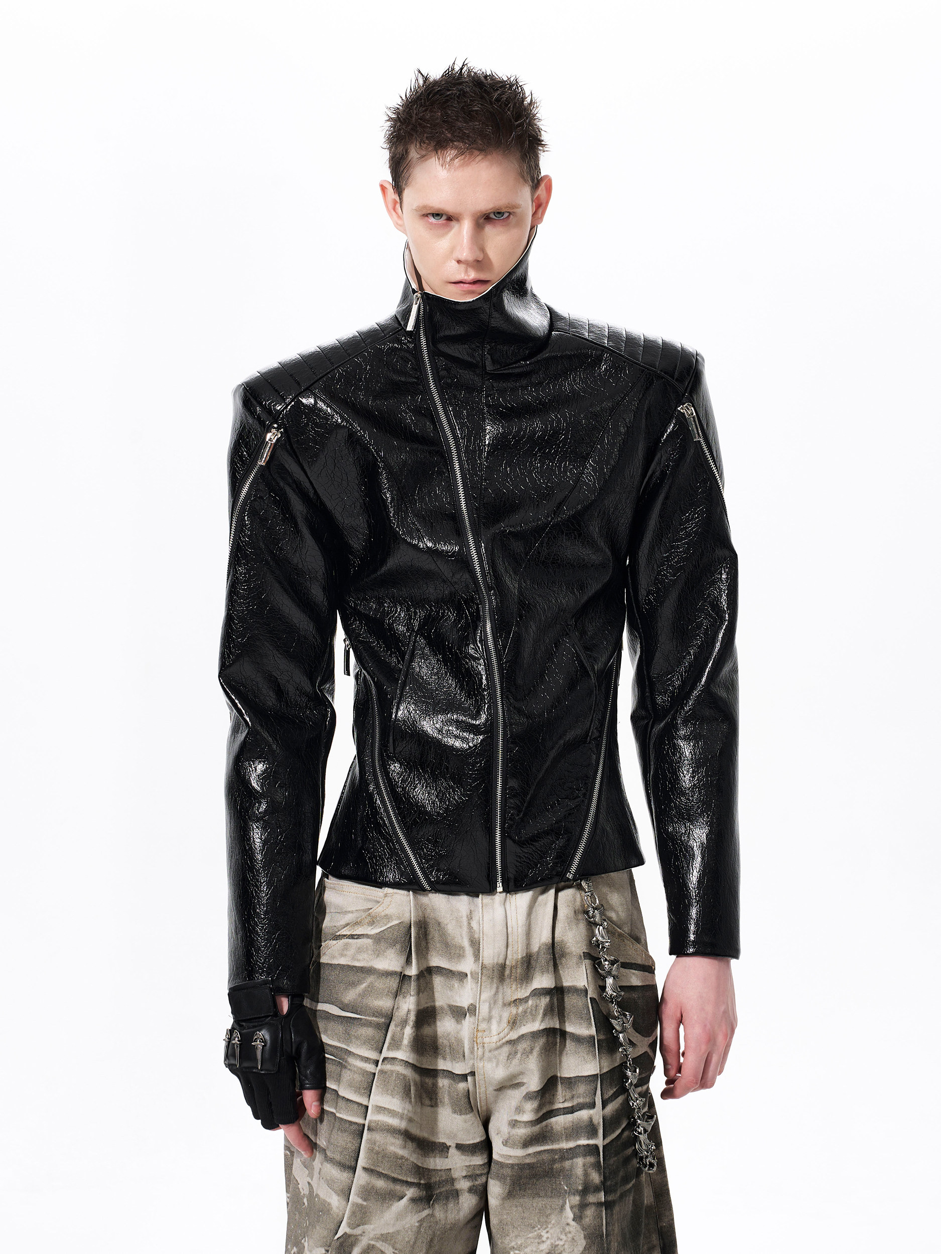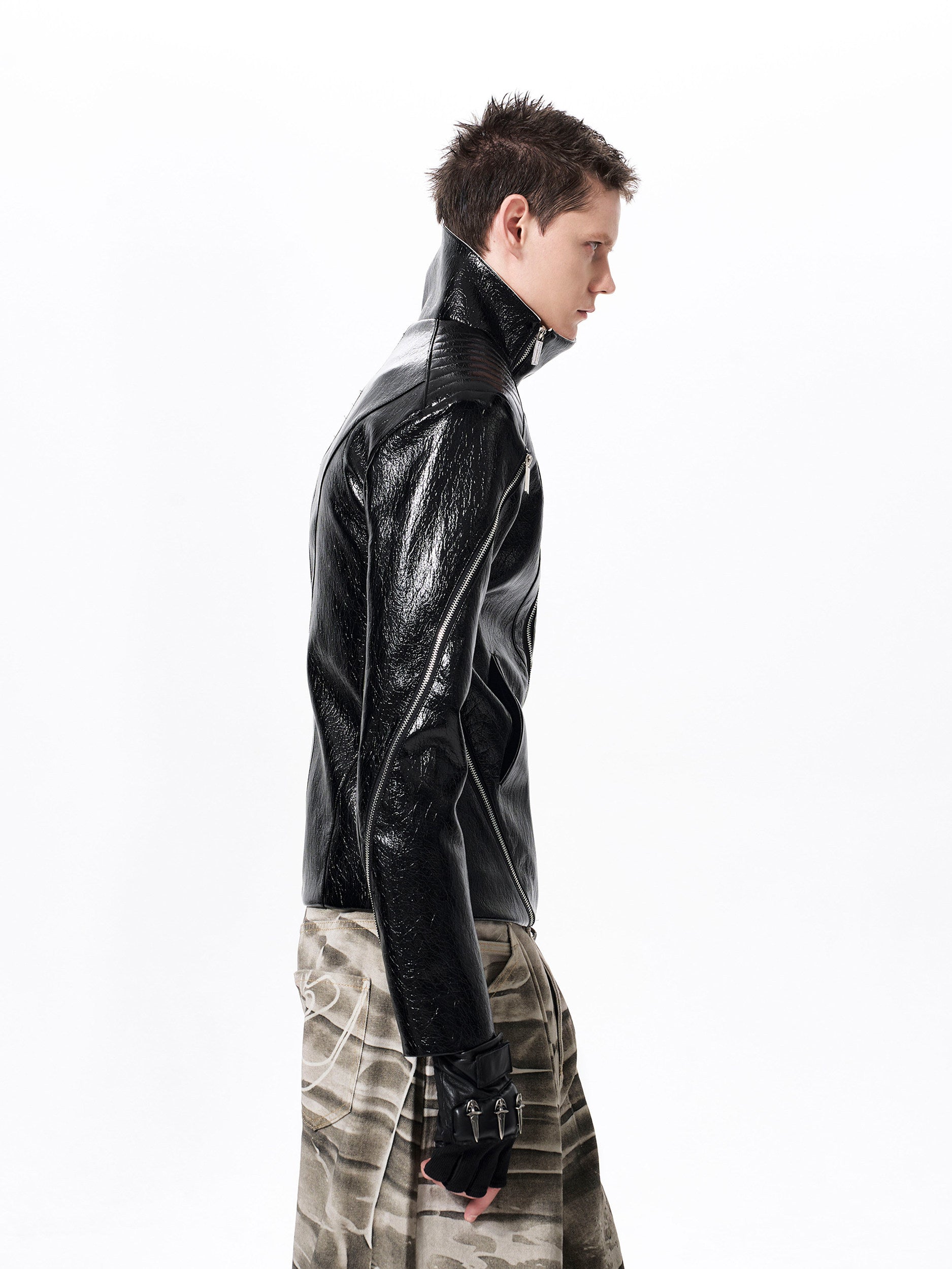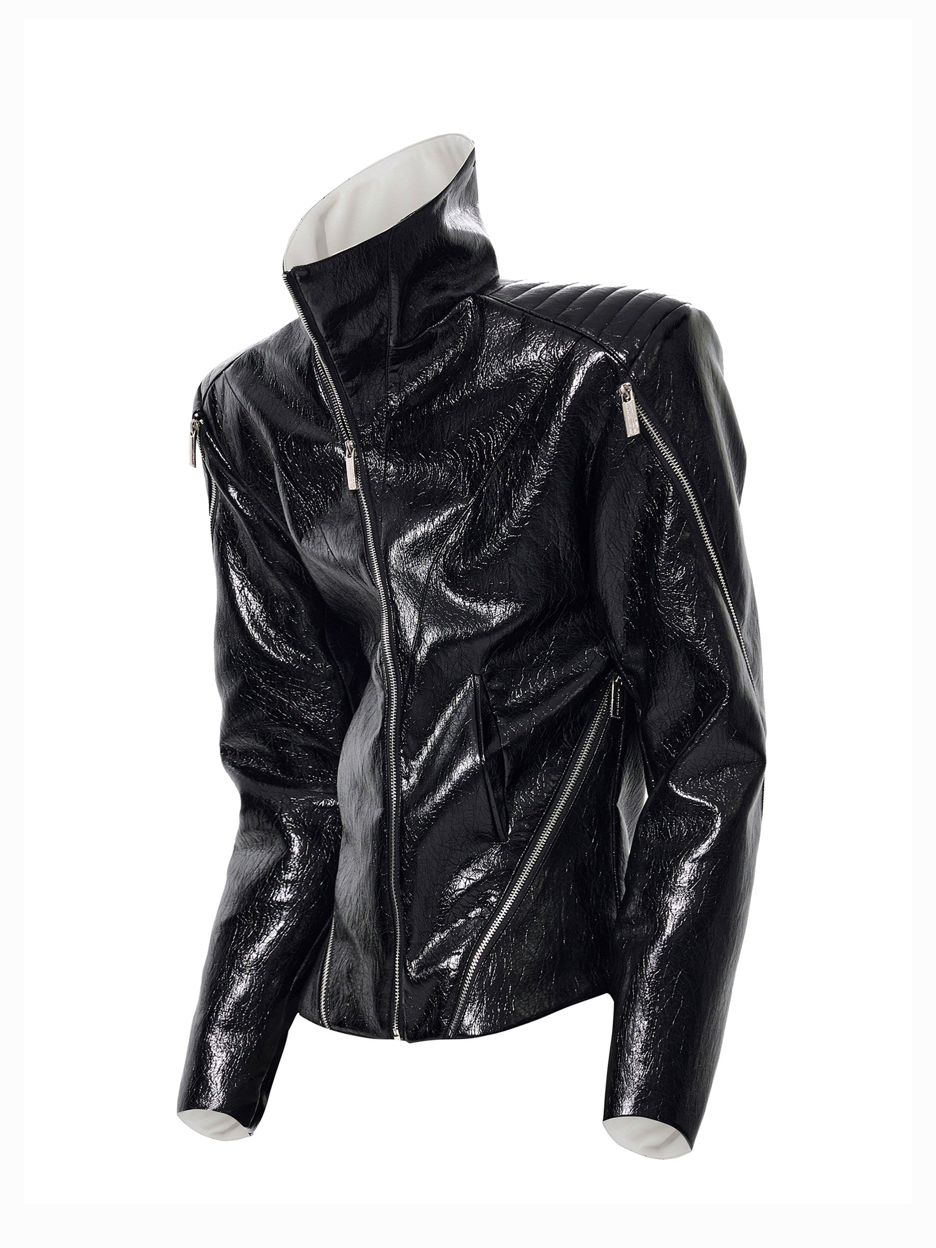 Deconstructed Asymmetrical Zipper Stand Neck Leather Jacket WN23271