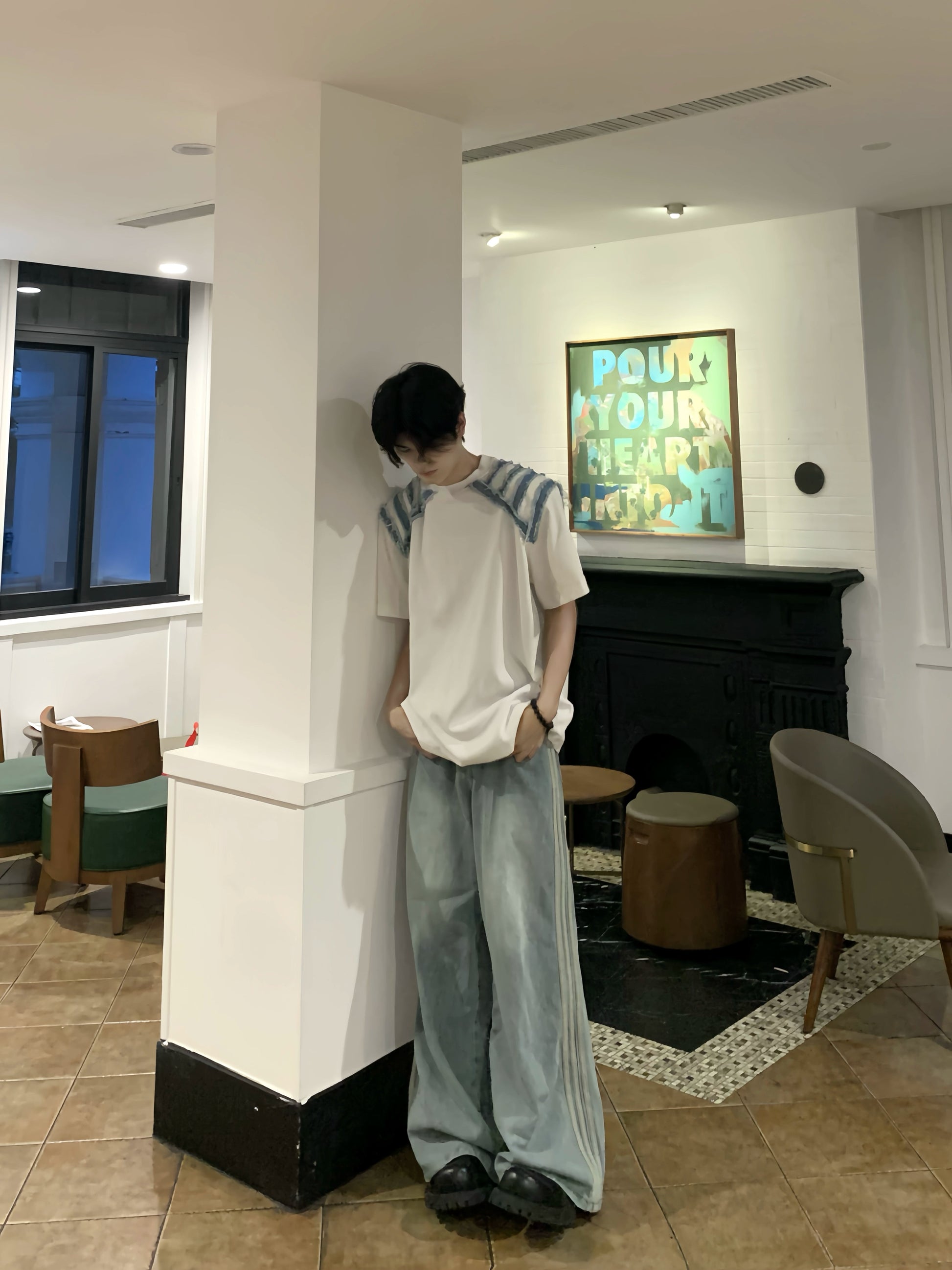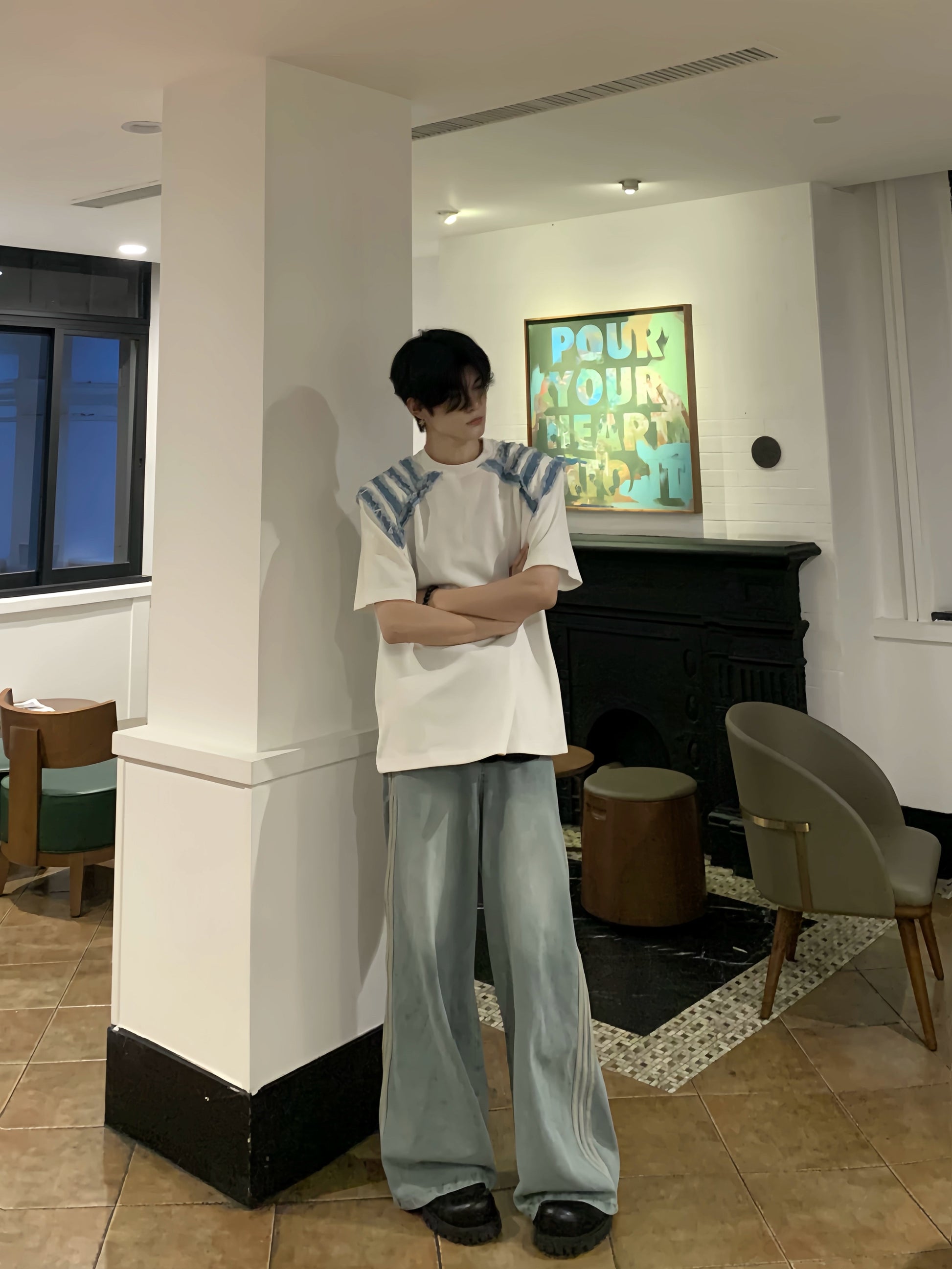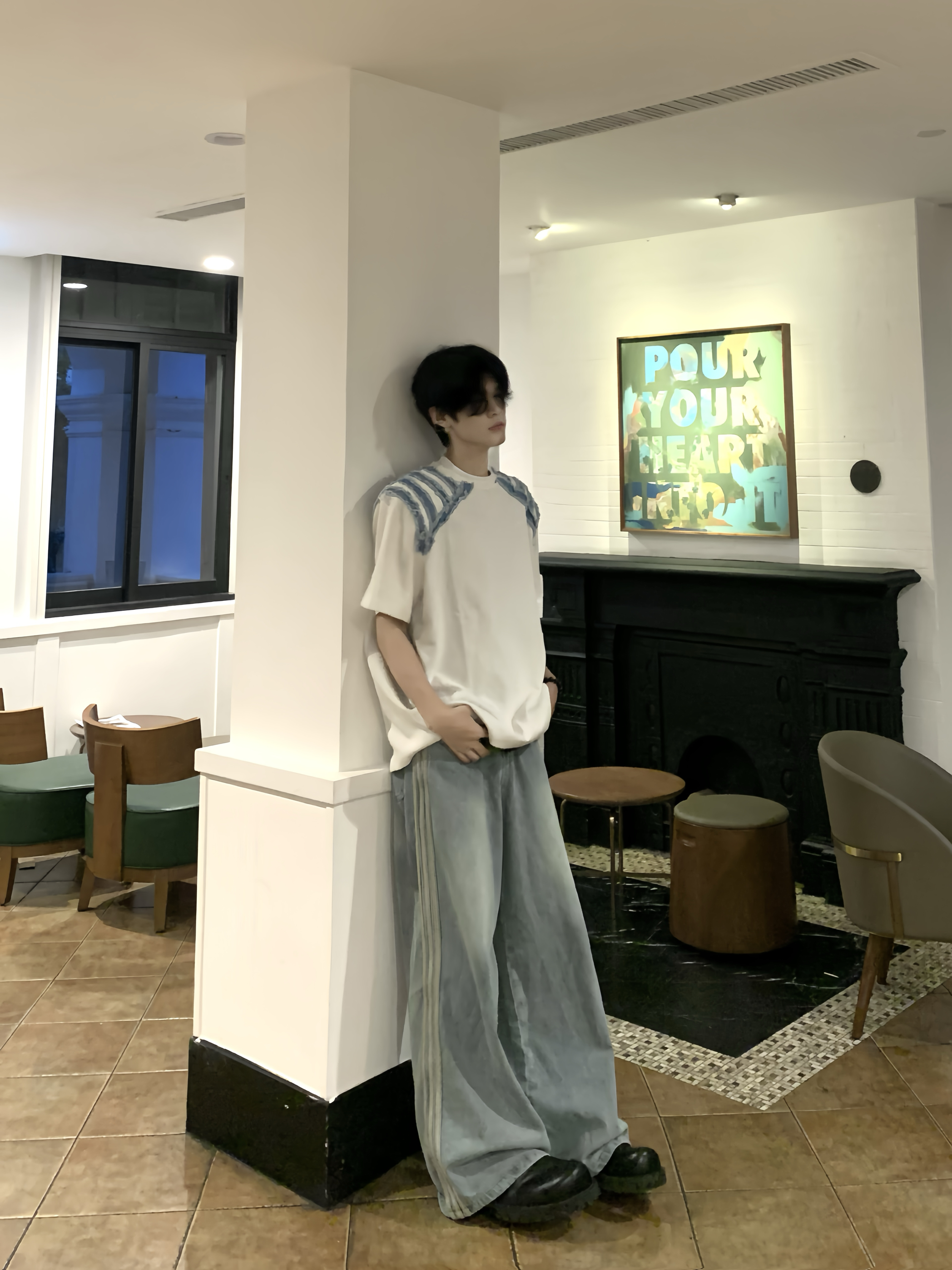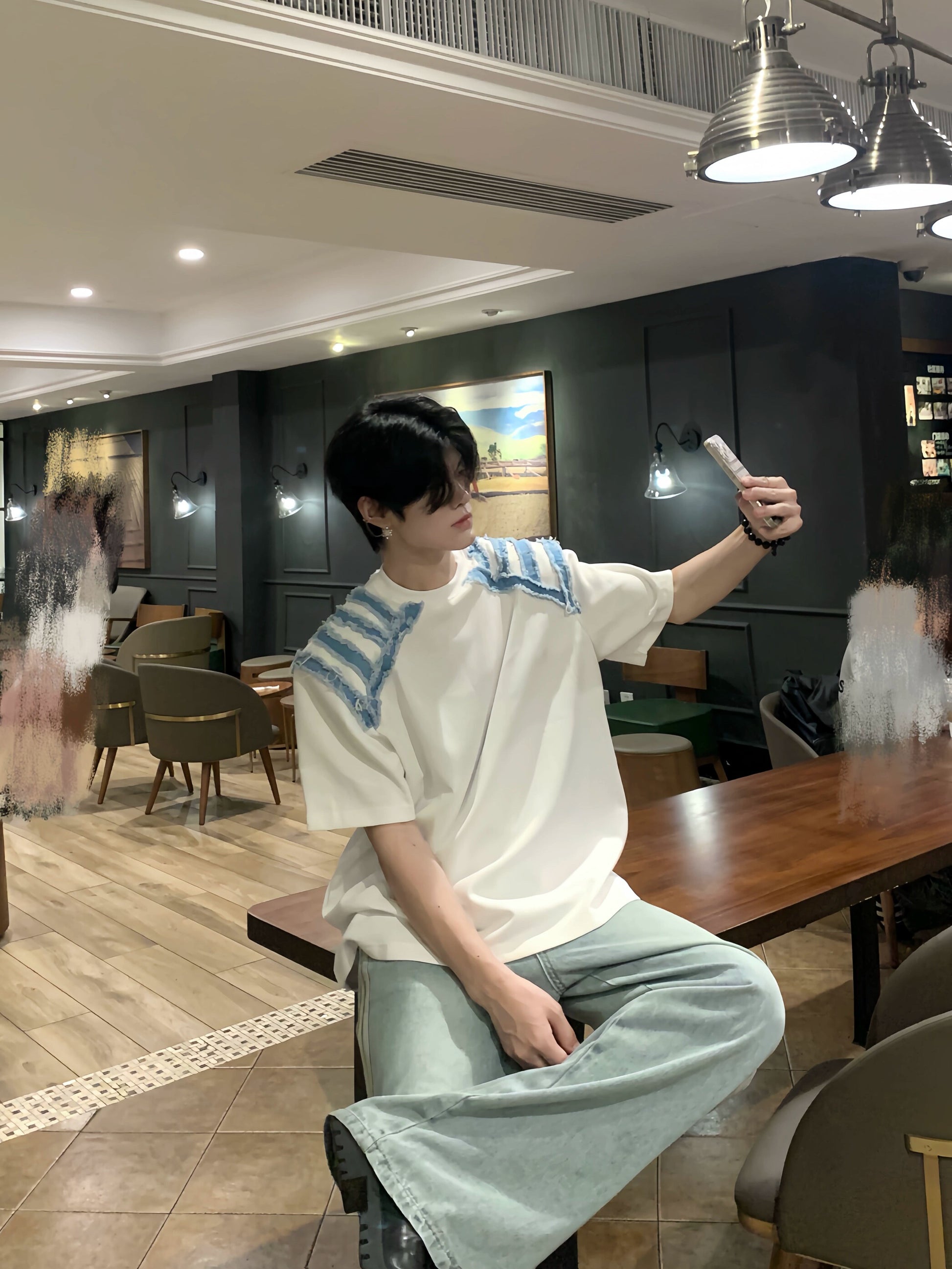Denim Stripe Patchwork Short Sleeve T-Shirt WN19801
