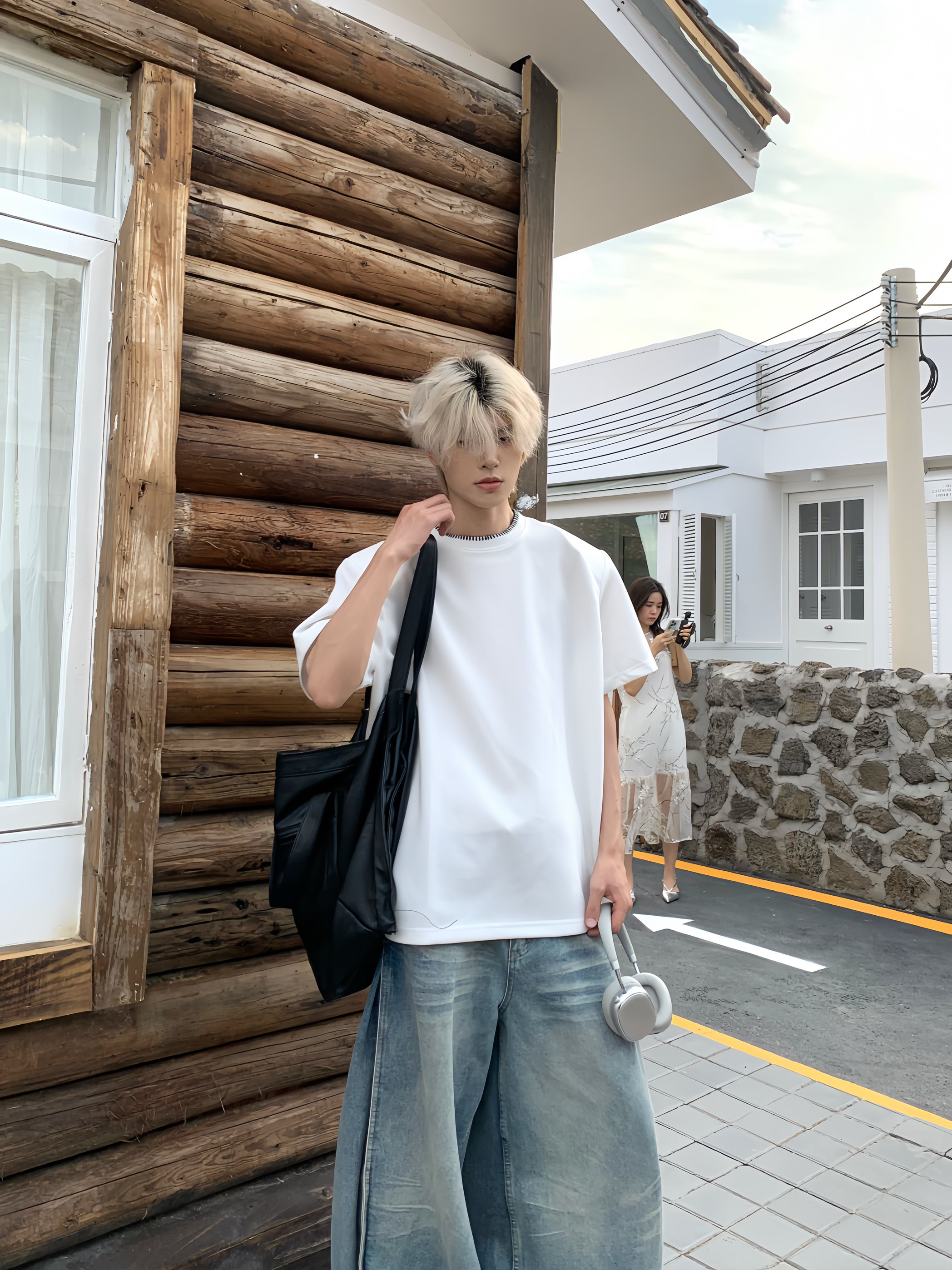 Shoulder-Pad Patchwork Oversize Short Sleeve T-Shirt WN19875