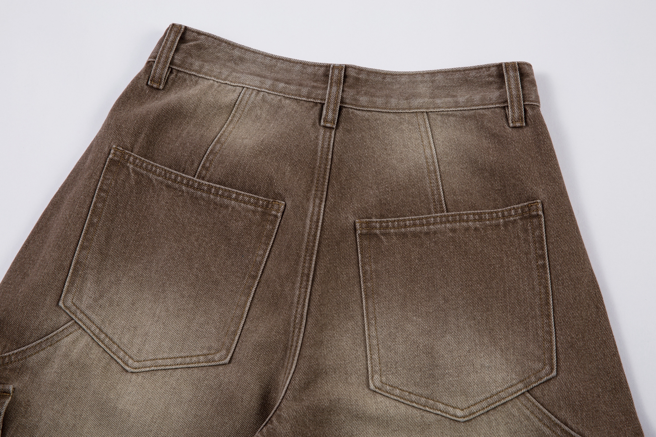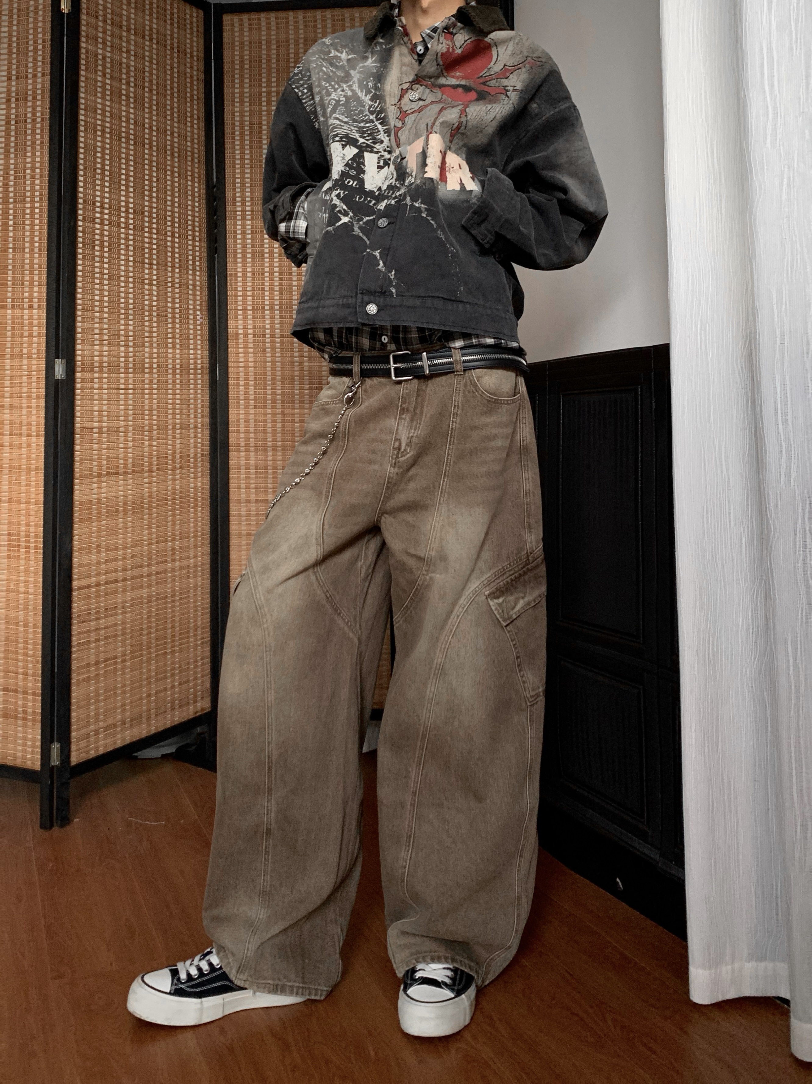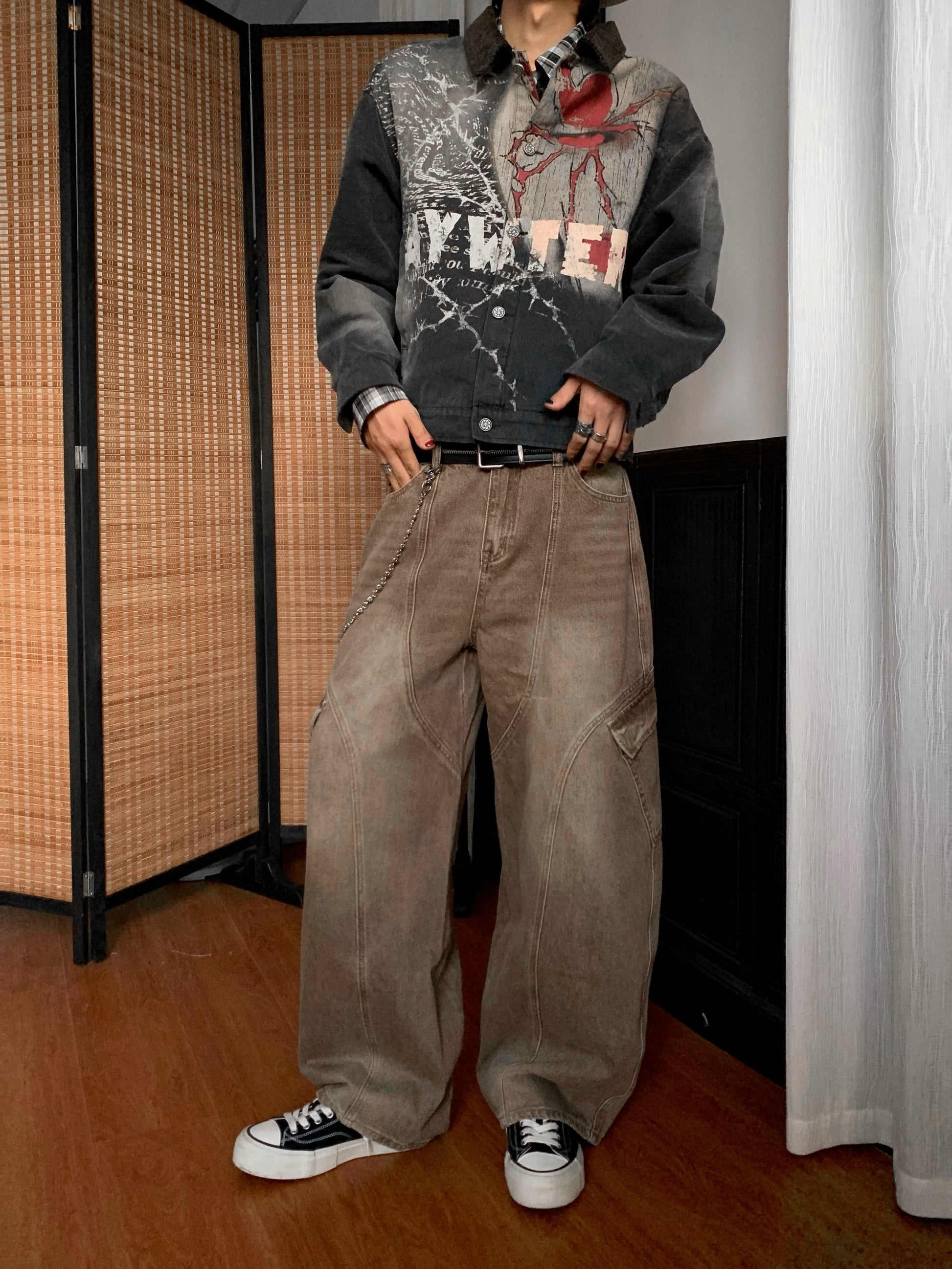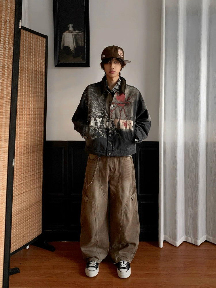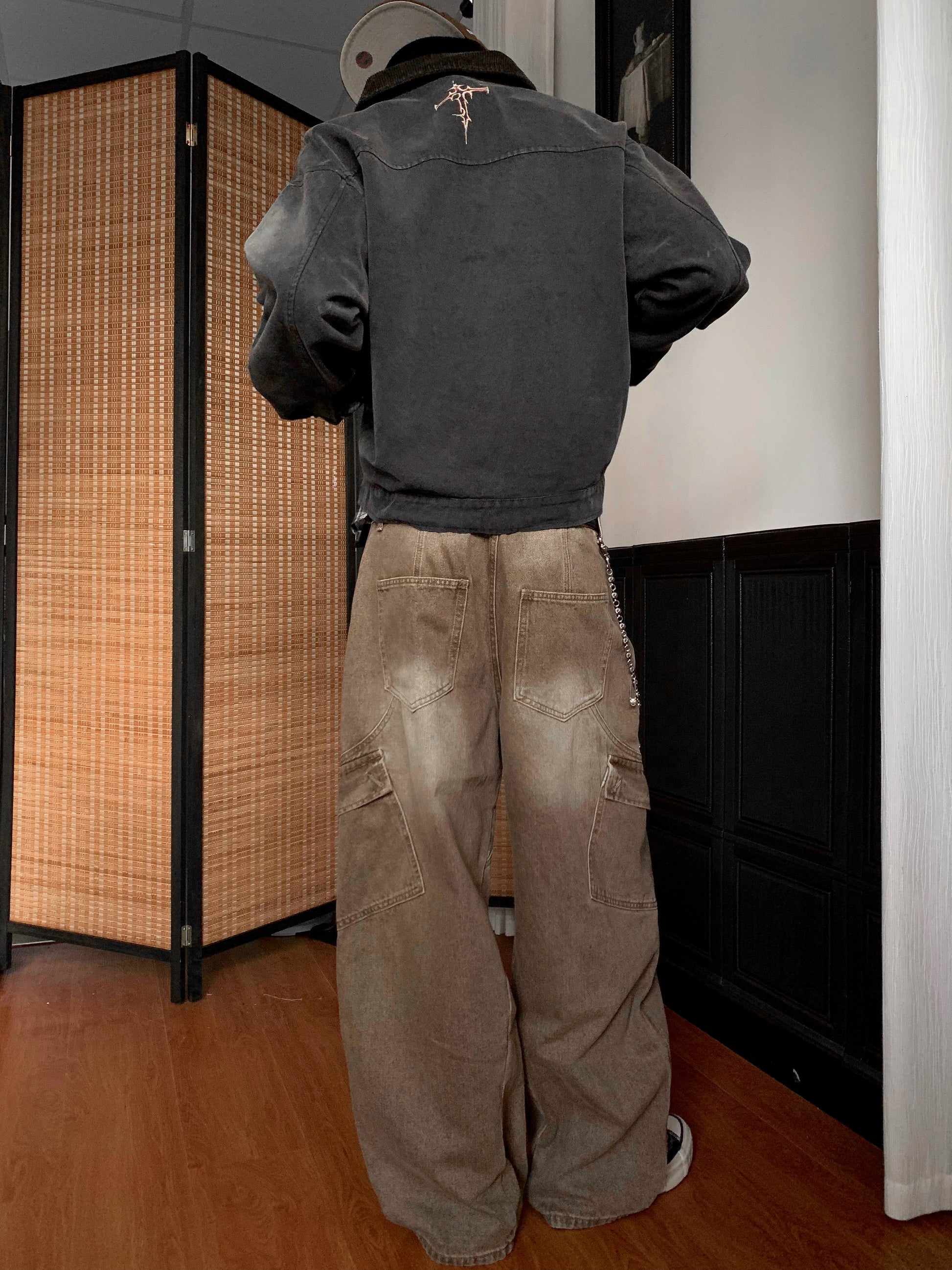 Washed Multi-Pocket Brown Wide Leg Denim Jeans WN22177