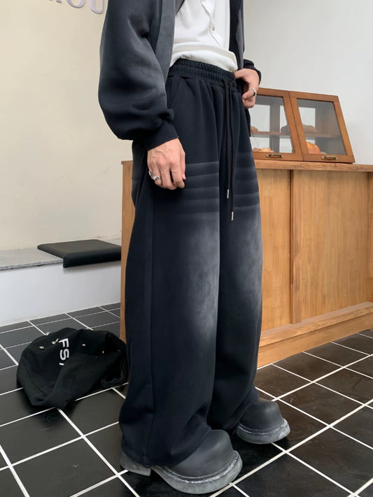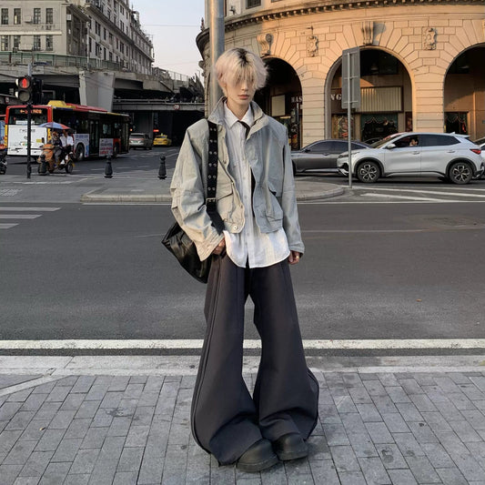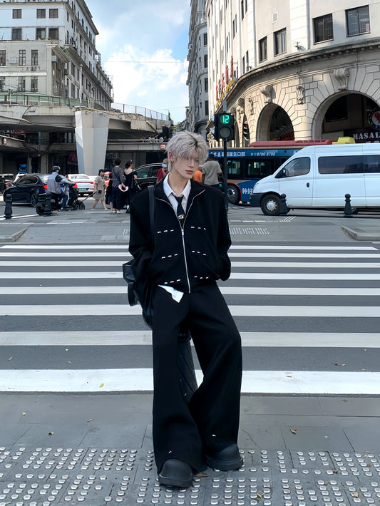 Four-Bar Spray Damage Stand Neck Zopper Jacket & Wide Leg Pants Set WN21811