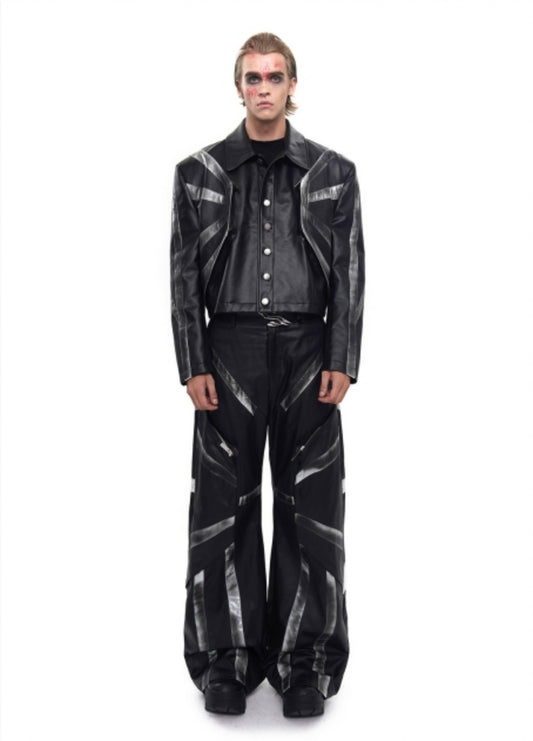 Frayed Denim Patch Rivet PU Leather Short Jacket & PU Leather Pants Setup WN22123