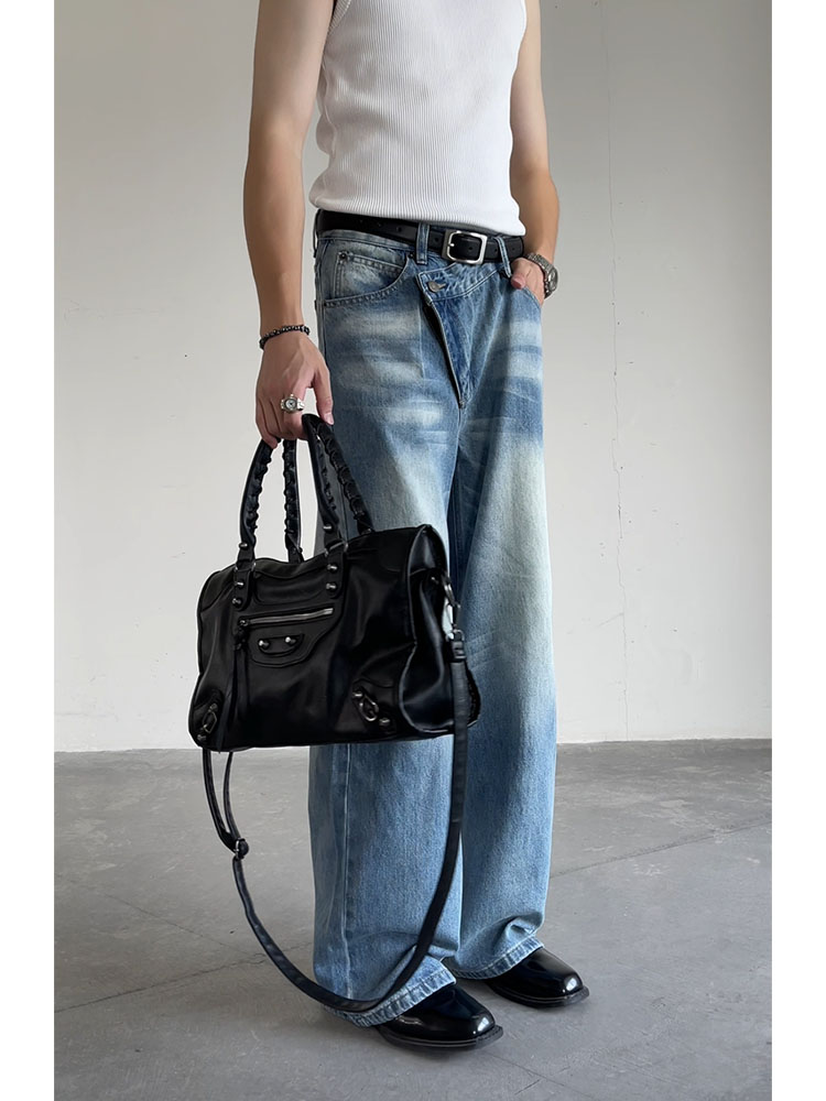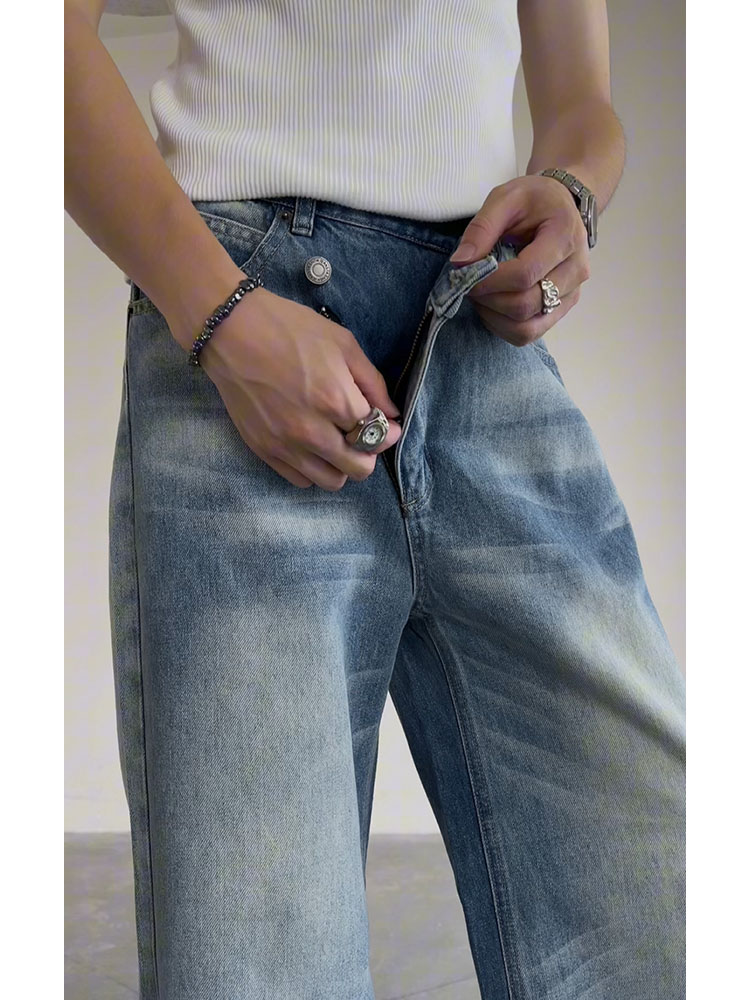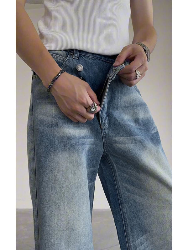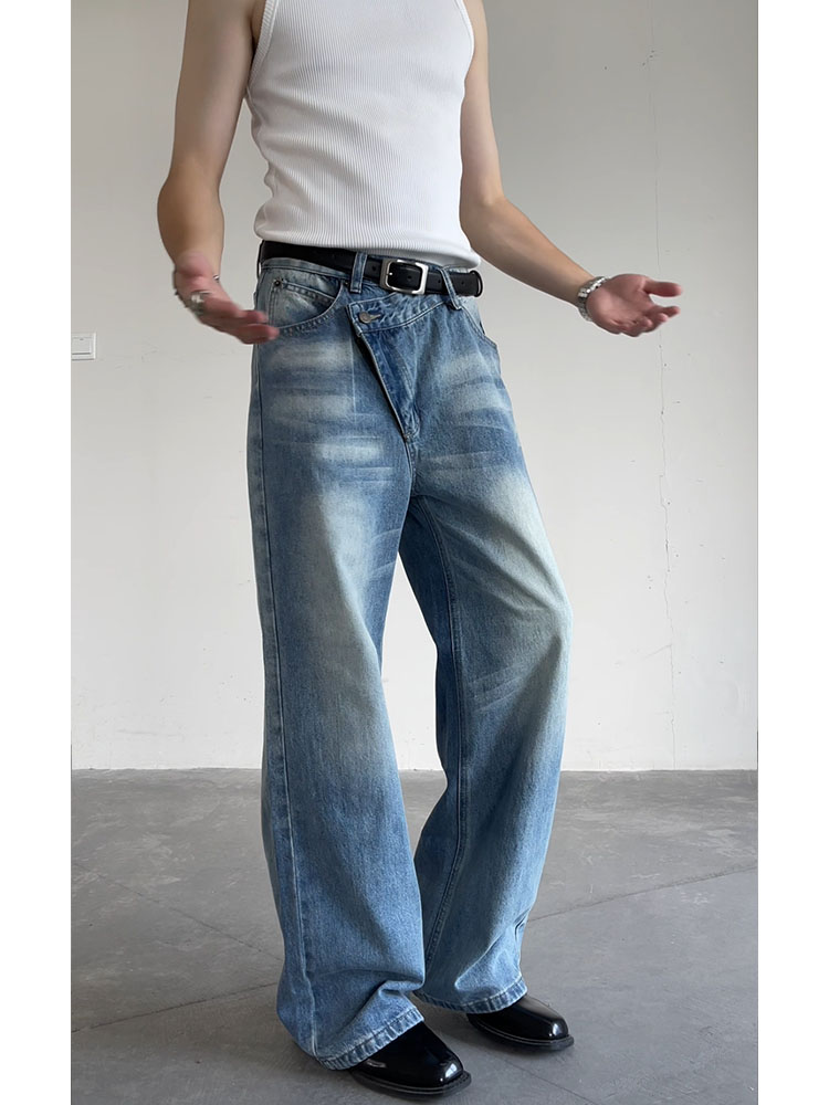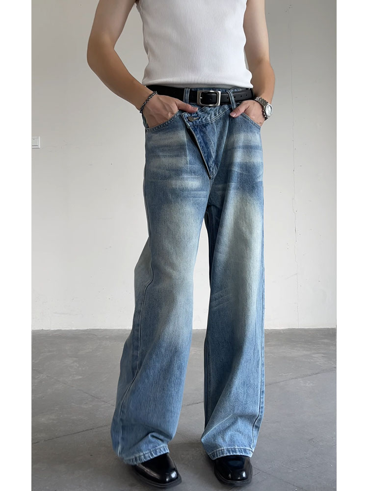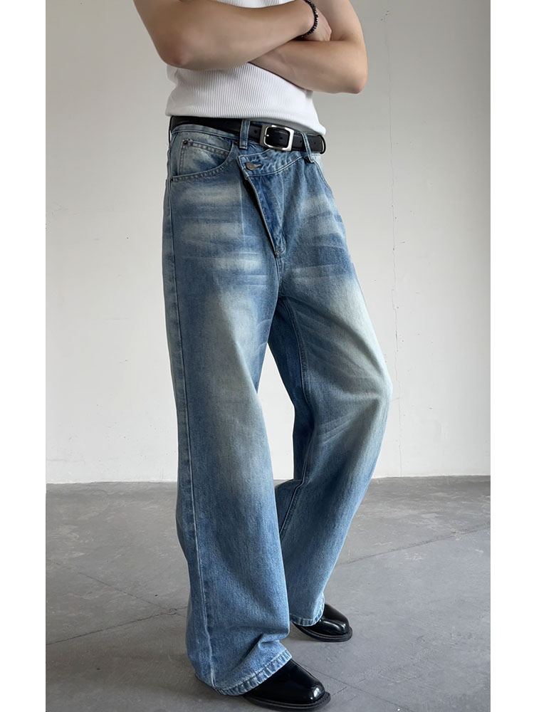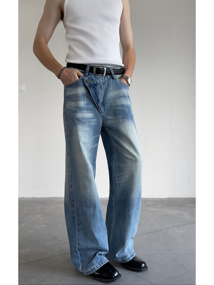 Asymmetrical Waist Washed Denim Jeans WN19329