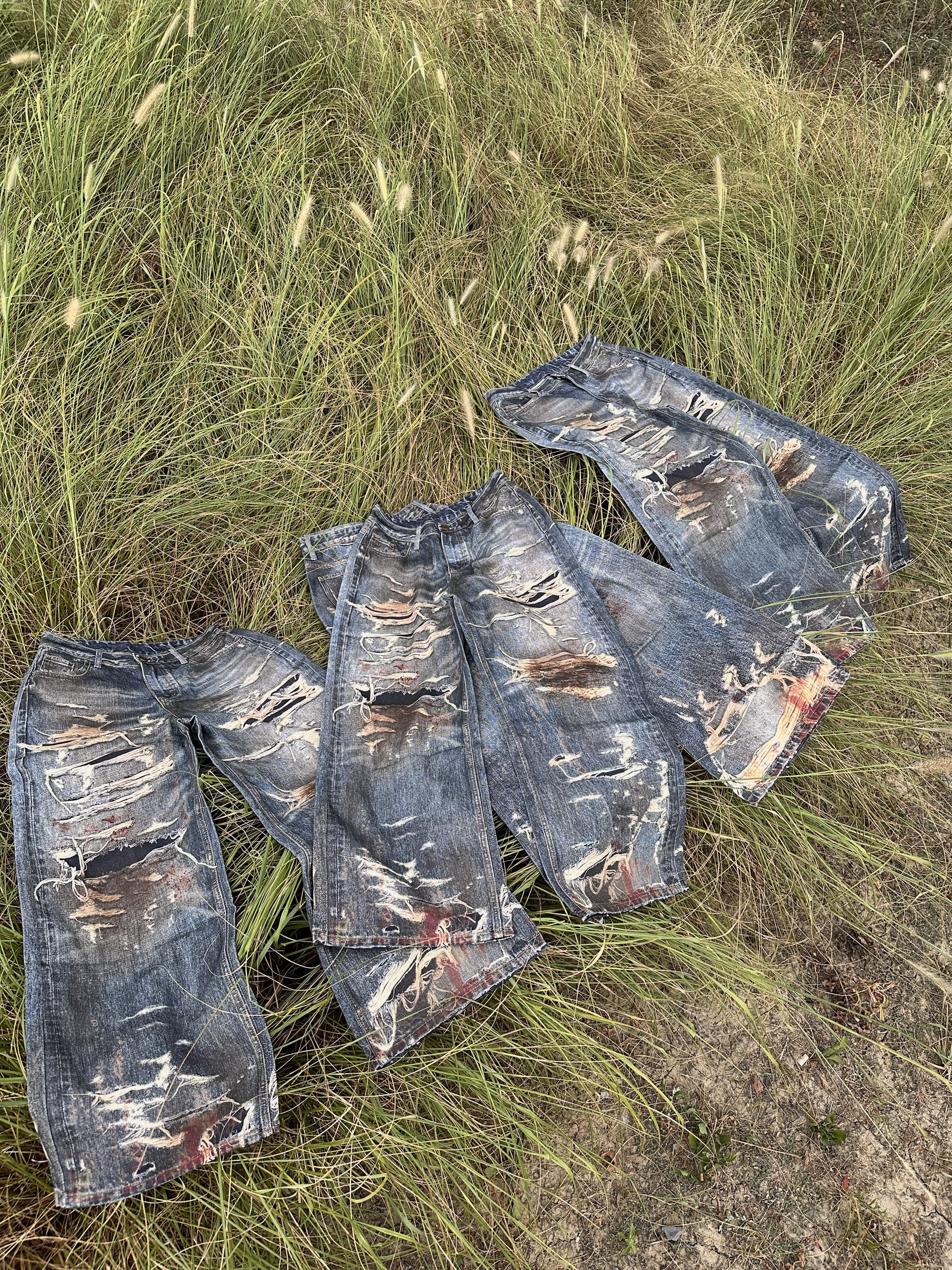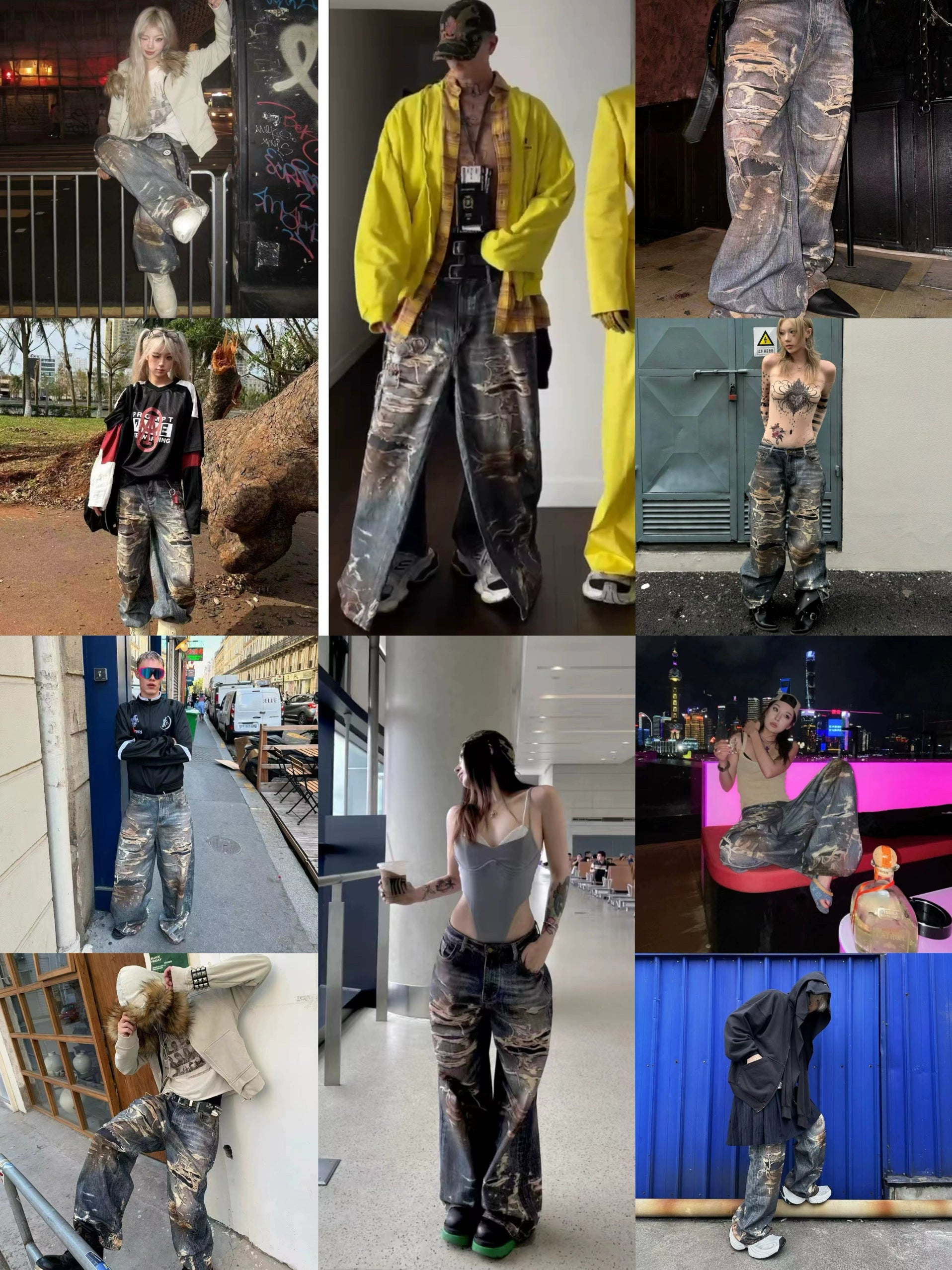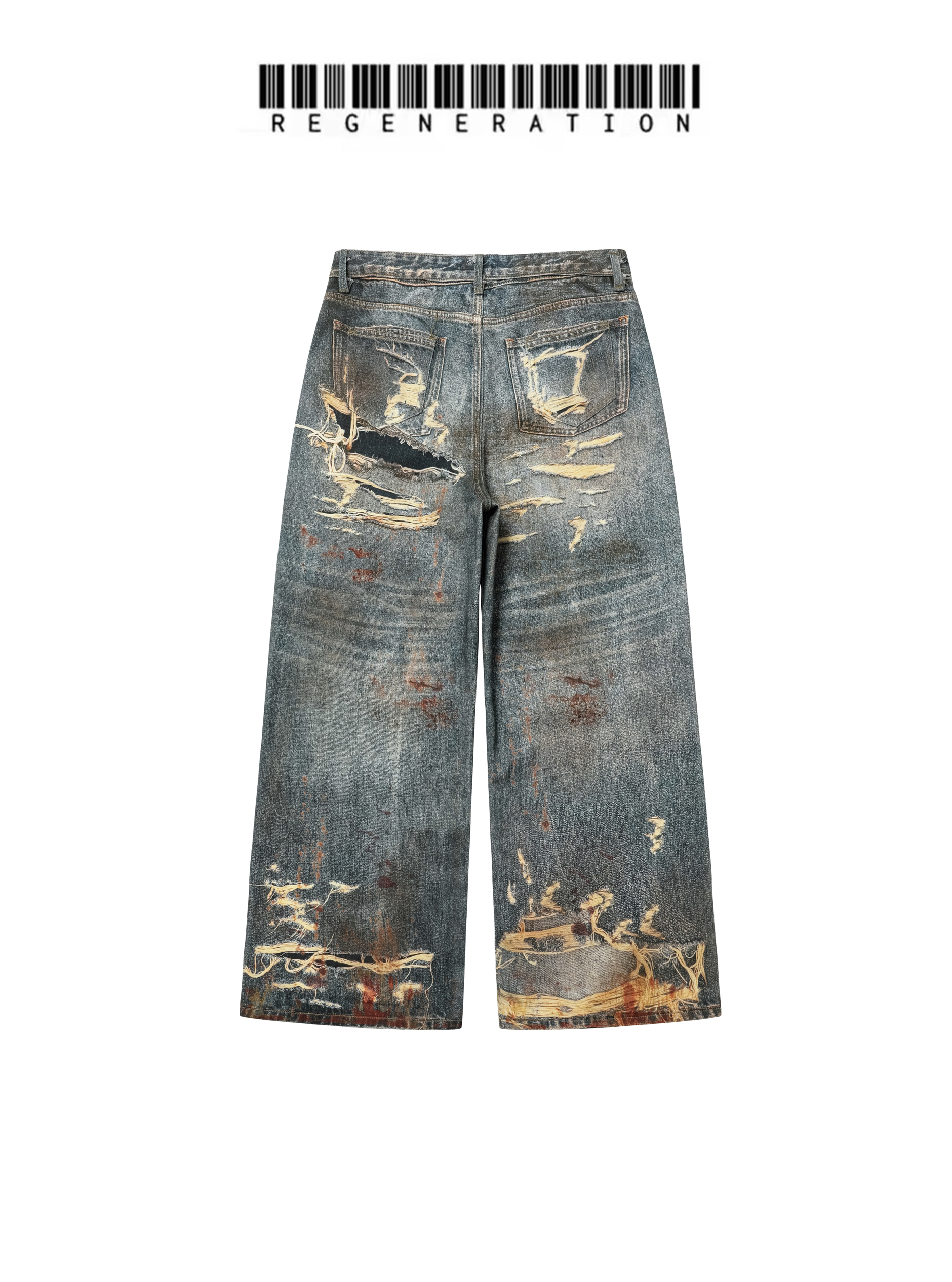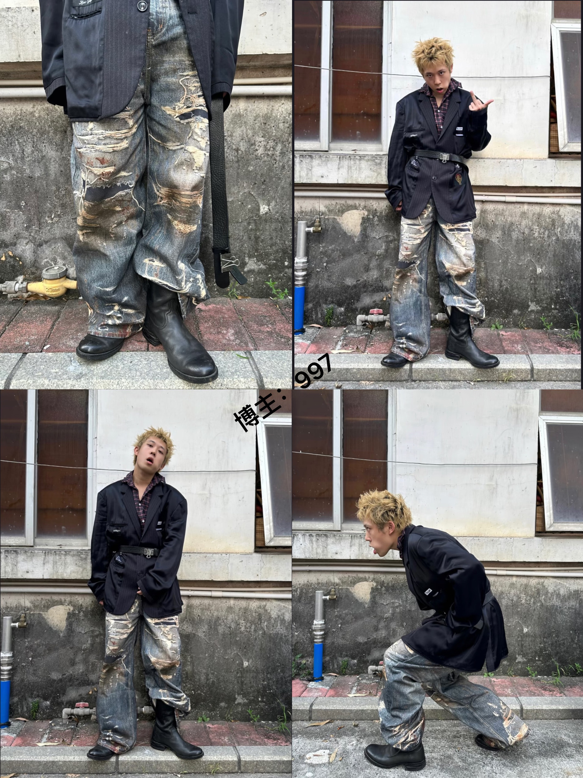 Washed Dirty Stain Damage Digital Print Denim Jeans WN19686