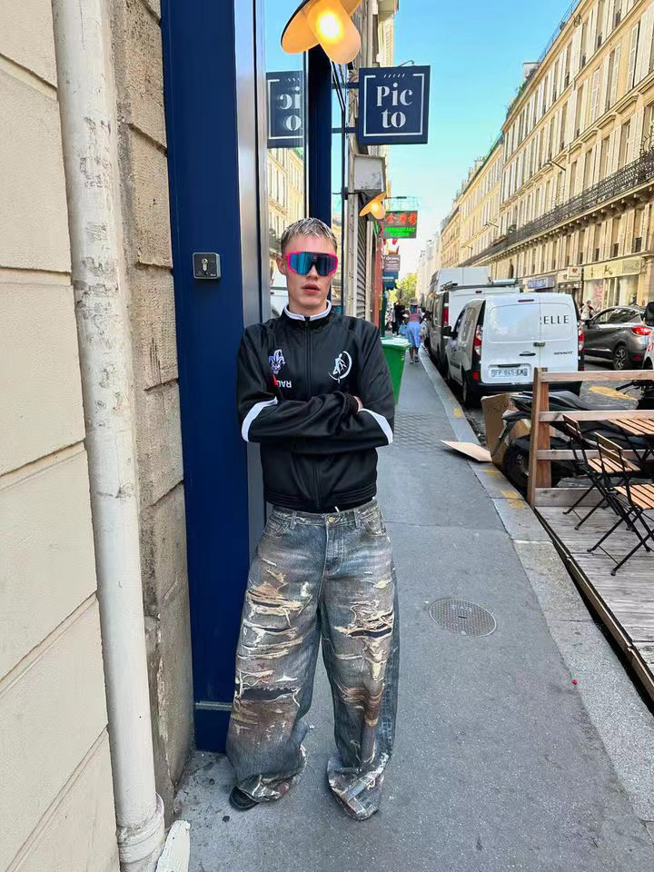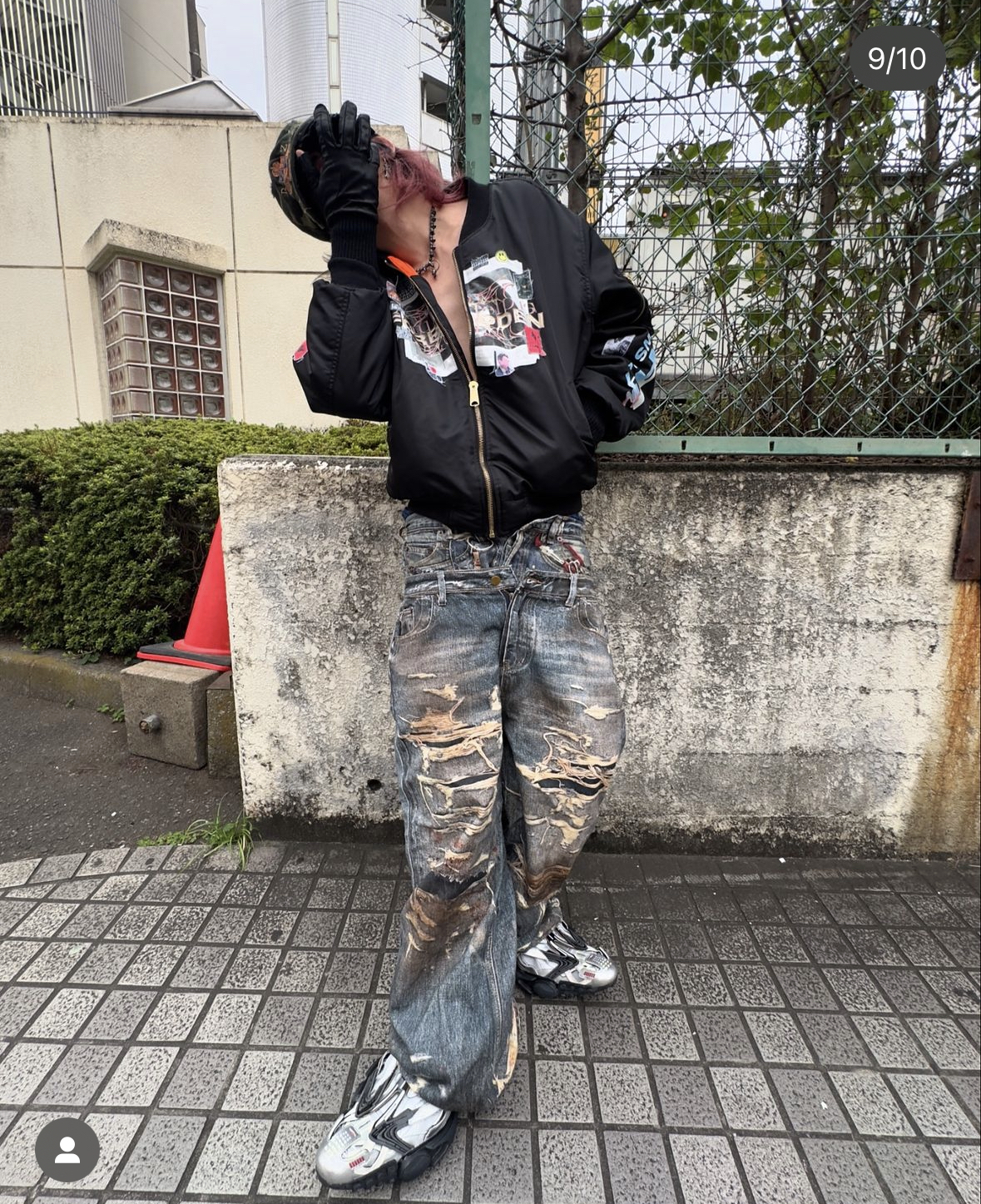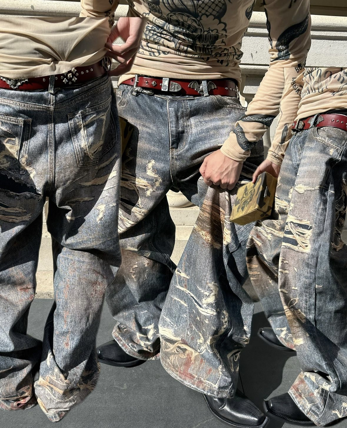 Washed Dirty Stain Damage Digital Print Denim Jeans WN19686