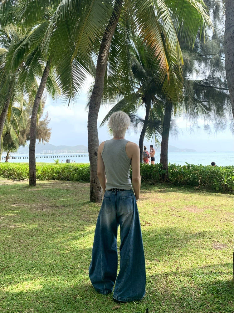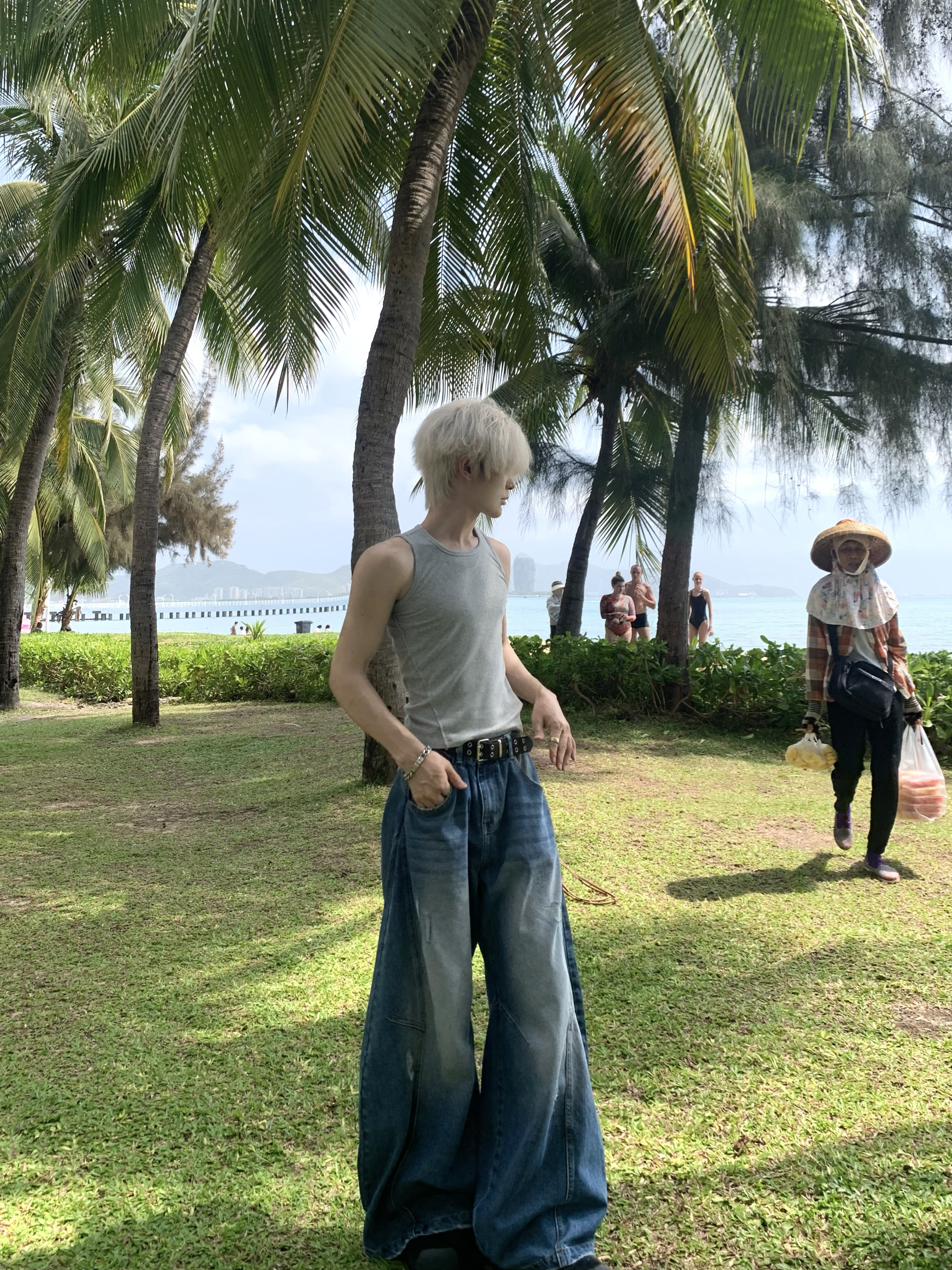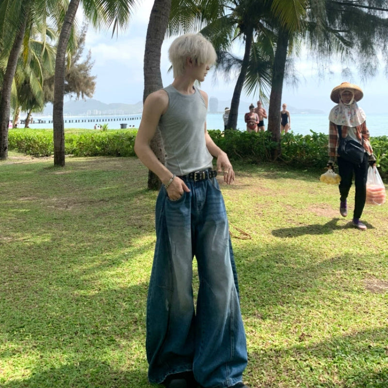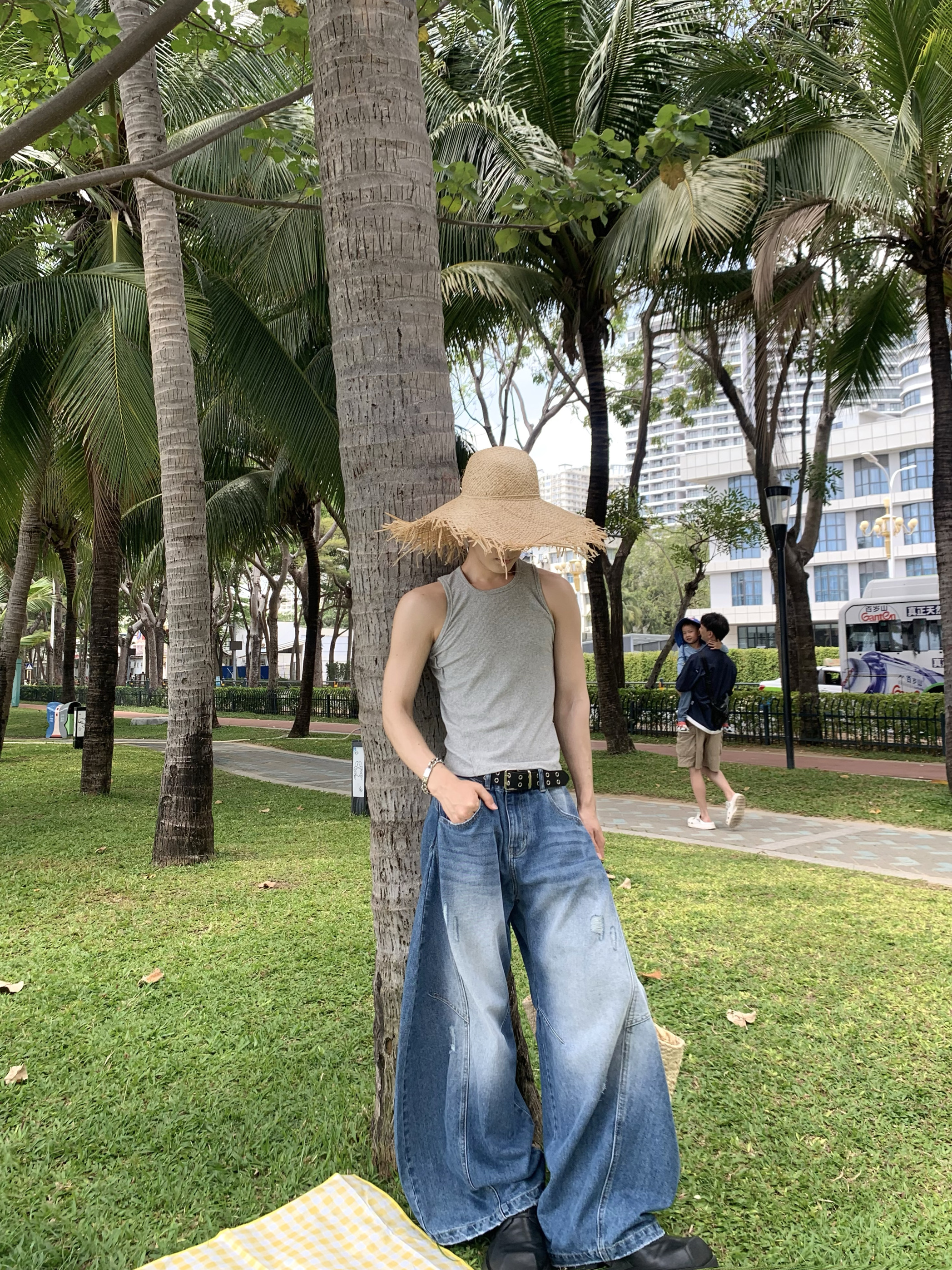 Scimitar Cut Damage Wide Leg Denim Jeans WN19732