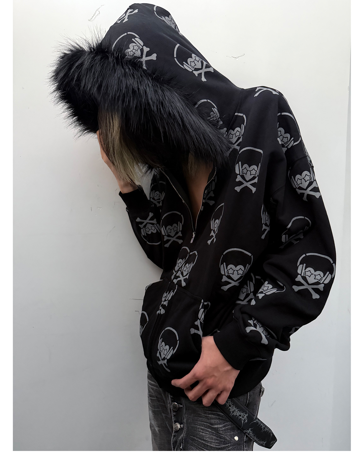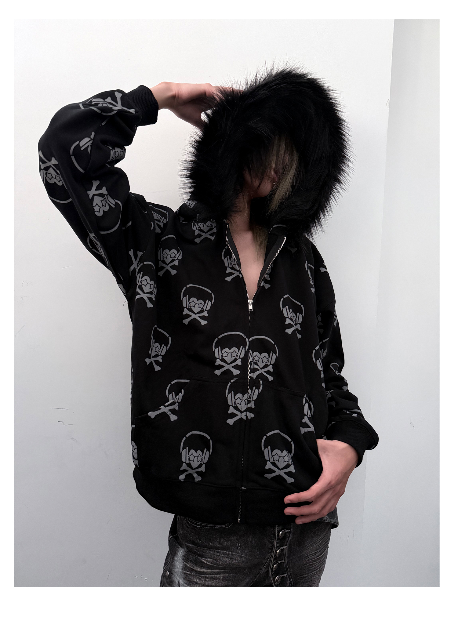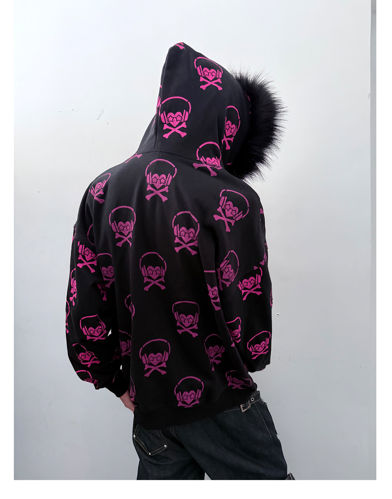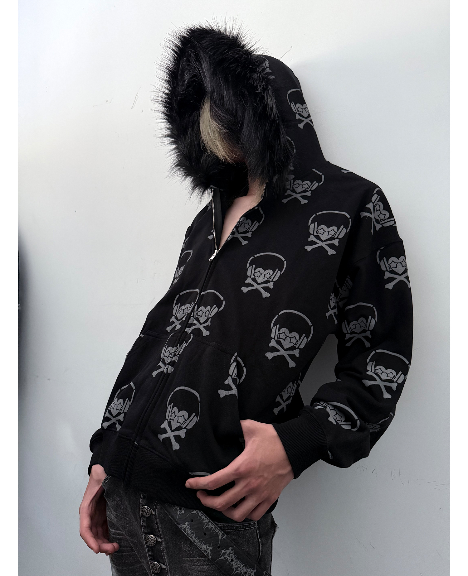 Headphone Skull Print Fake Fur Collar Zipper Hoodie WN20919