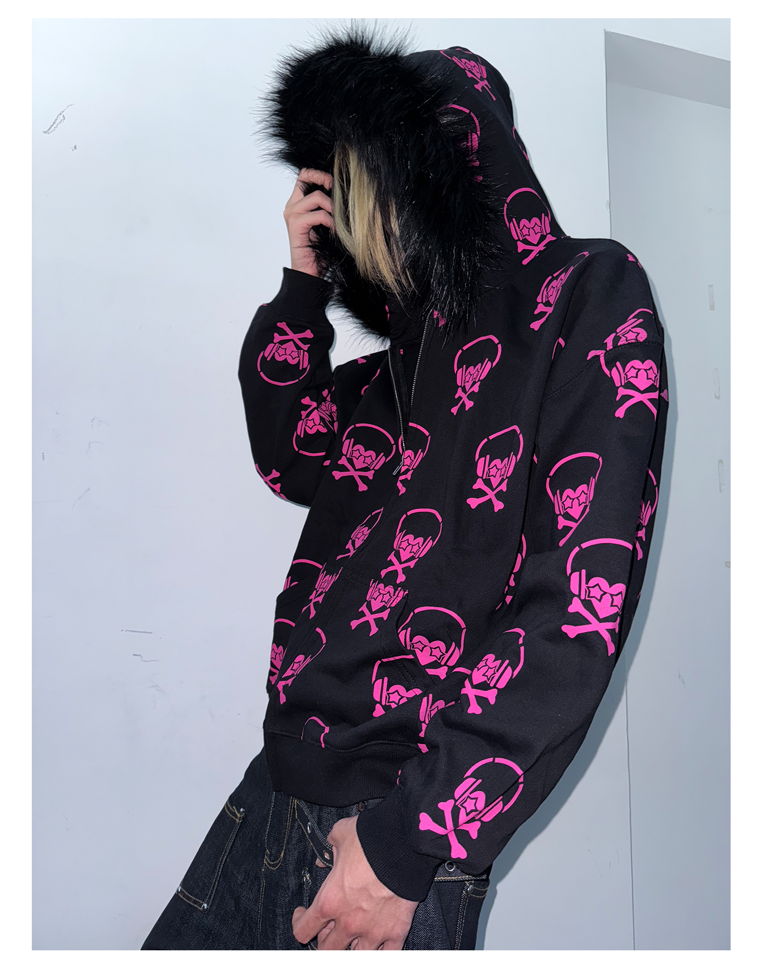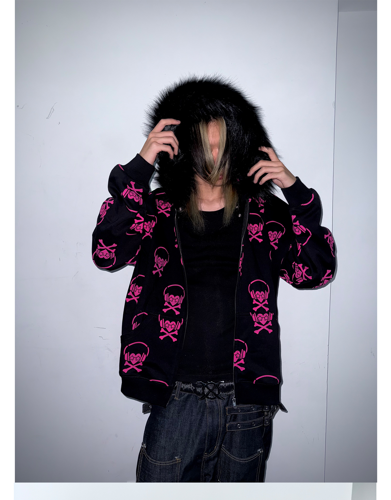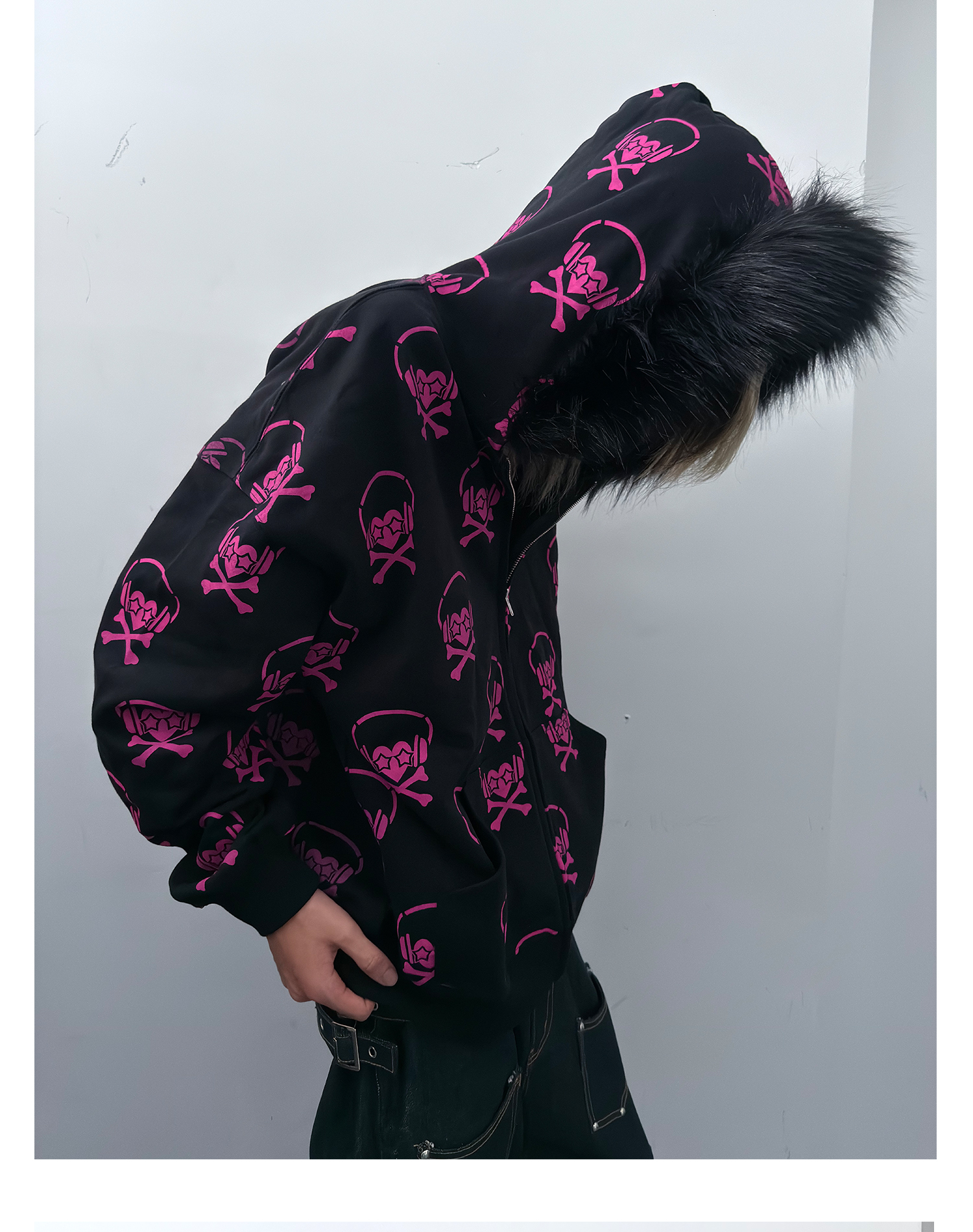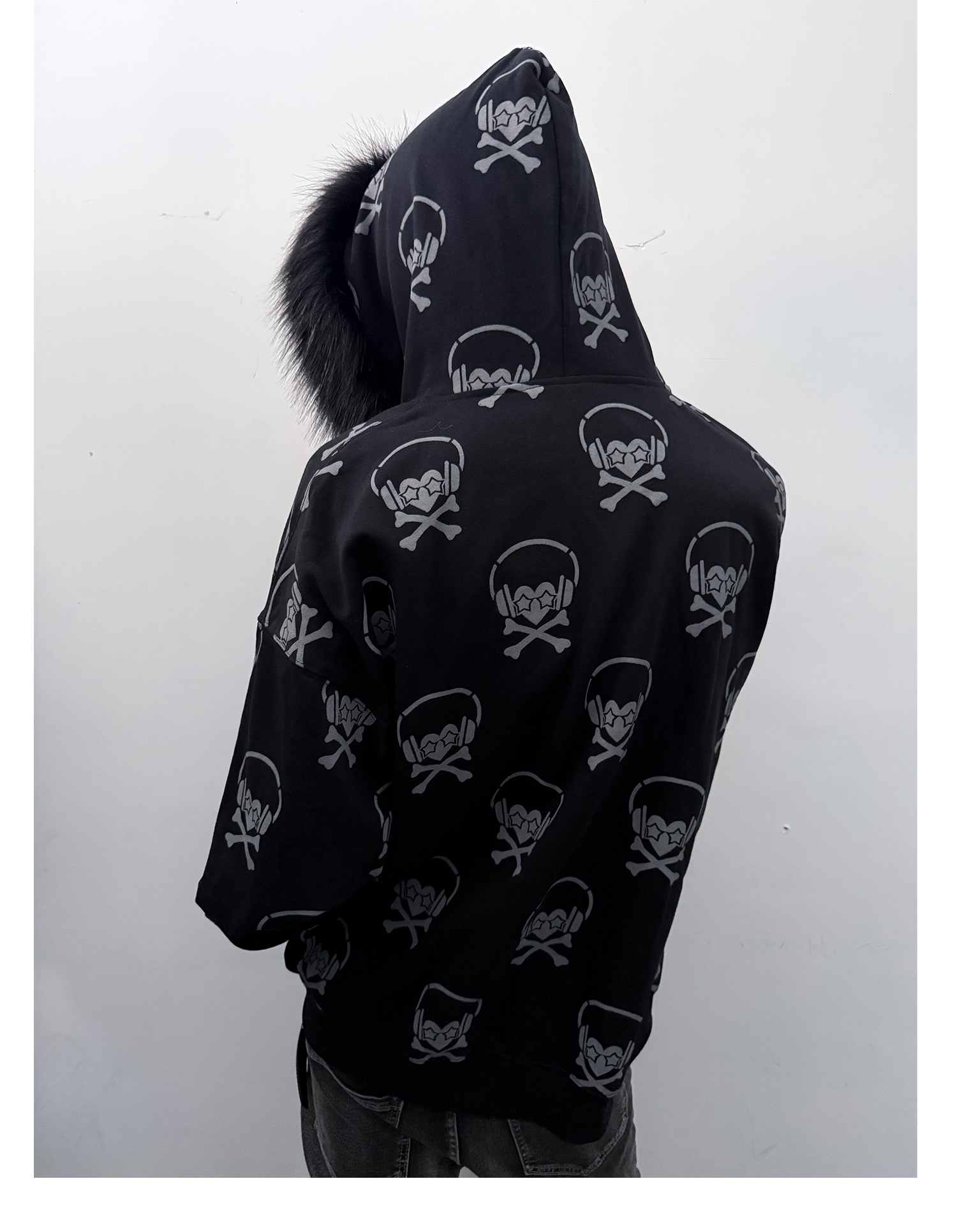 Headphone Skull Print Fake Fur Collar Zipper Hoodie WN20919
