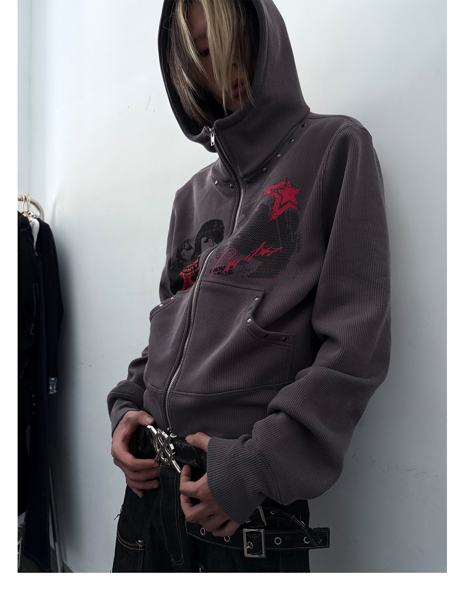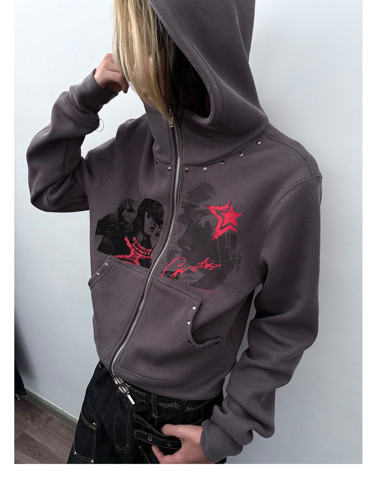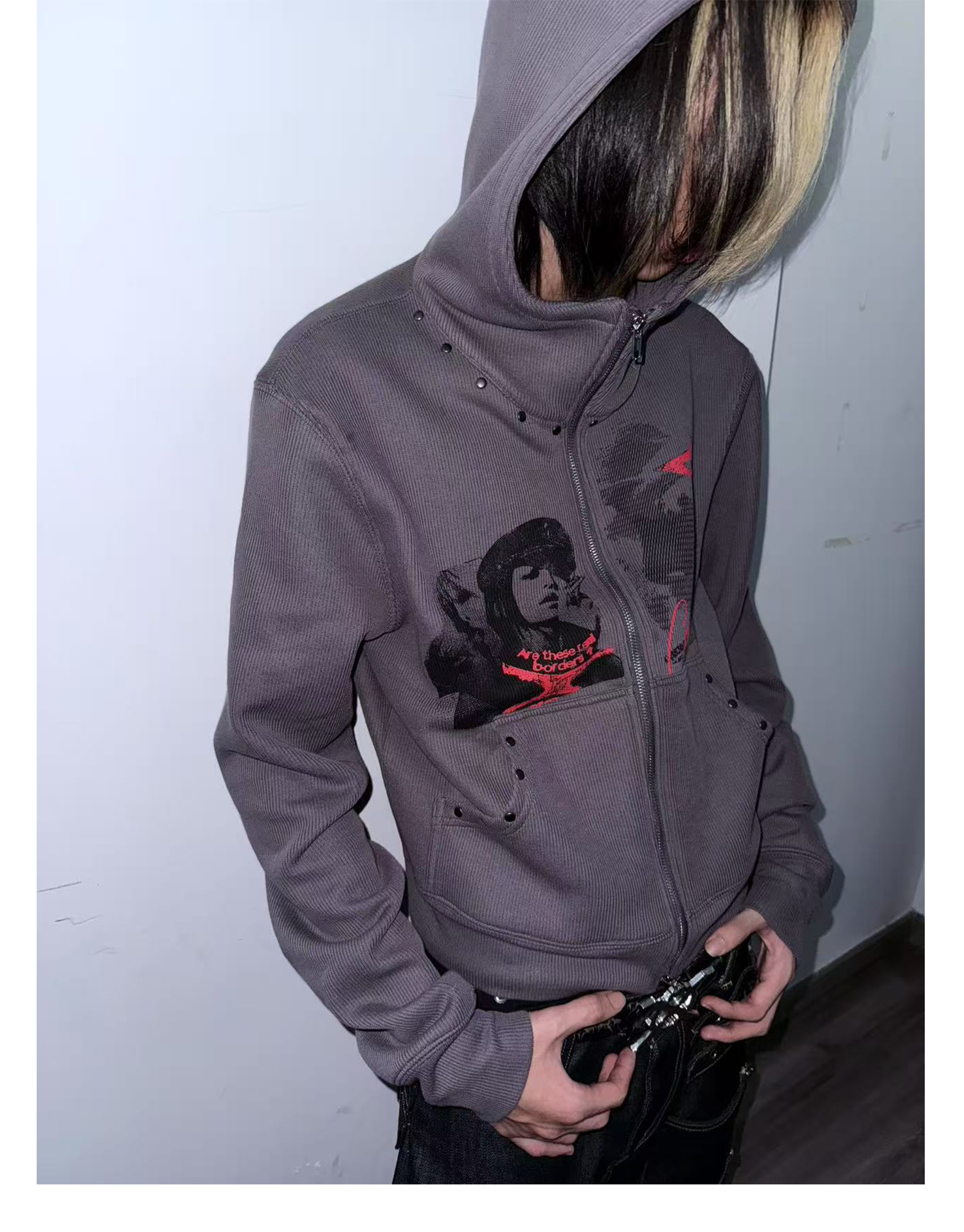 Studs Design Graphic Letter Zipper Hoodie WN20921