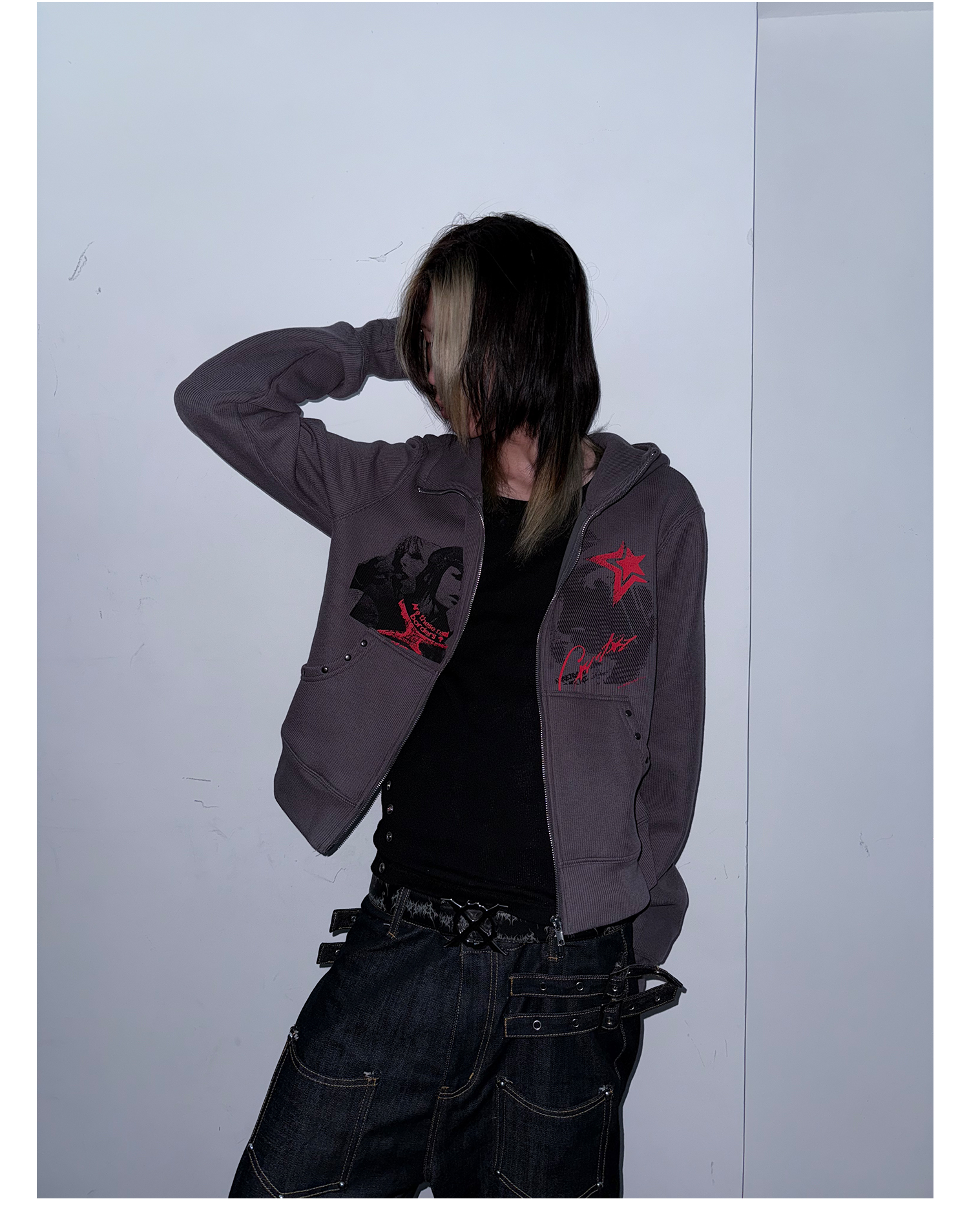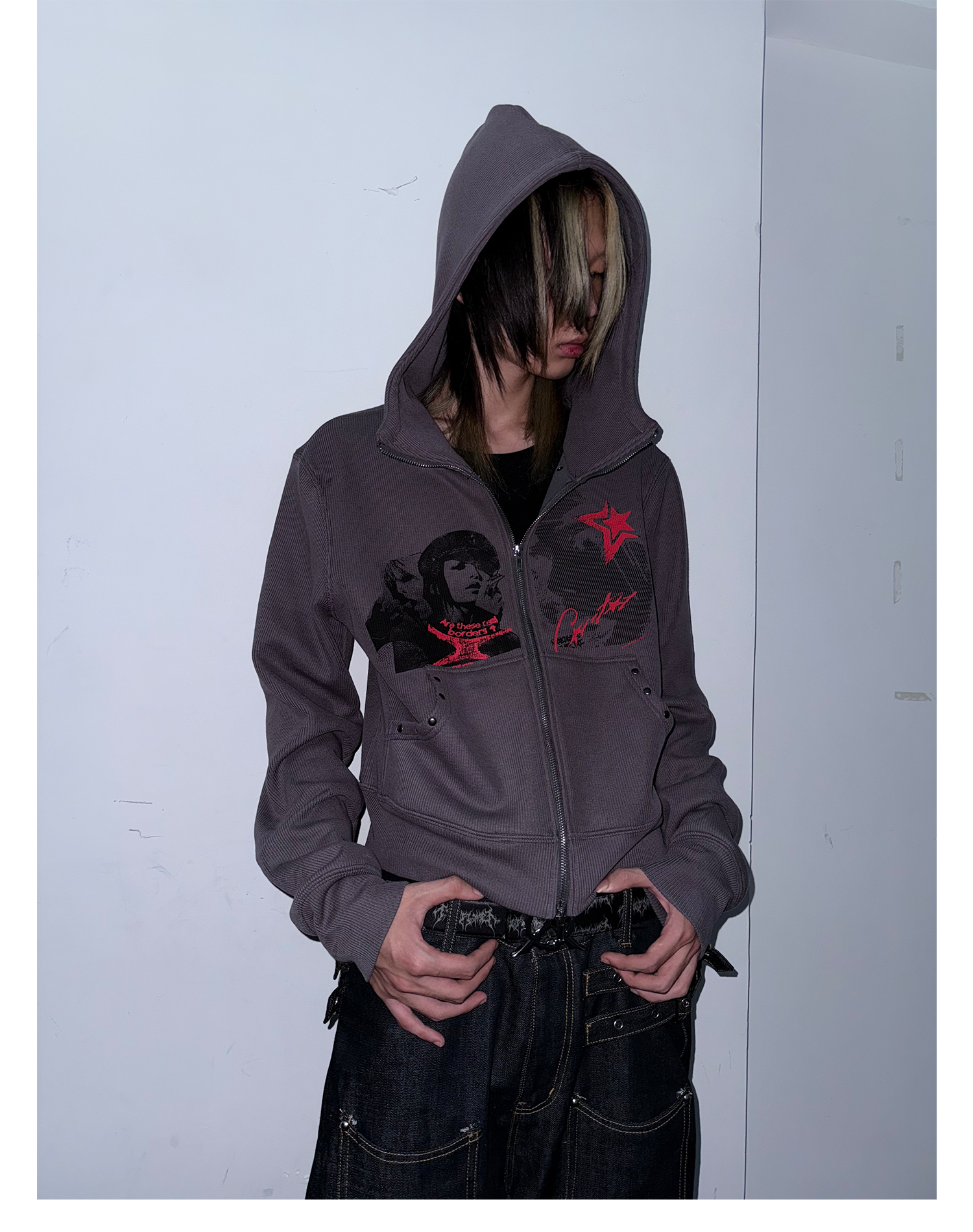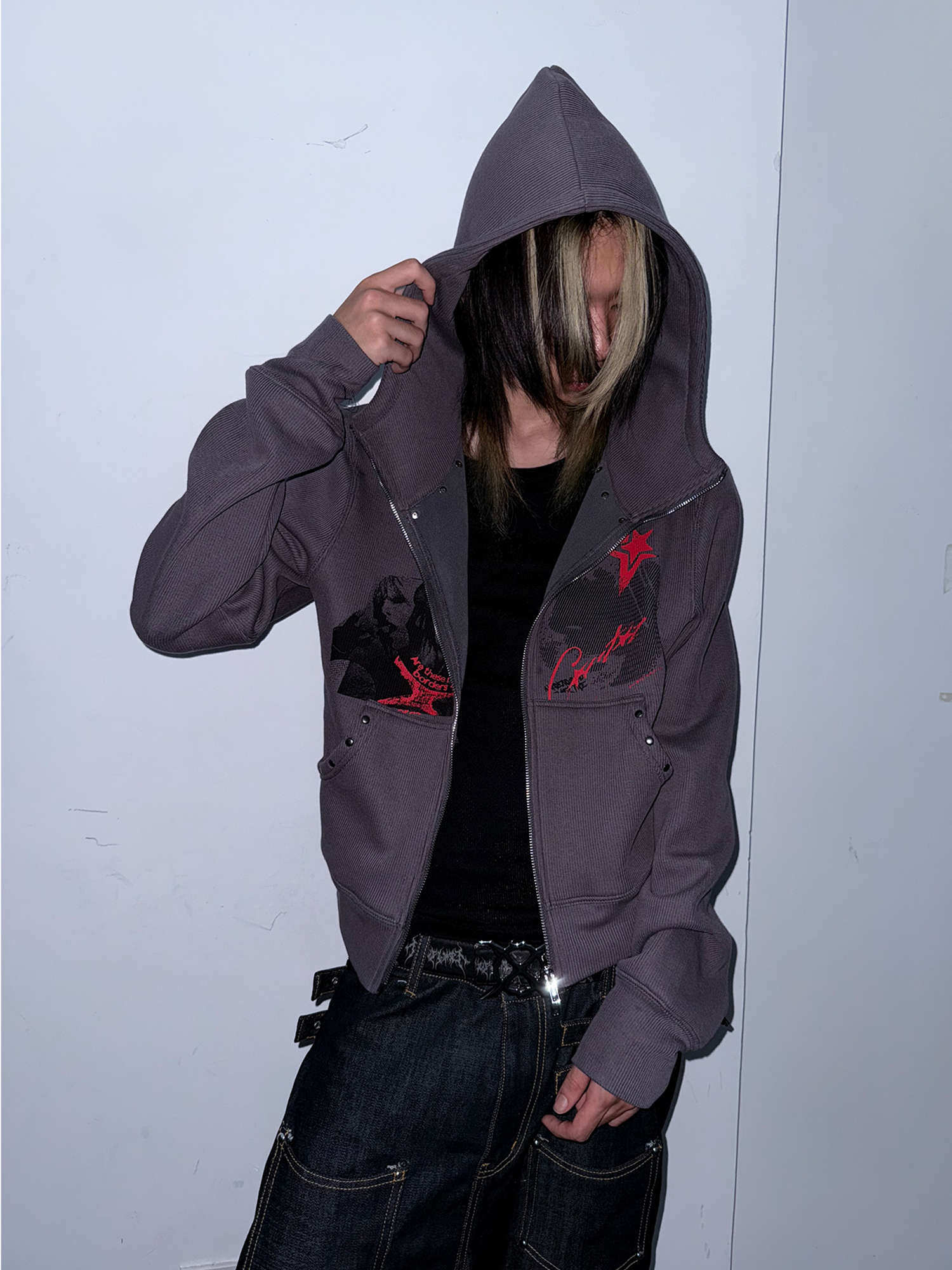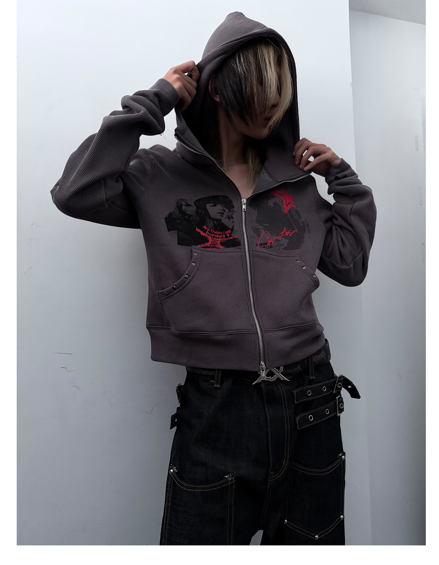 Studs Design Graphic Letter Zipper Hoodie WN20921
