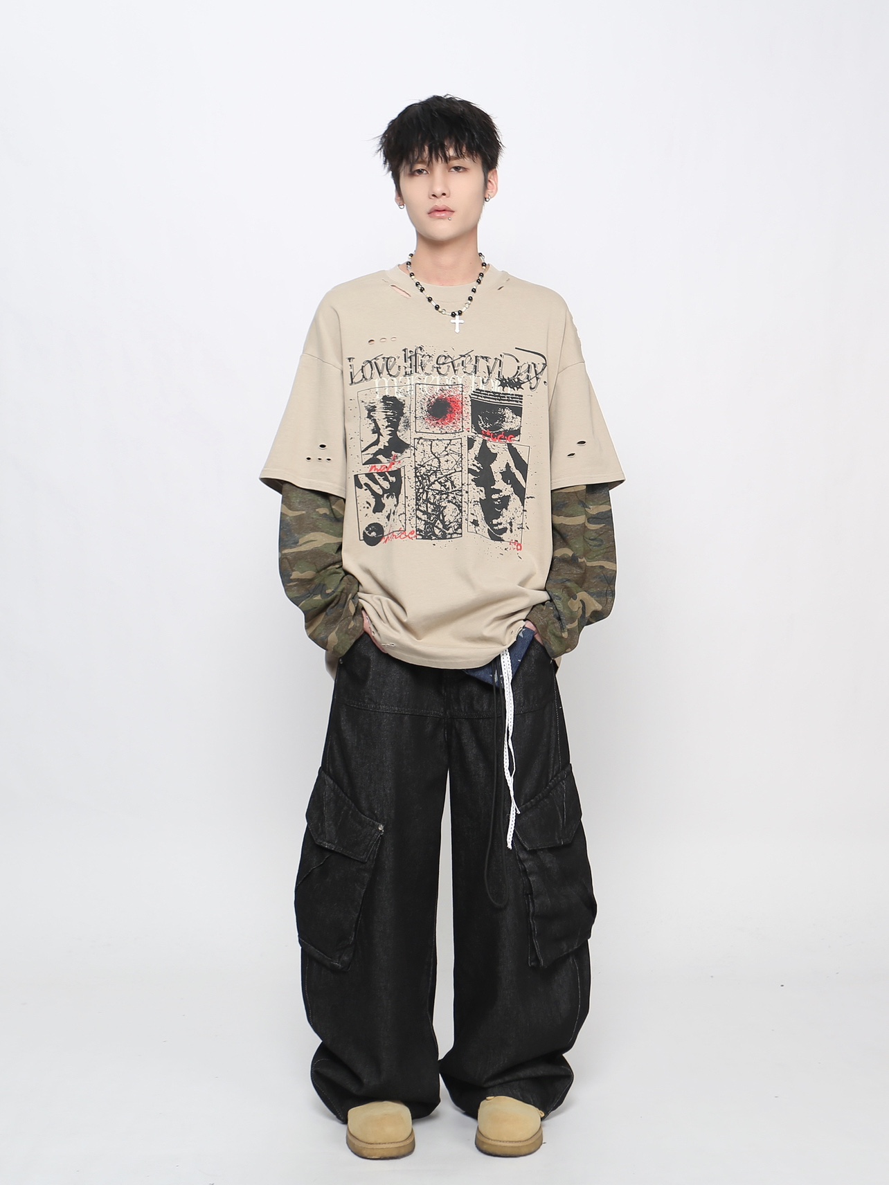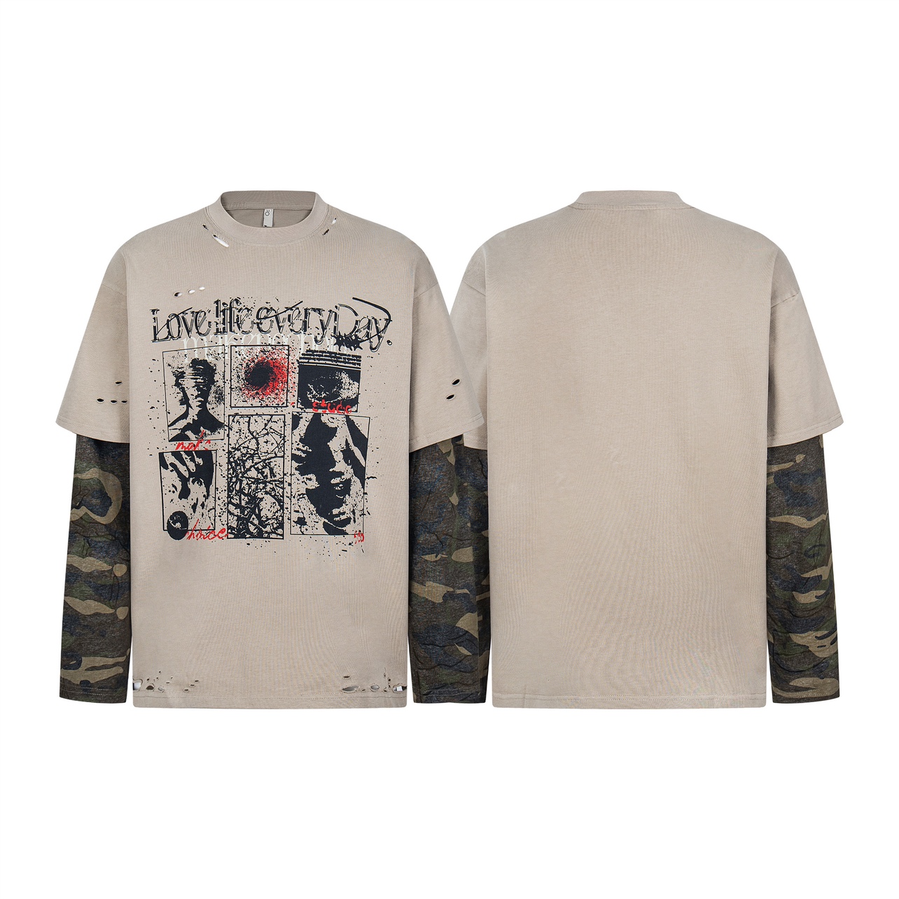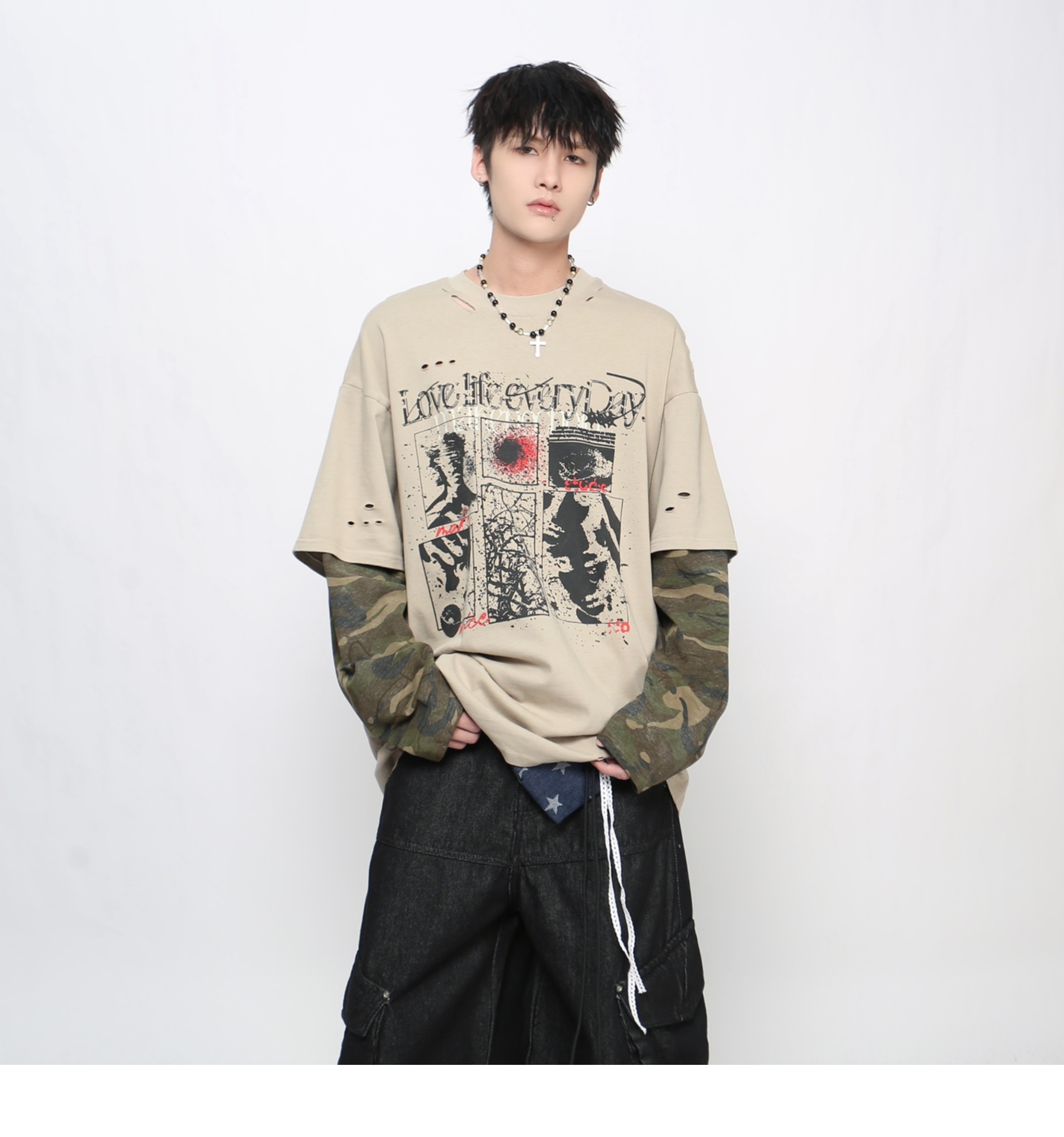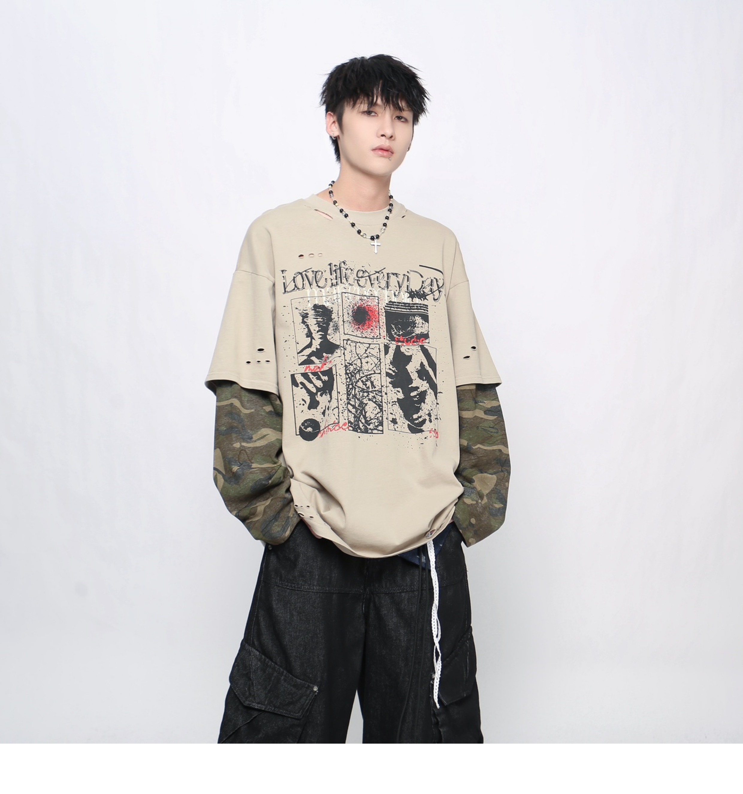 Camouflage Fake Layered Damage Hole Long Sleeve T-Shirt WN21037