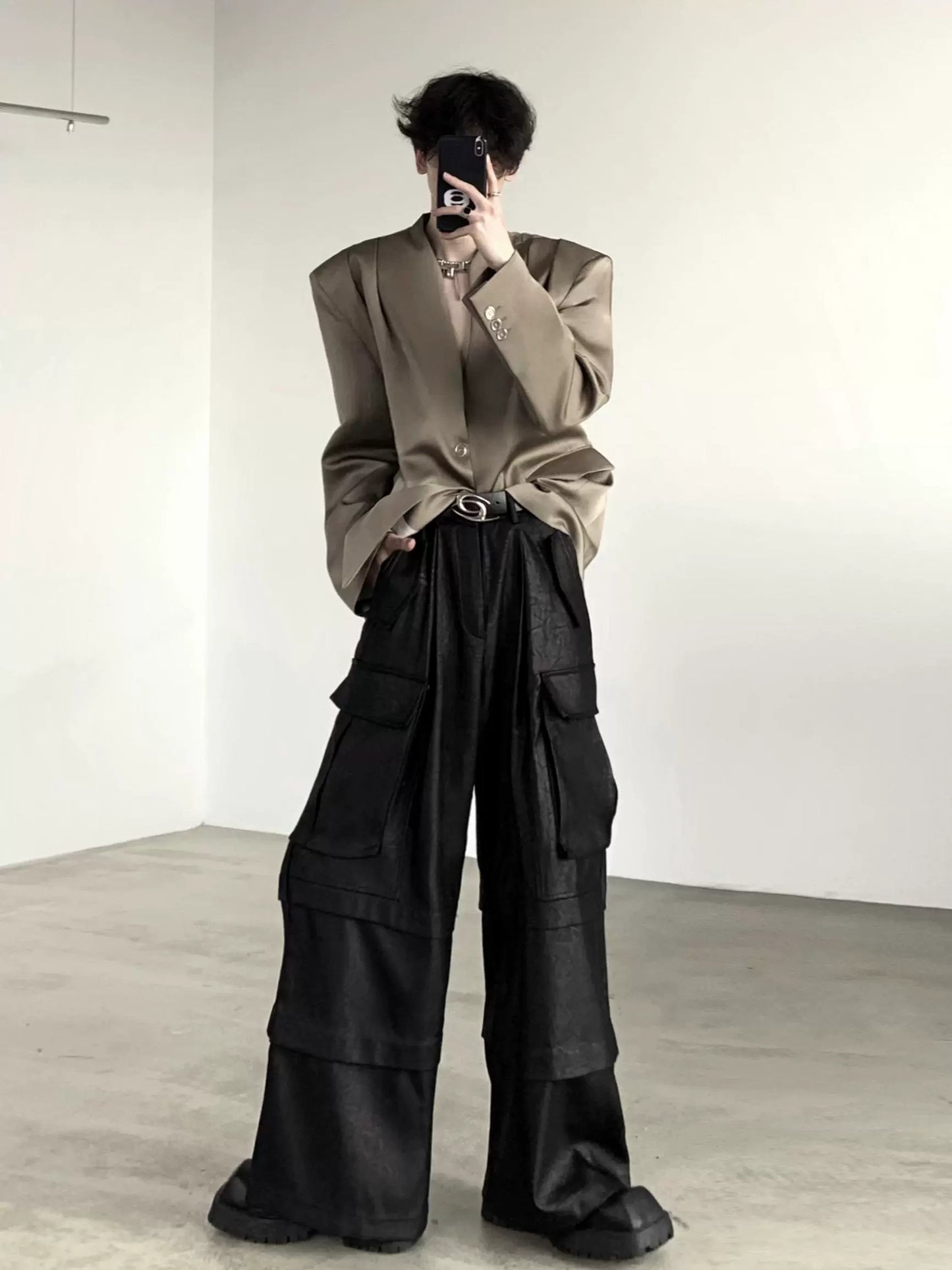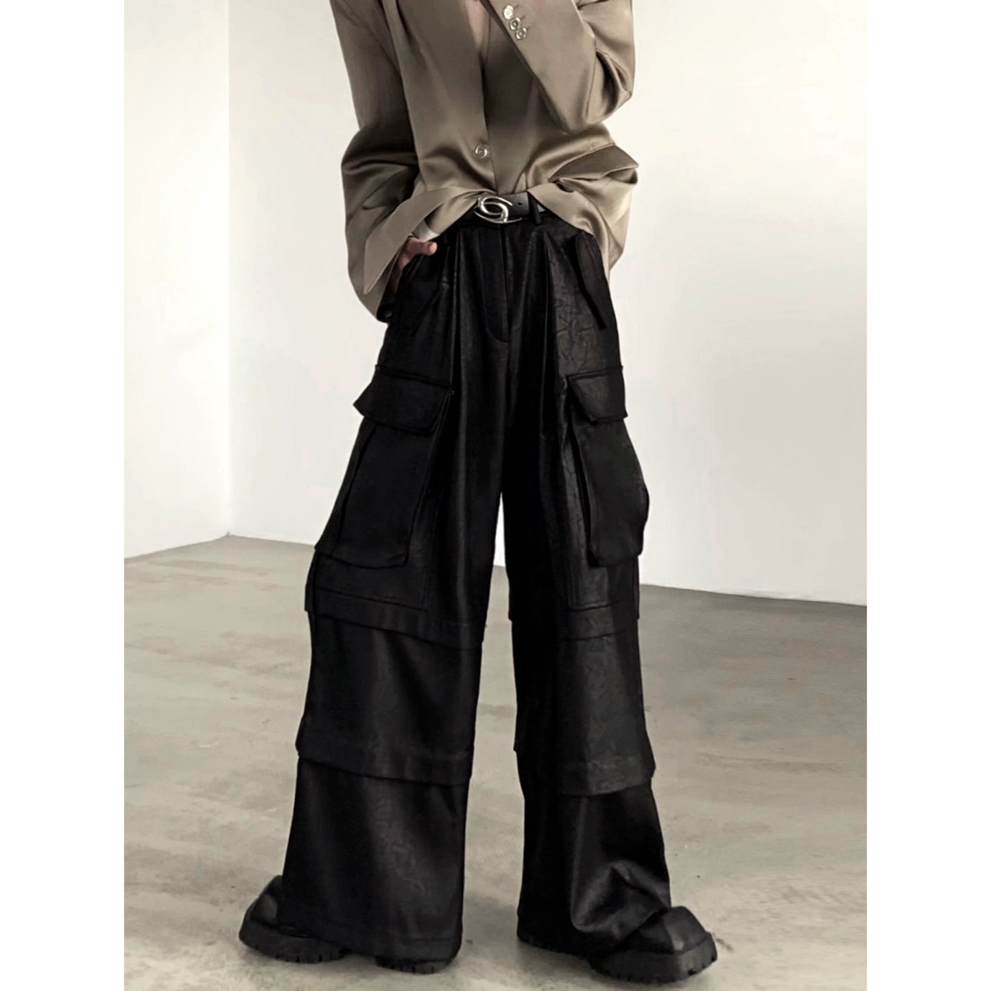 Pleates Wide-Leg PU Leather Cargo Pants WN9173