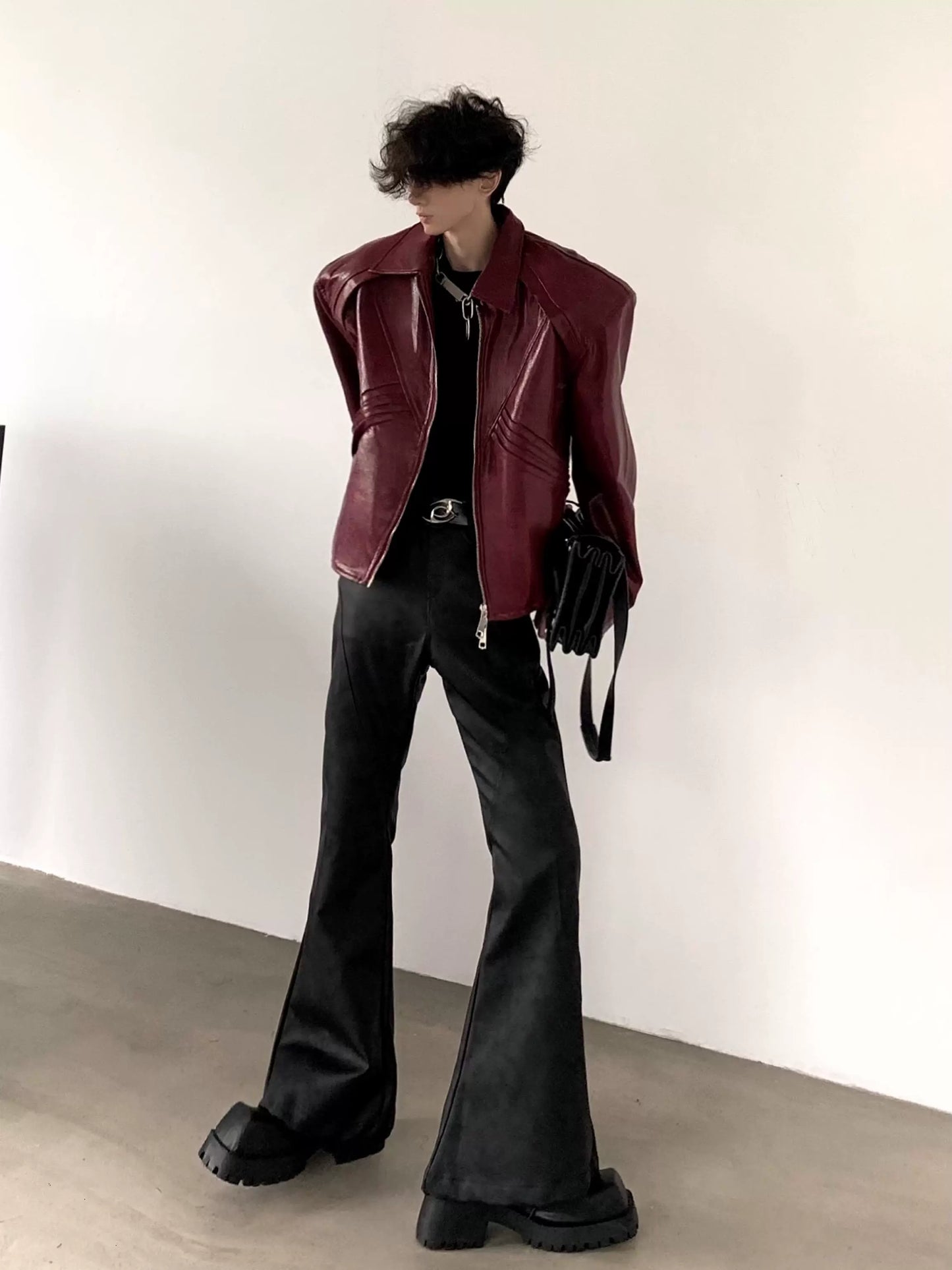 Shoulder Pad Wine Red PU Leather Jacket WN9180